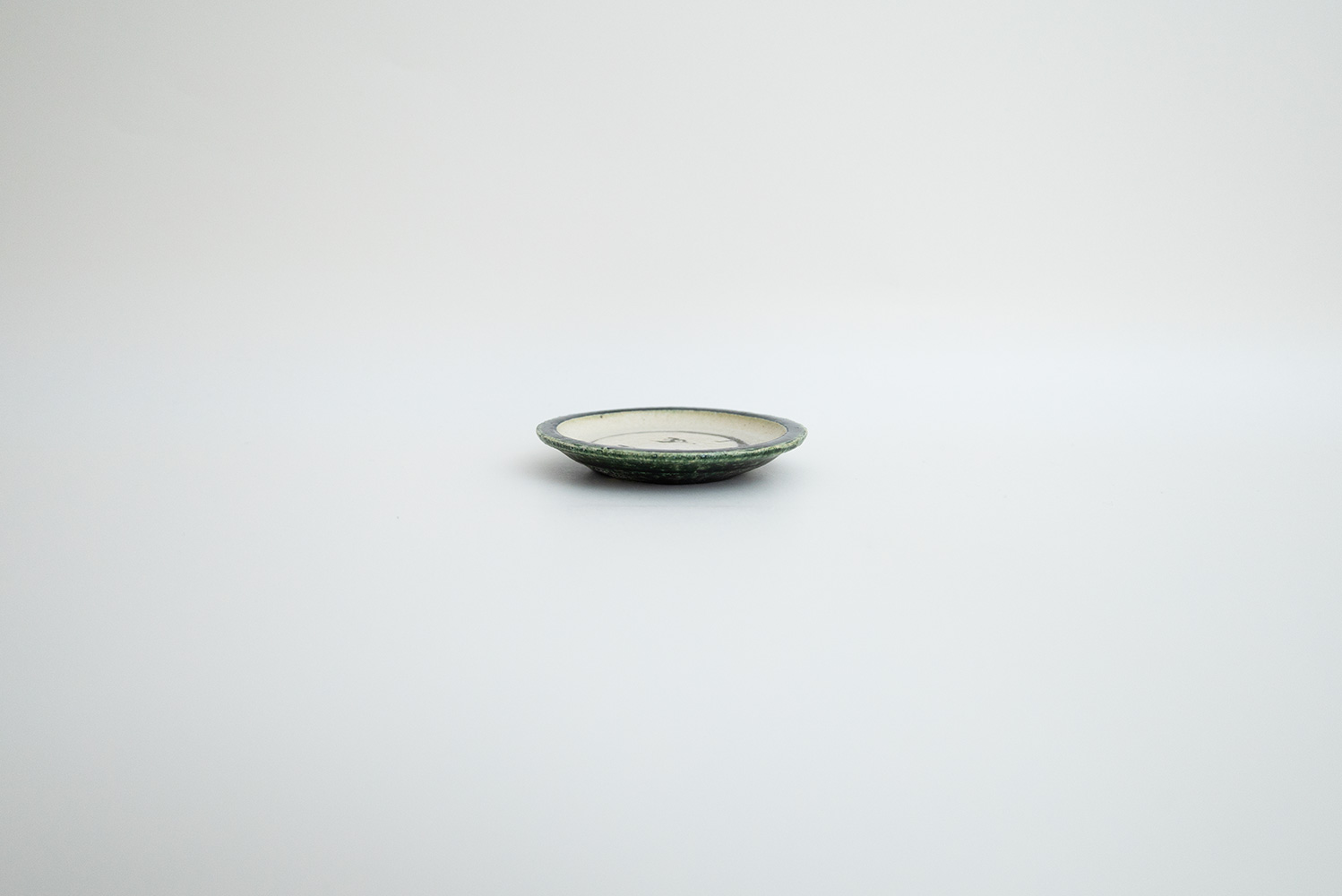 深い緑が美しい織部。一つ一つ丁寧に描かれた澤さんならではの絵柄と古典的な絵柄が見事に調和した豆皿です。