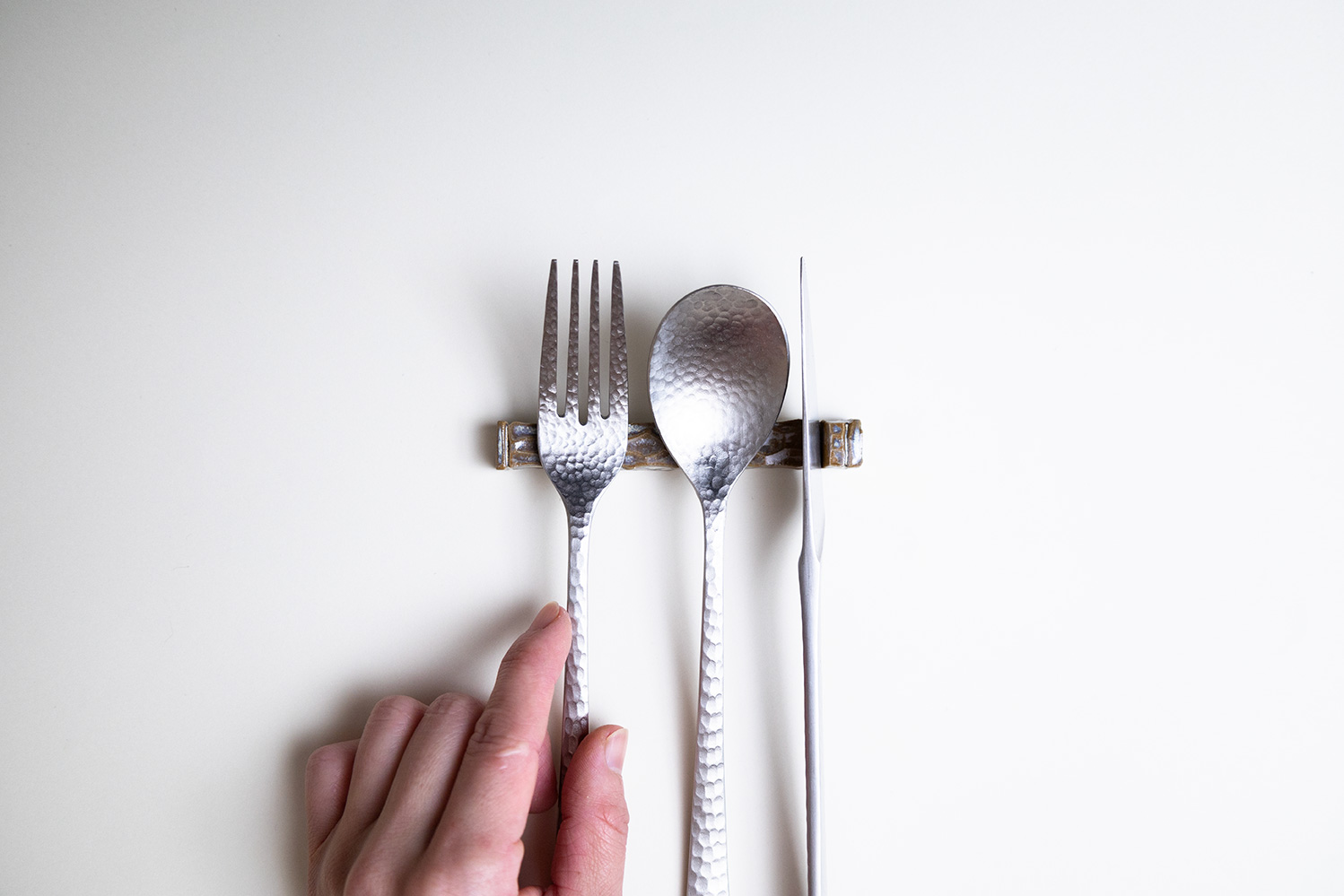 切り込み部分にナイフを立てて置けるという画期的なカトラリーレストです。スプーン、フォークと共に、ゆとりを持って3本置けるのは嬉しいですね。