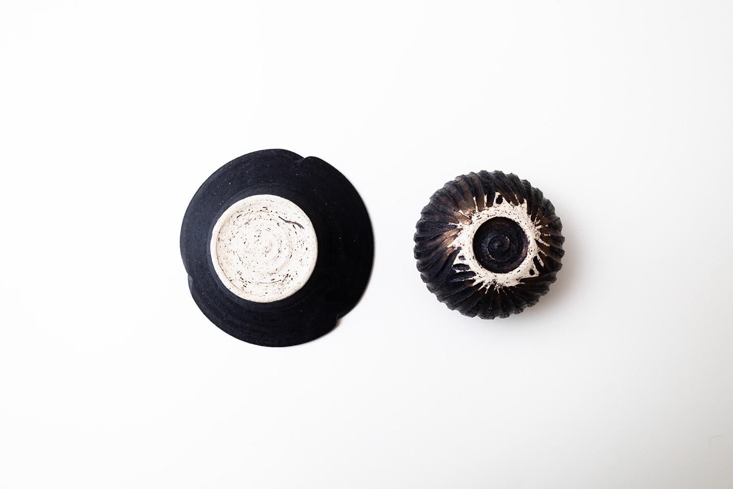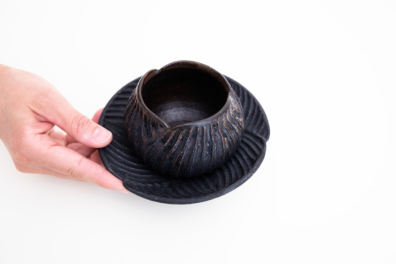 パオ&ユーポスのシルエットそのままに、しのぎで蕾を表現しています。やや青みのある引き締まった黒が特徴の「黒sabi」。「パオ」は中国語の読み方の「包」からイメージされているそうです。優しく包み込むような形を表現しています。ソーサーの「ユーポス」はその形がUFOに似ているとこから名付けられたそうです。夏はあんみつ、冬はぜんざいがとても似合うコロンとした可愛い器です。