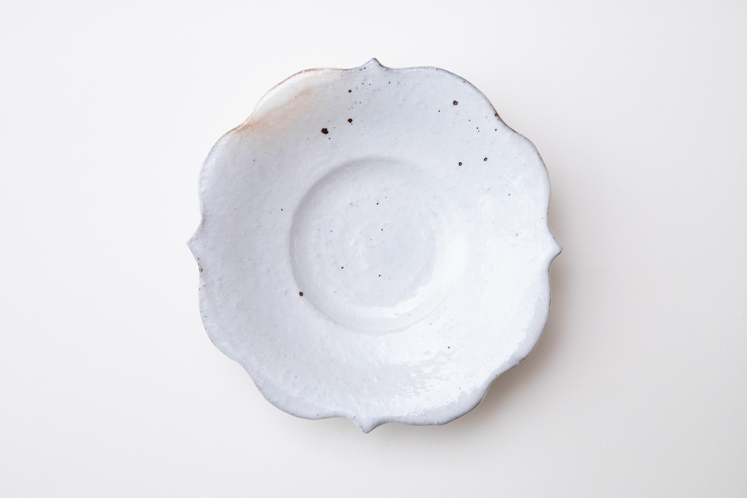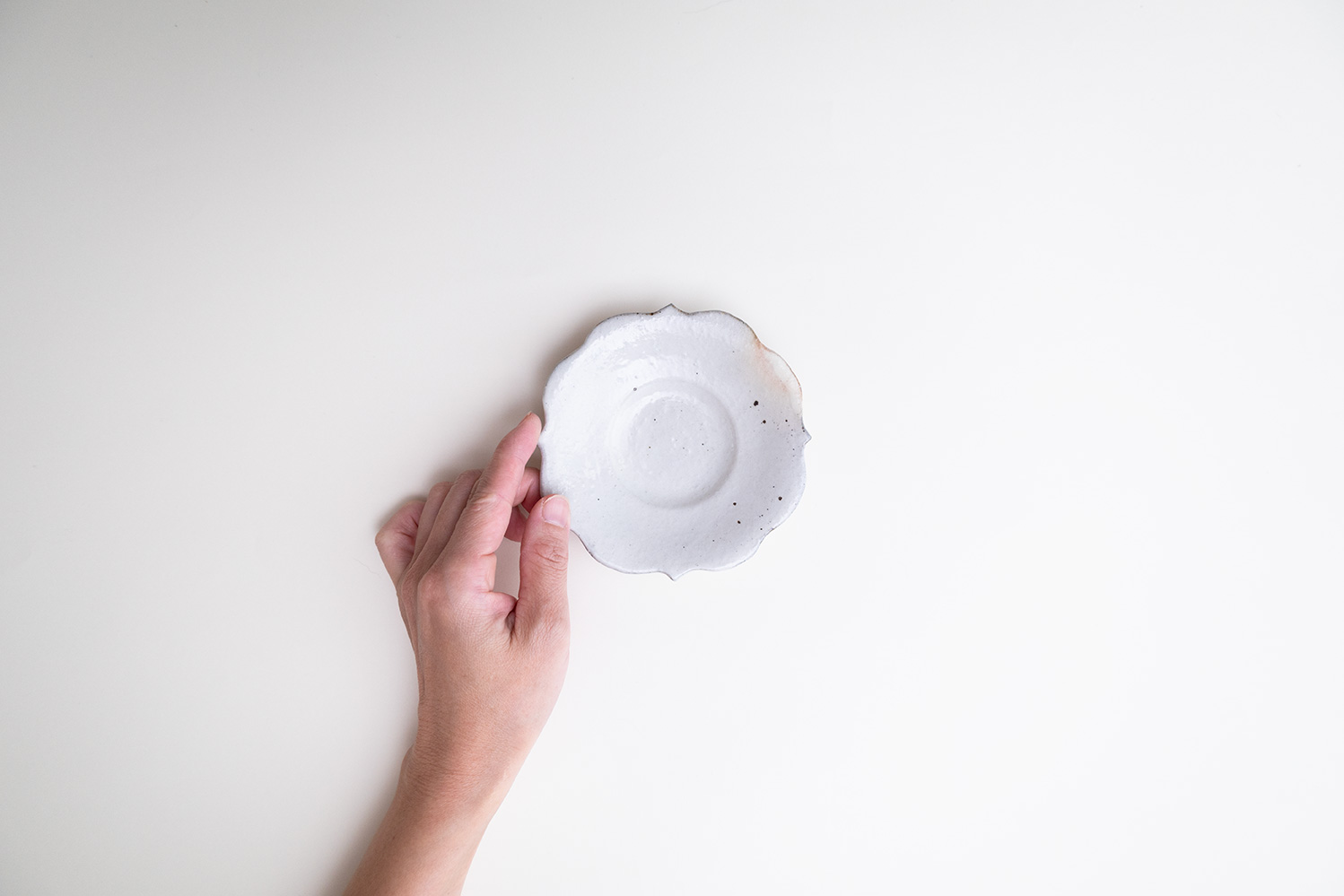 茶杯にピッタリの茶托です。一つ一つ丁寧にお皿の周りが彫り込んであります。菓子皿にしても良さそうですね。鉄散の器は、表面の下から優しく素朴な土味が見え隠れする深みのある白地に、敢えて加えた鉄の黒い粒々が程よいアクセントとなり、独特の趣を作り出しています。