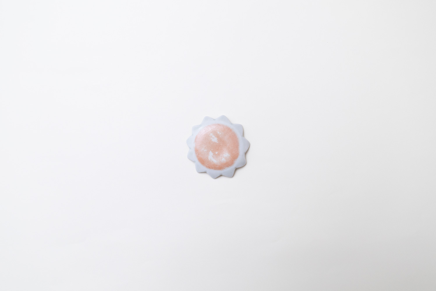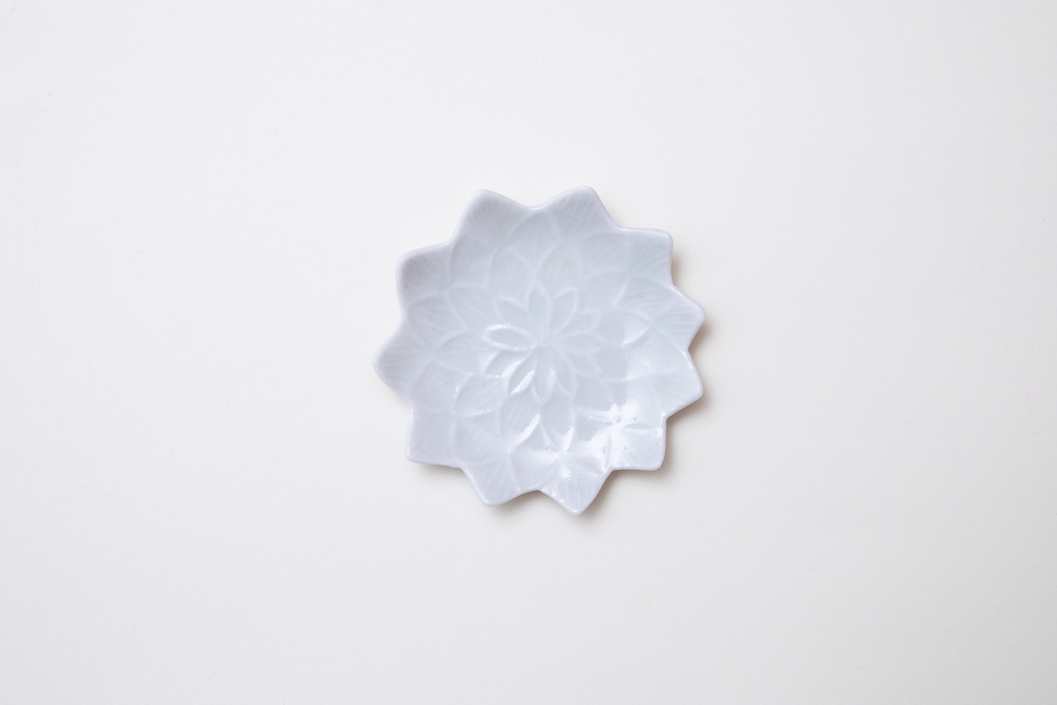 淡く透明感のある青緑色の灰青釉(はいせいゆう)にダリアの花を模した豆豆皿です。薬味皿や塩皿、箸置きなどにもお使いいただけます。