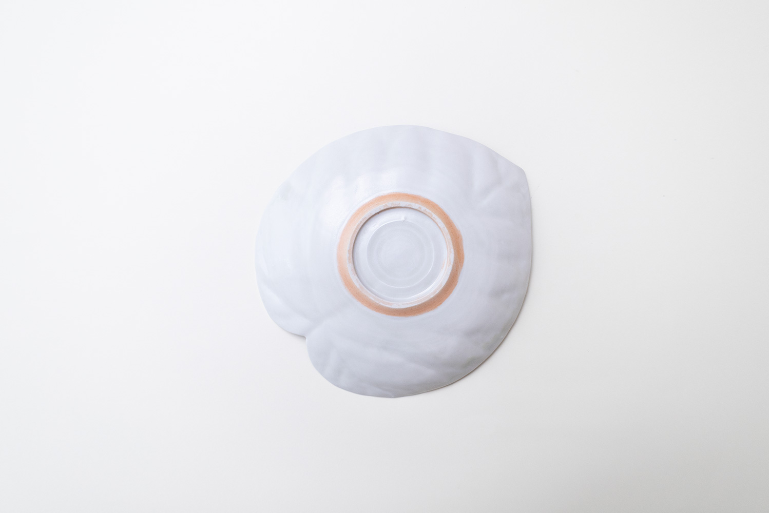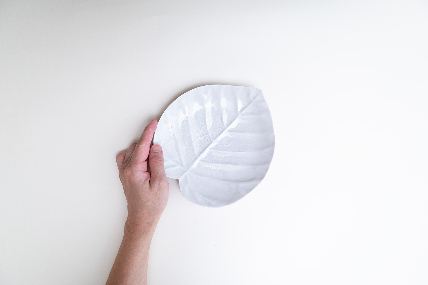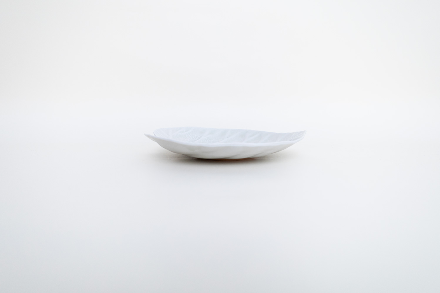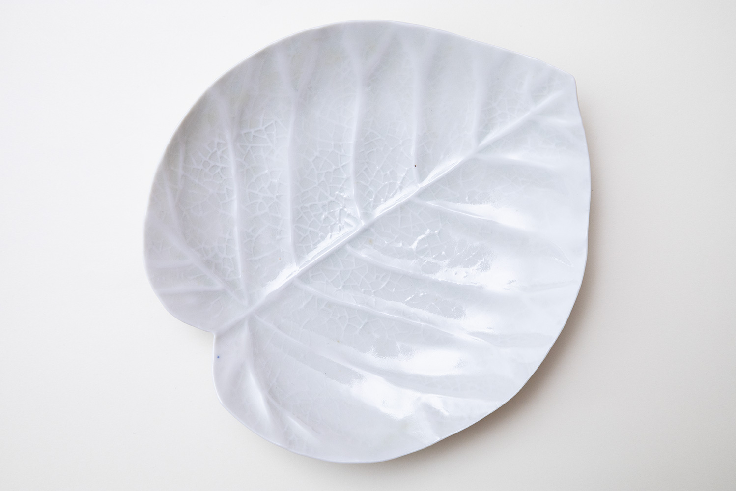 淡く透明感のある青緑色の灰青釉(はいせいゆう)に浮かび上がる葉脈はまるで本物の葉のようです。葉脈模様にできる釉溜まりがとても美しい器です。
