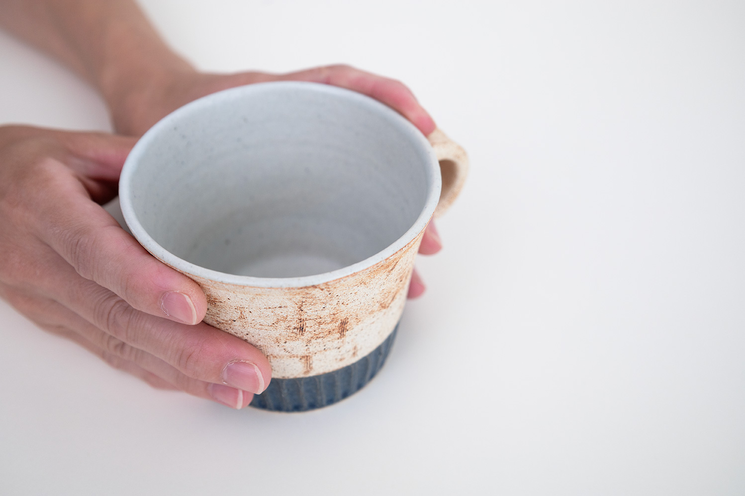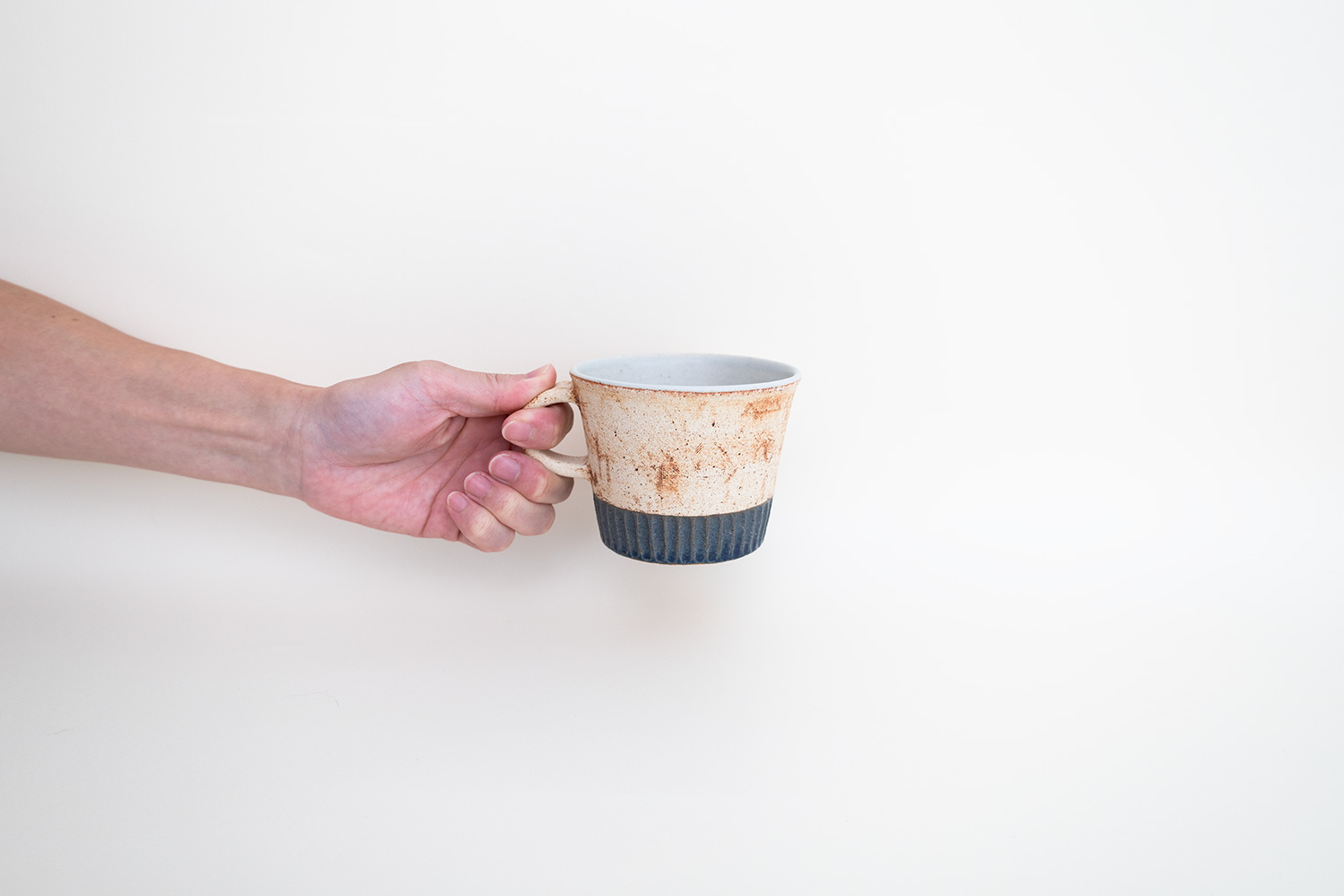 中川さんの代表的な作風のコルクと同じ素地に、しのぎと釉薬で色分けされた手の込んだマグカップです。