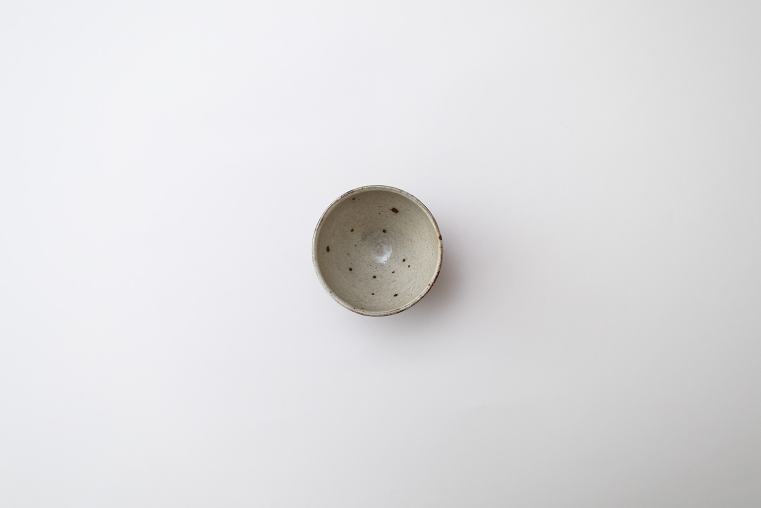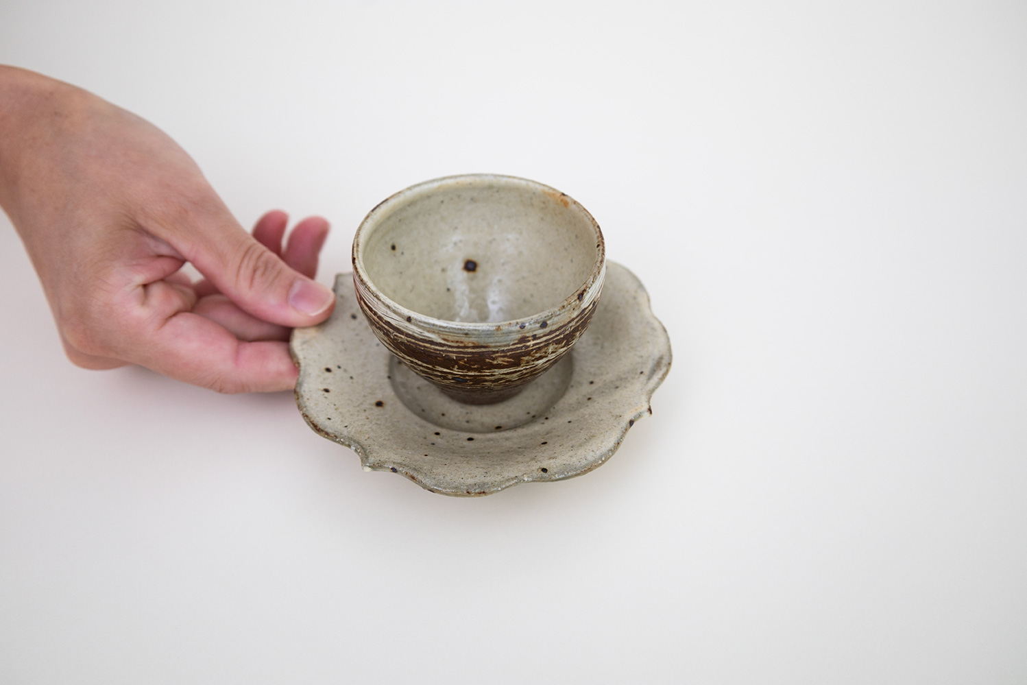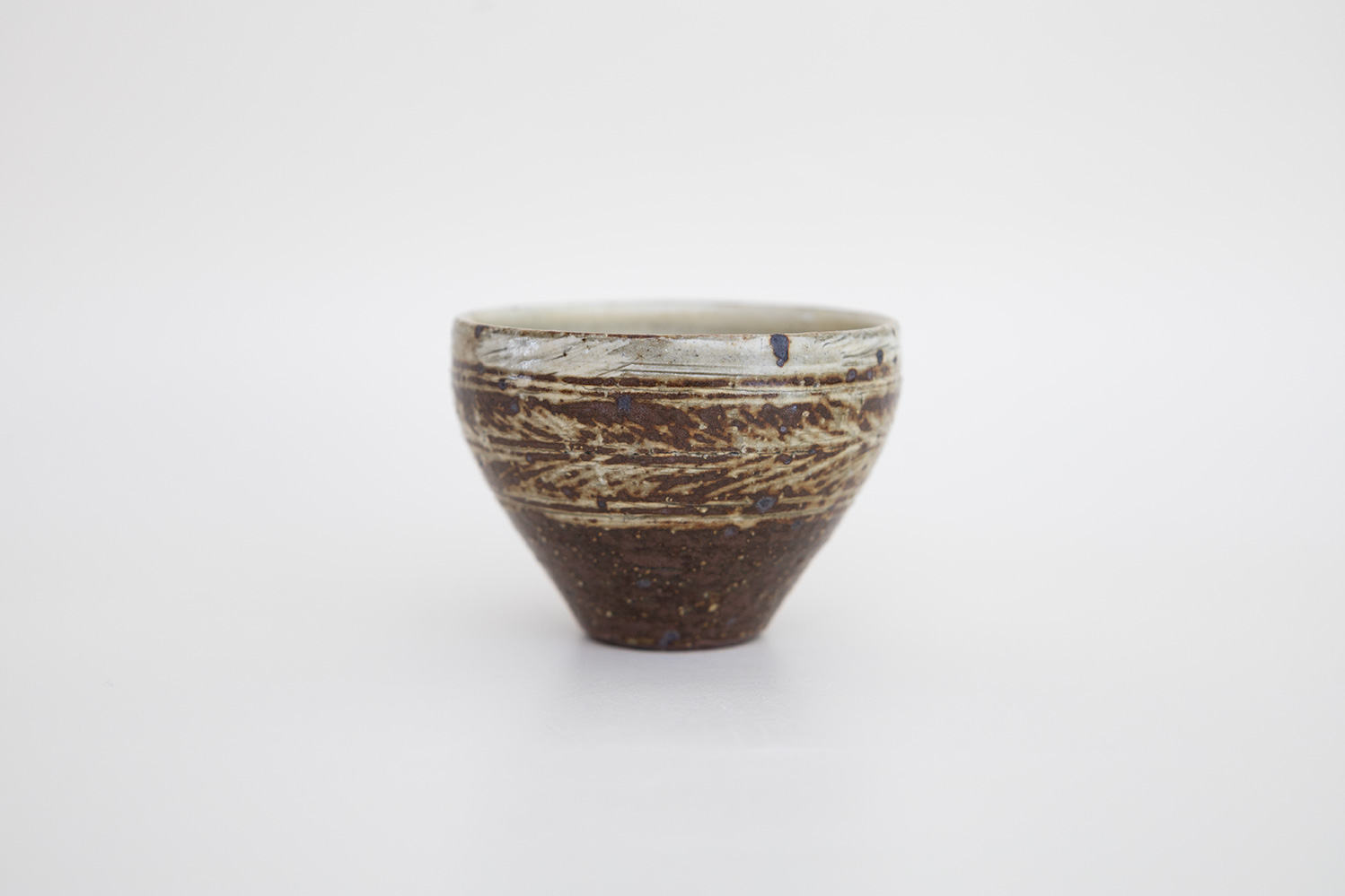 小ぶりなサイズが上品で可愛らしい茶杯です。鎬の部分に釉薬を掛けて拭き取り柄を出す三島手の技法により温かみのある趣深い表情となっています。