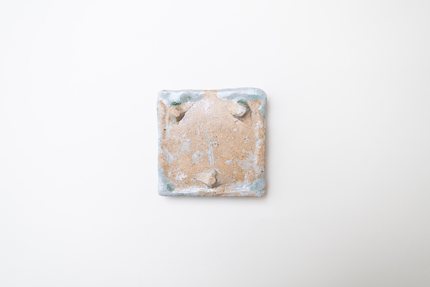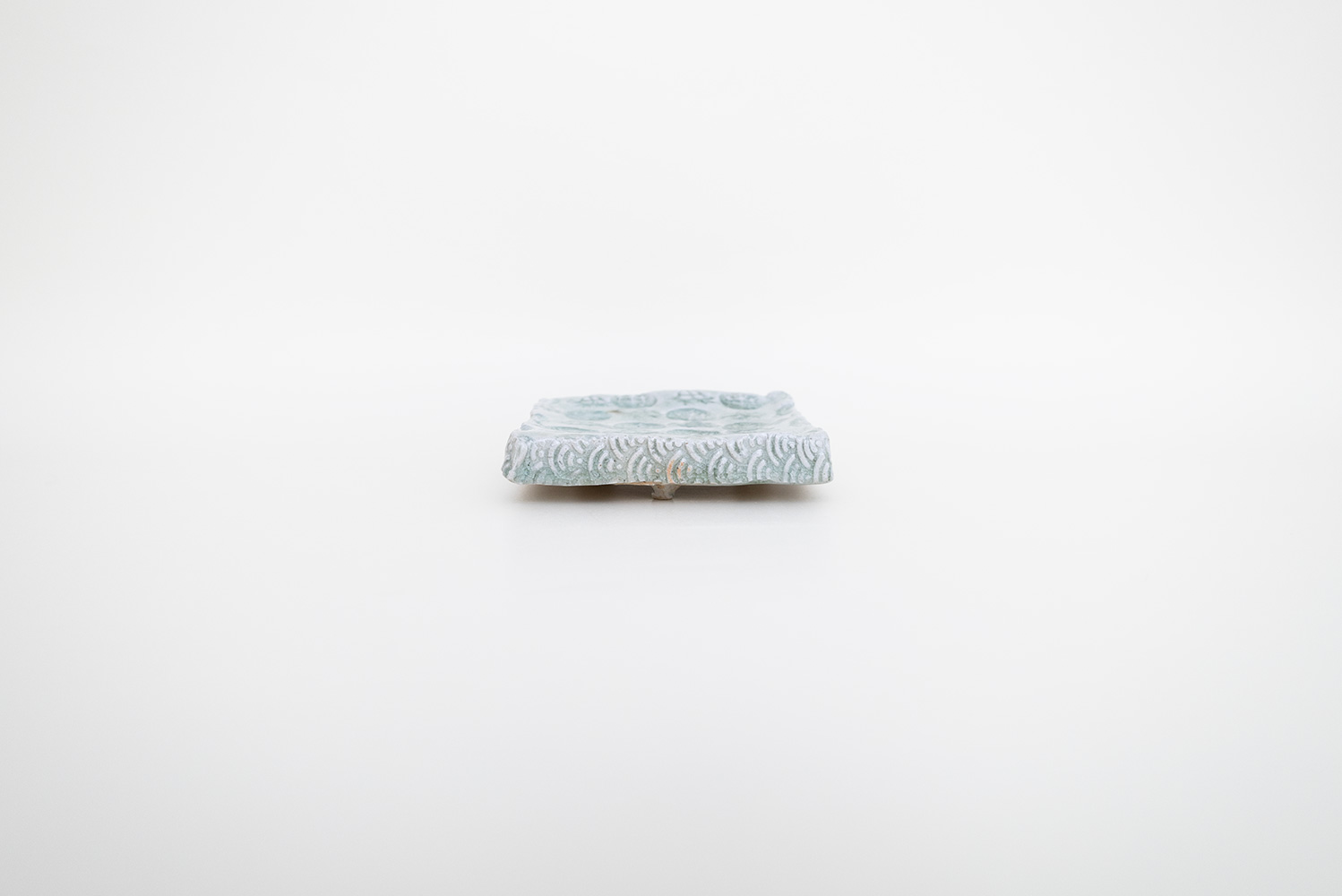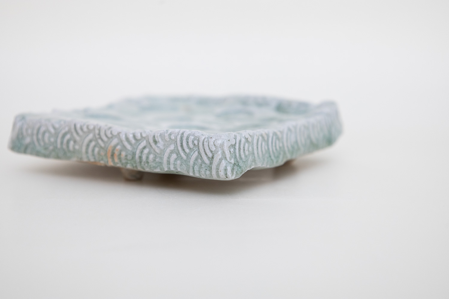 土はご自宅の畑から、湧き水を思わせる淡い水色の釉薬は薪ストーブの灰からと身近なものから生み出される美しいもの。自然が美しく感じることと同じように穏やかに心に染み込む器です。陰刻と陽刻で押された柄の陰影が奥行きのある表情を見せてくれます。
