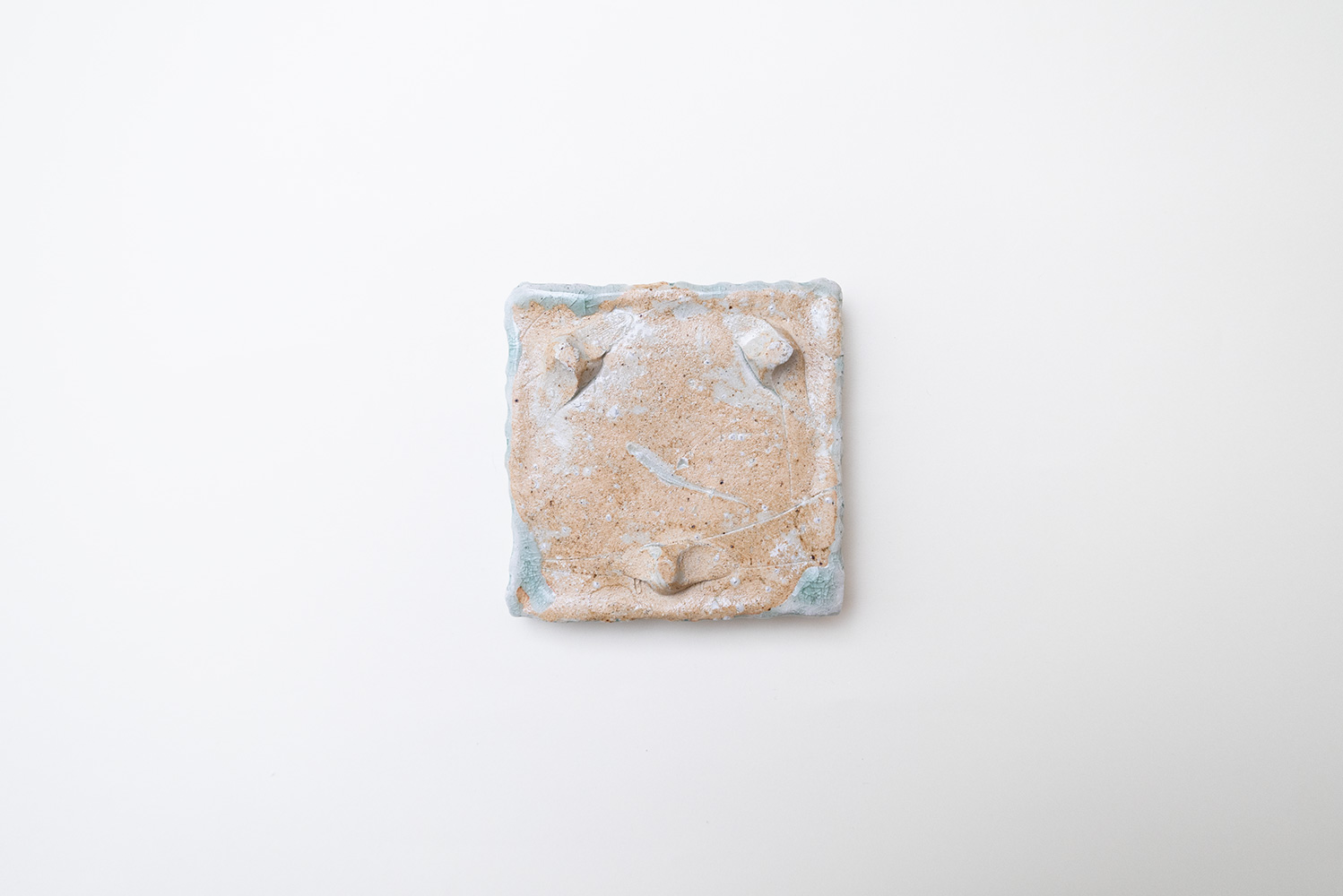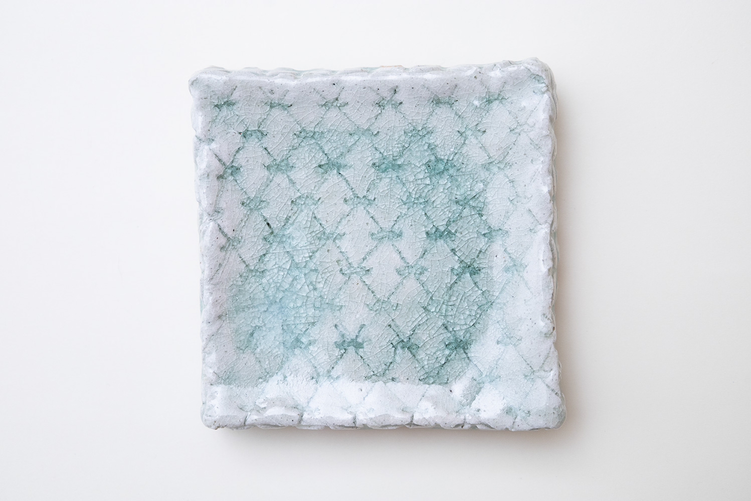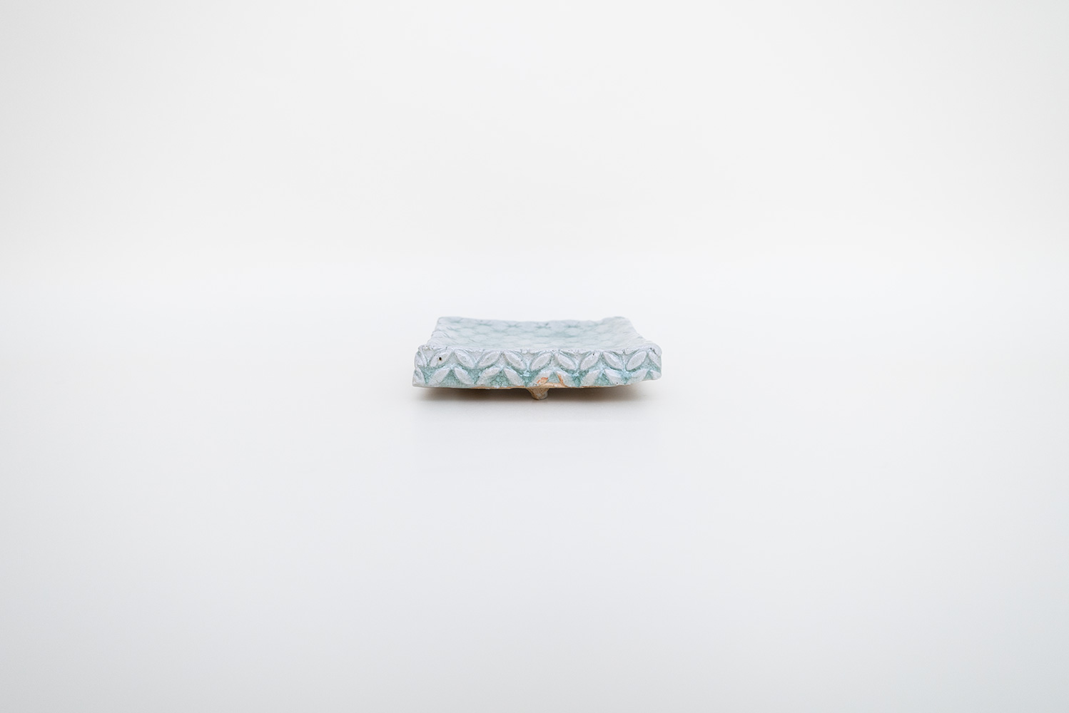 土はご自宅の畑から、湧き水を思わせる淡い水色の釉薬は薪ストーブの灰からと身近なものから生み出される美しいもの。自然が美しく感じることと同じように穏やかに心に染み込む器です。陰刻と陽刻で押された柄の陰影が奥行きのある表情を見せてくれます。