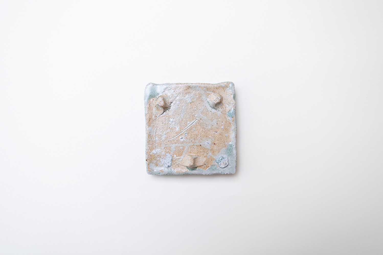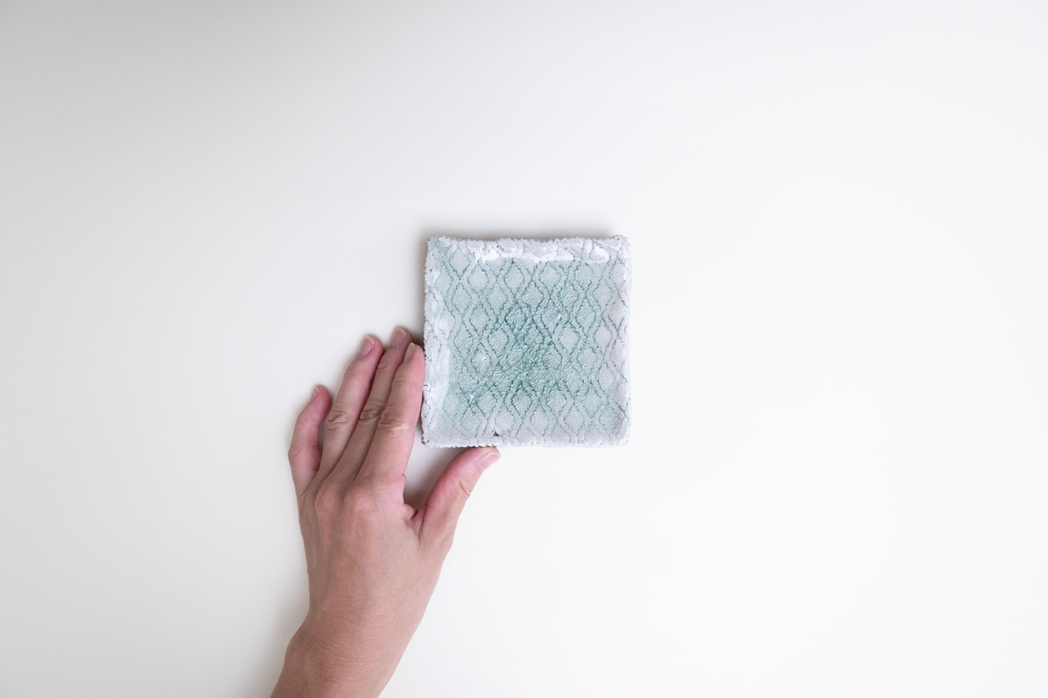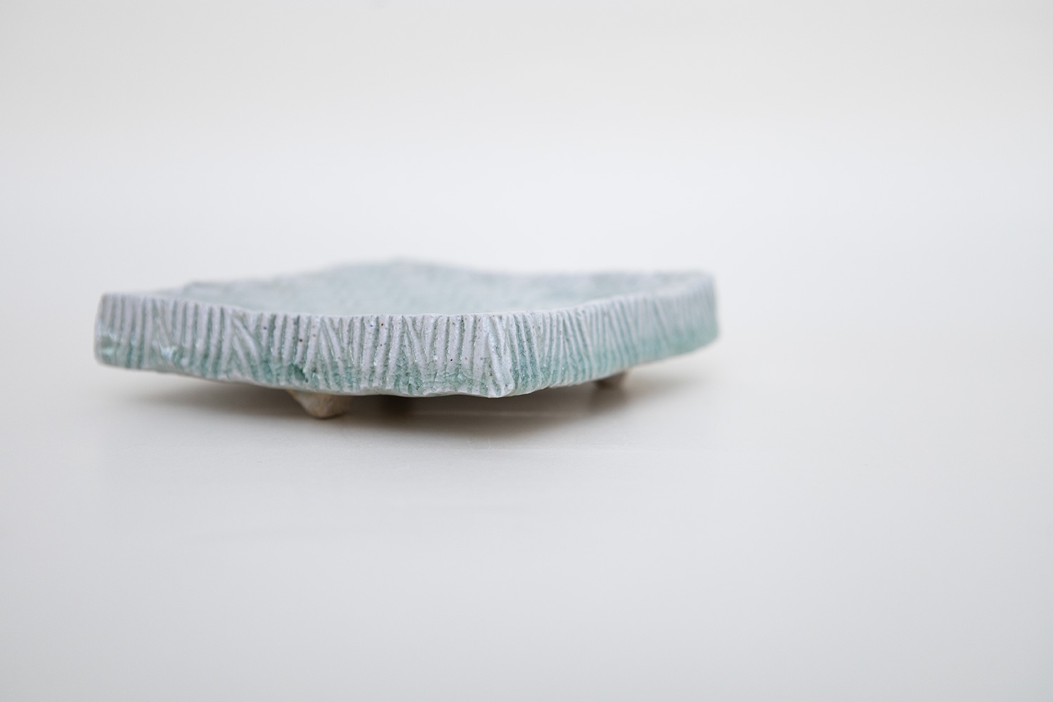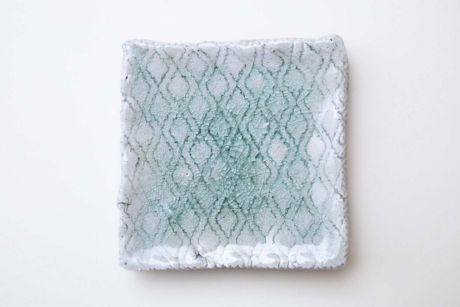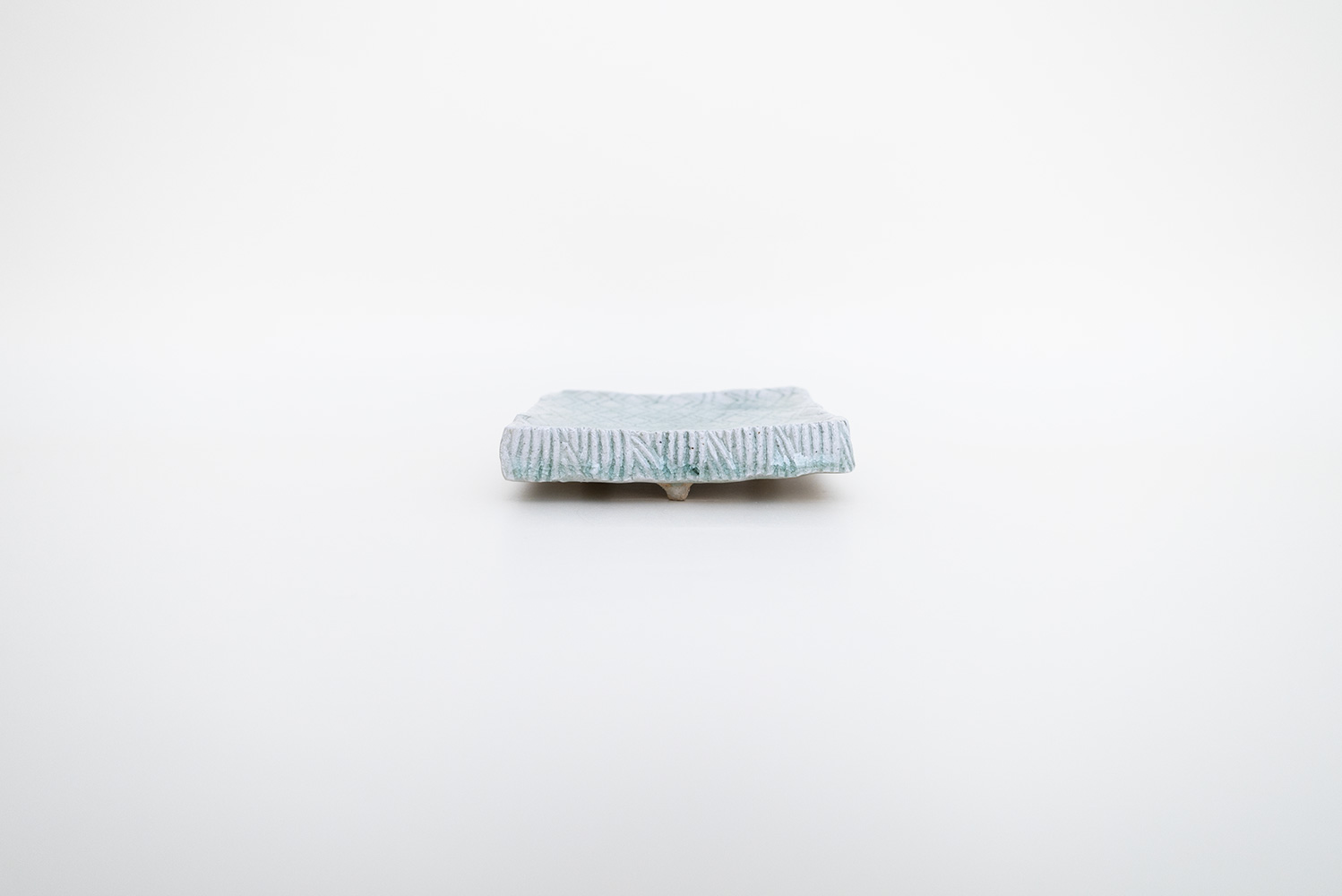 土はご自宅の畑から、湧き水を思わせる淡い水色の釉薬は薪ストーブの灰からと身近なものから生み出される美しいもの。自然が美しく感じることと同じように穏やかに心に染み込む器です。陰刻と陽刻で押された柄の陰影が奥行きのある表情を見せてくれます。
