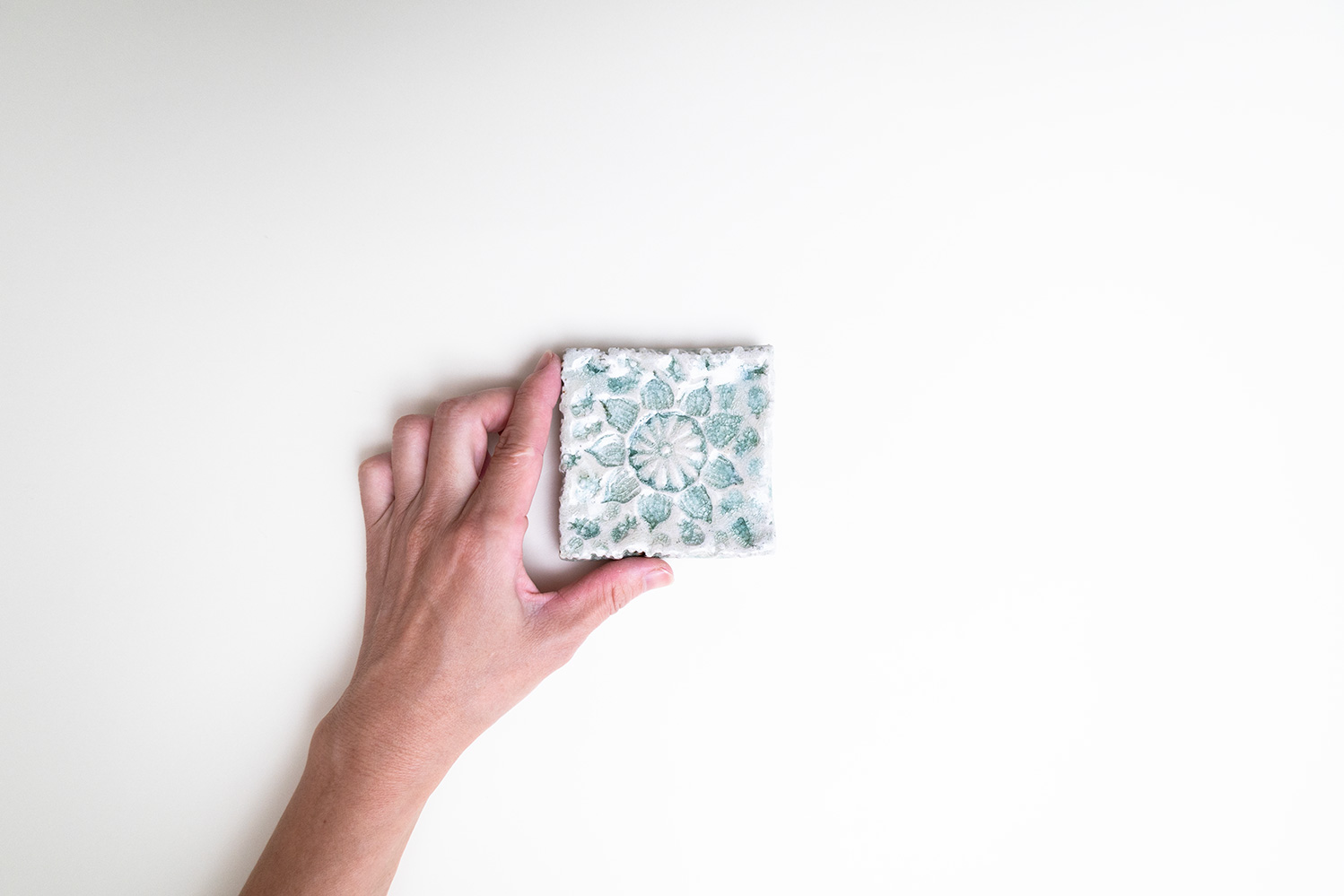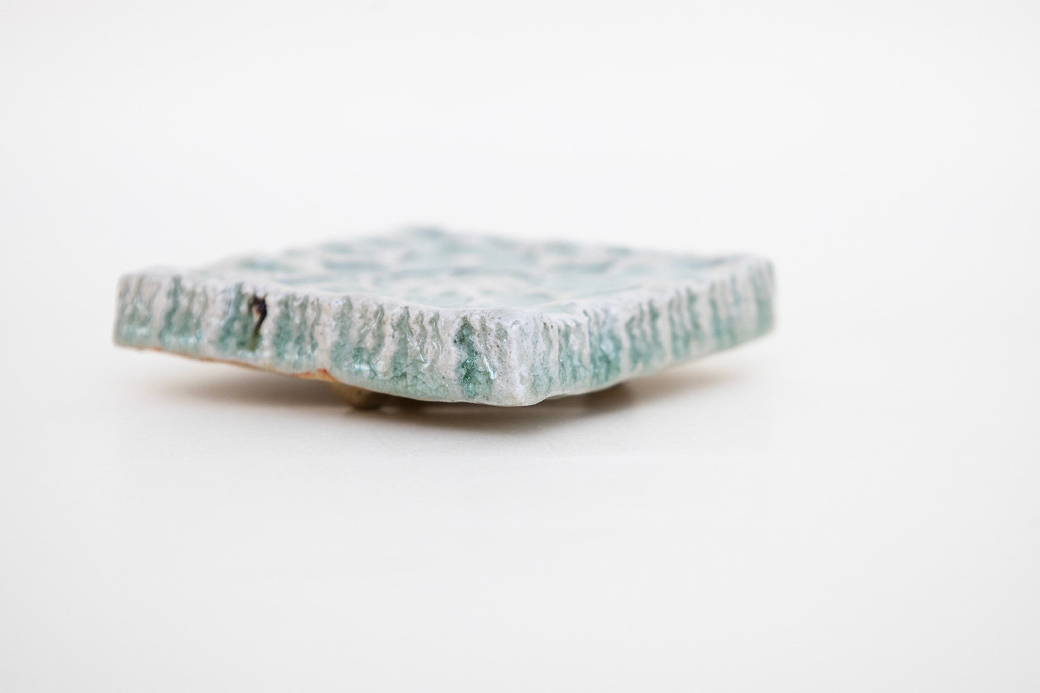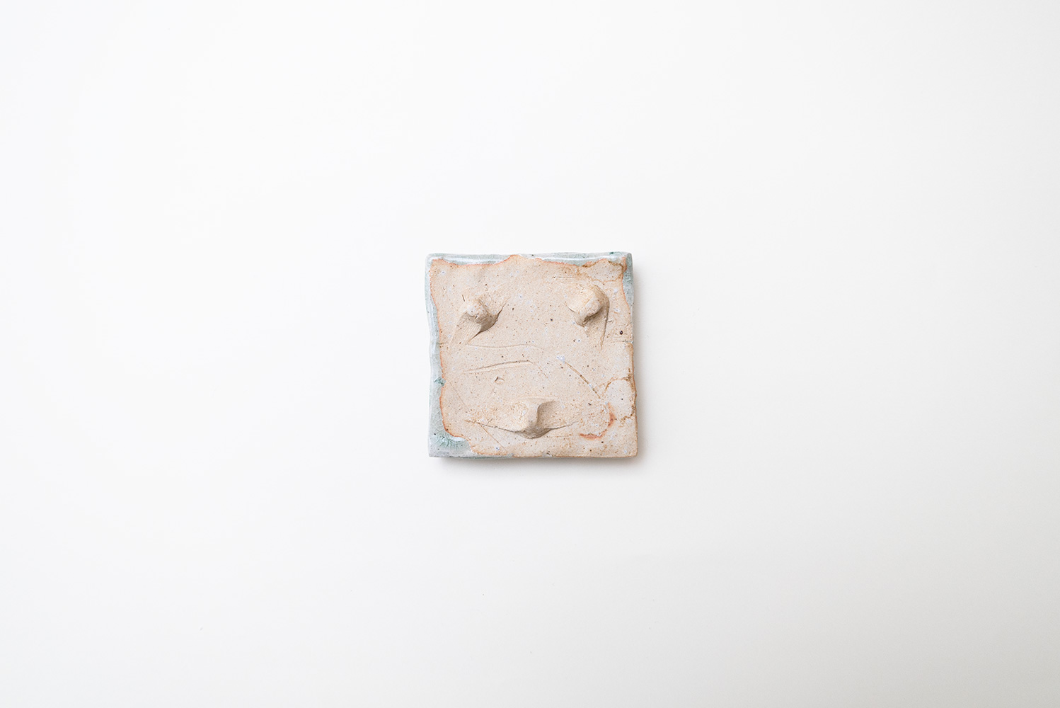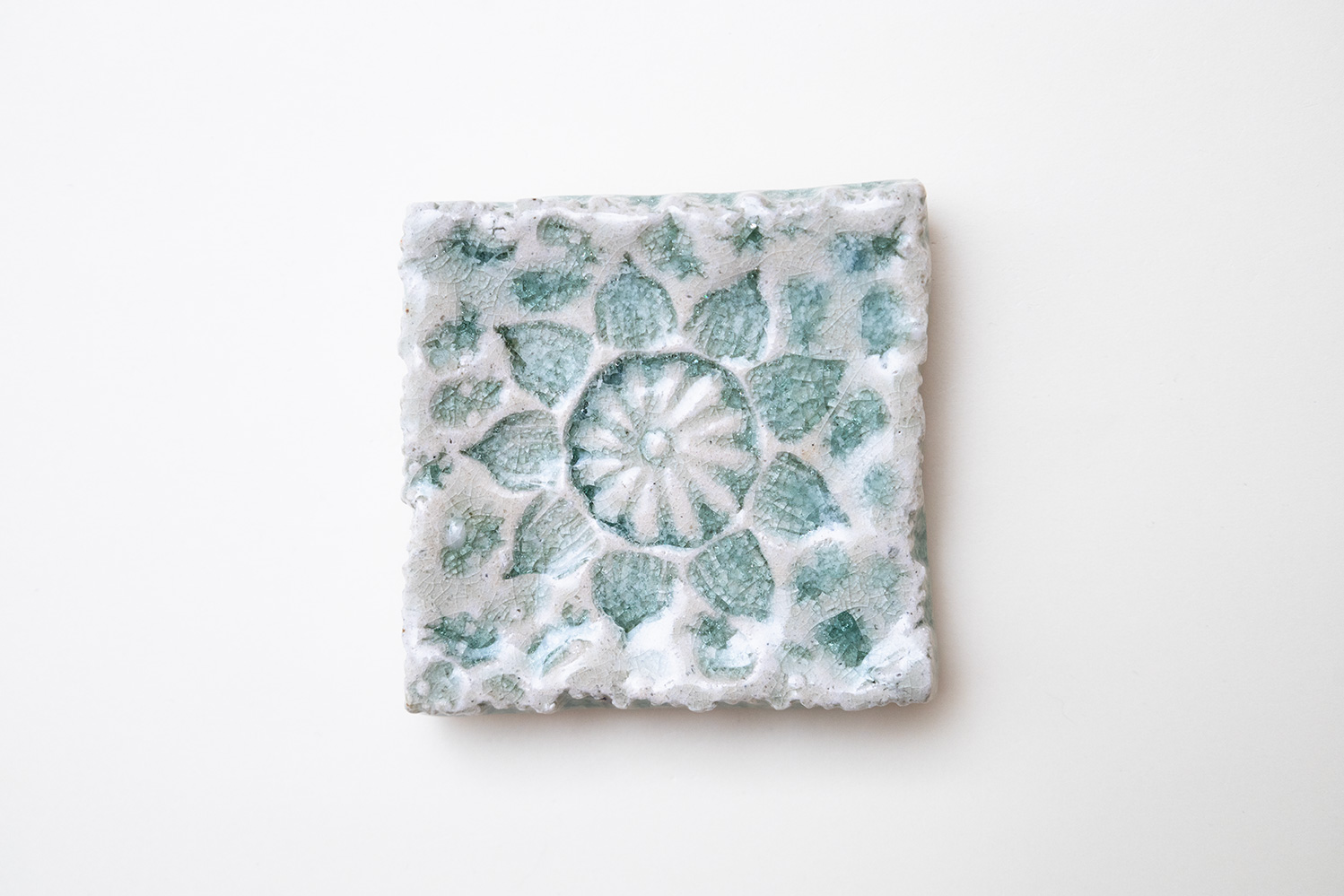 土はご自宅の畑から、湧き水を思わせる淡い水色の釉薬は薪ストーブの灰からと身近なものから生み出される美しいもの。自然が美しく感じることと同じように穏やかに心に染み込む器です。陰刻と陽刻で押された柄の陰影が奥行きのある表情を見せてくれます。