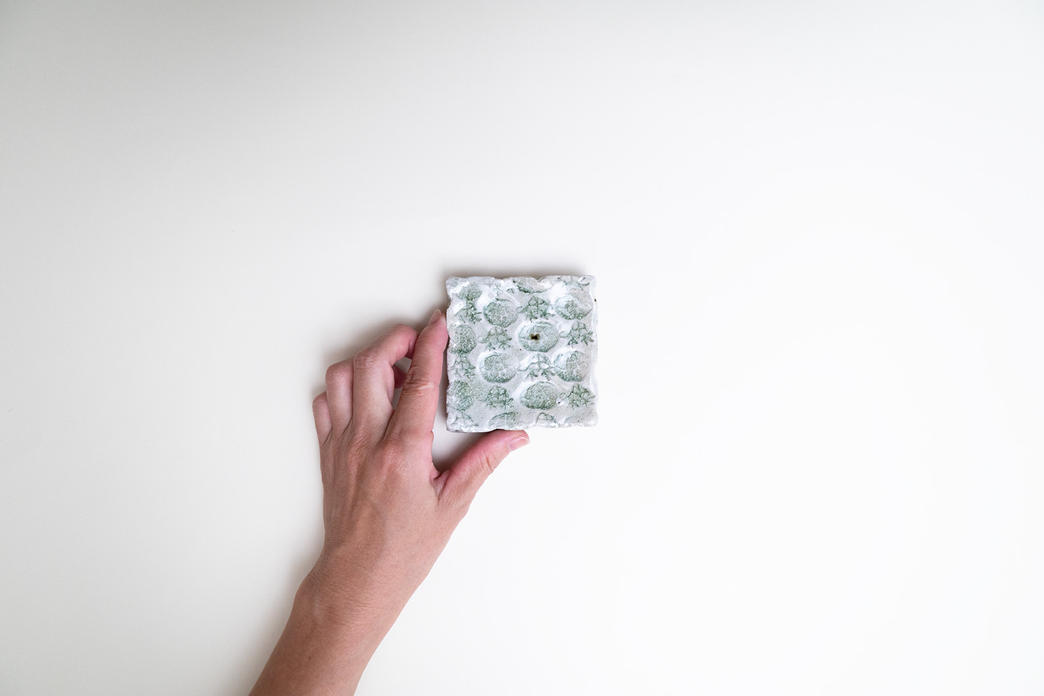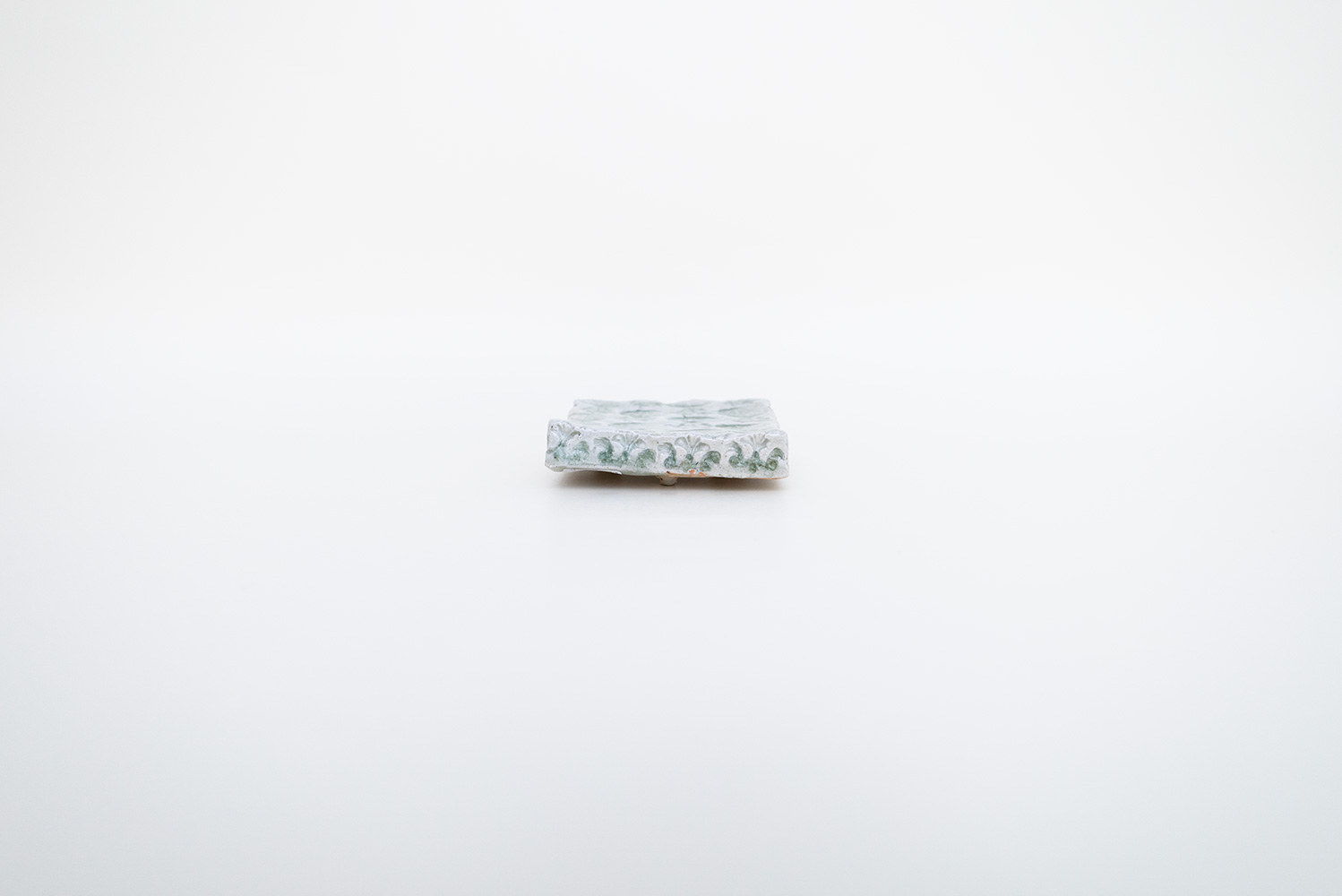 土はご自宅の畑から、湧き水を思わせる淡い水色の釉薬は薪ストーブの灰からと身近なものから生み出される美しいもの。自然が美しく感じることと同じように穏やかに心に染み込む器です。陰刻と陽刻で押された柄の陰影が奥行きのある表情を見せてくれます。