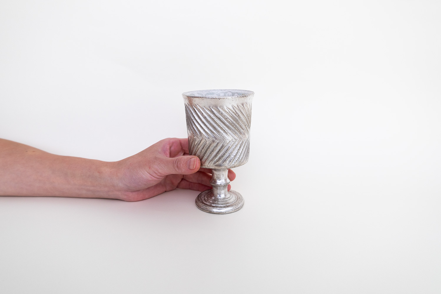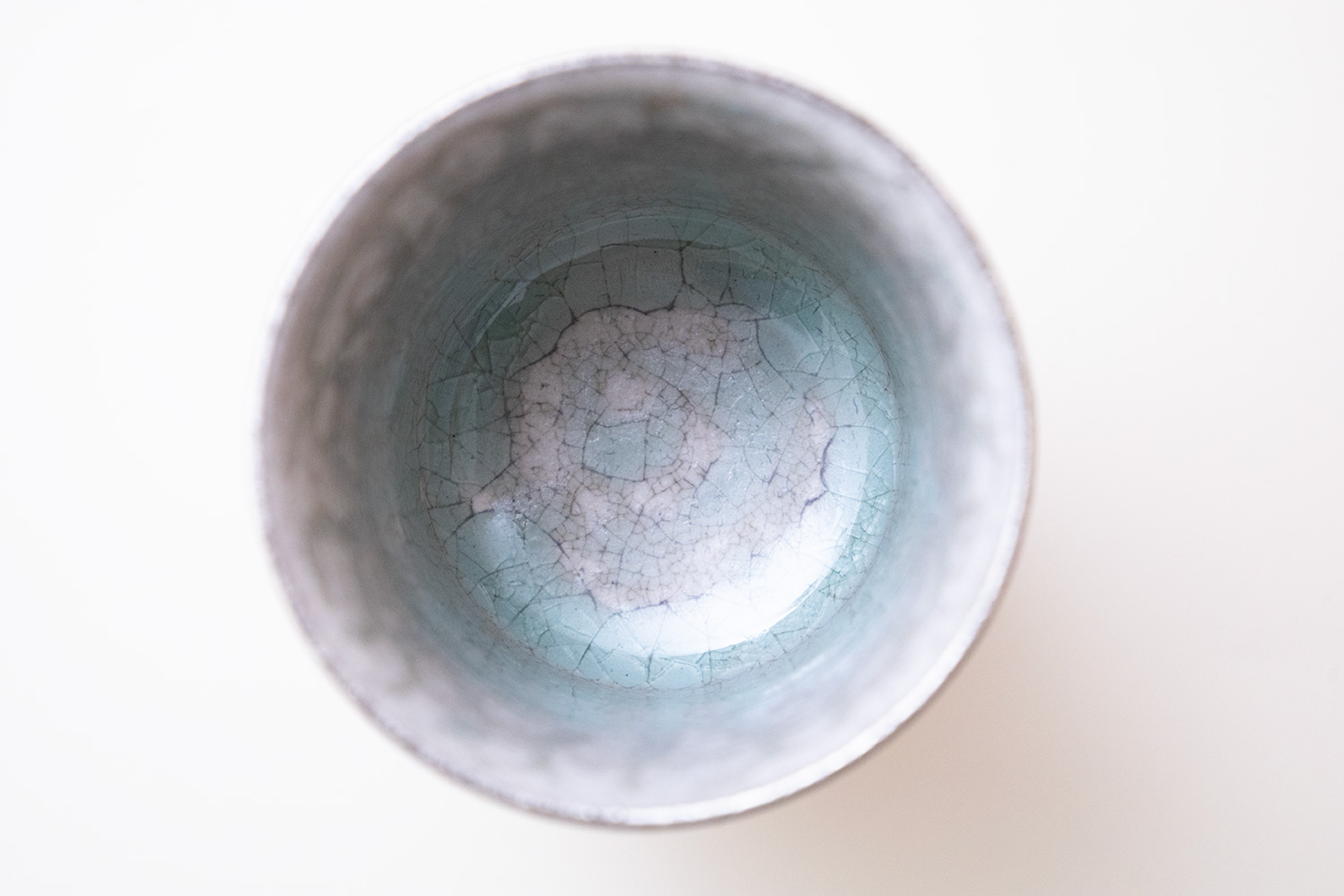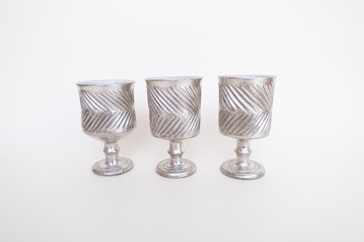 シルバーの色の変化がより楽しめそうな鎬柄の入ったゴブレットです。内側の淡い水色のビードロとの相性も素敵です!!氷を入れてアイスコーヒーなどにも良さそうです。