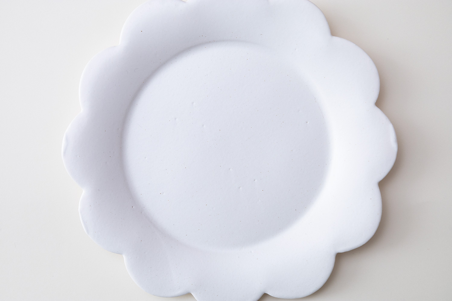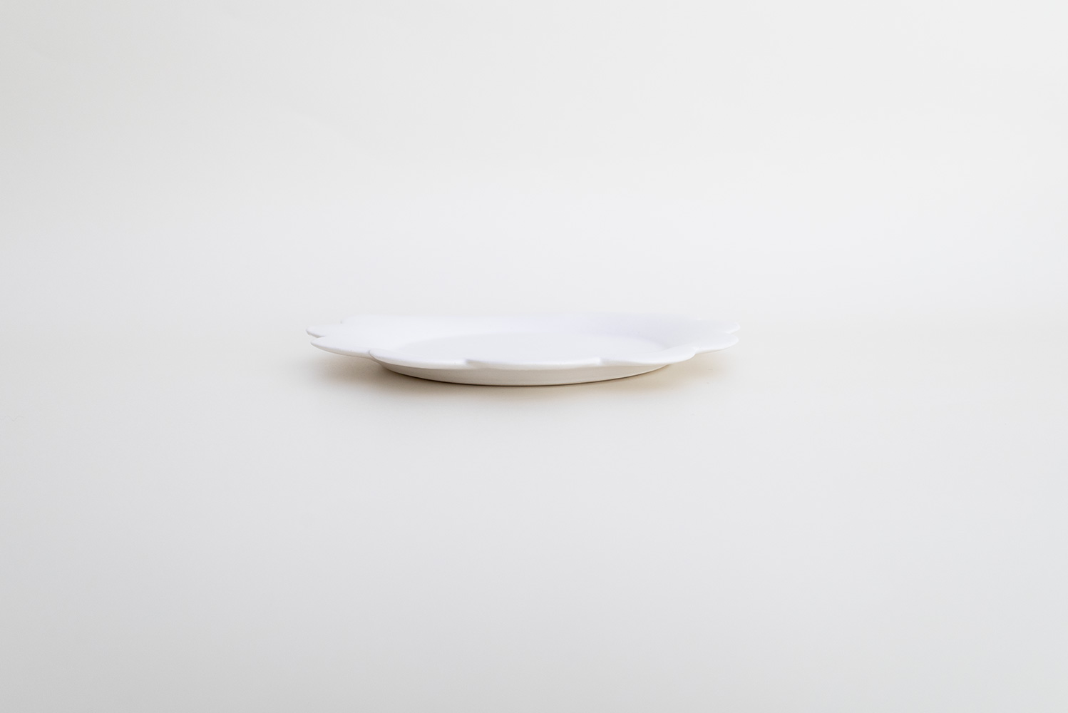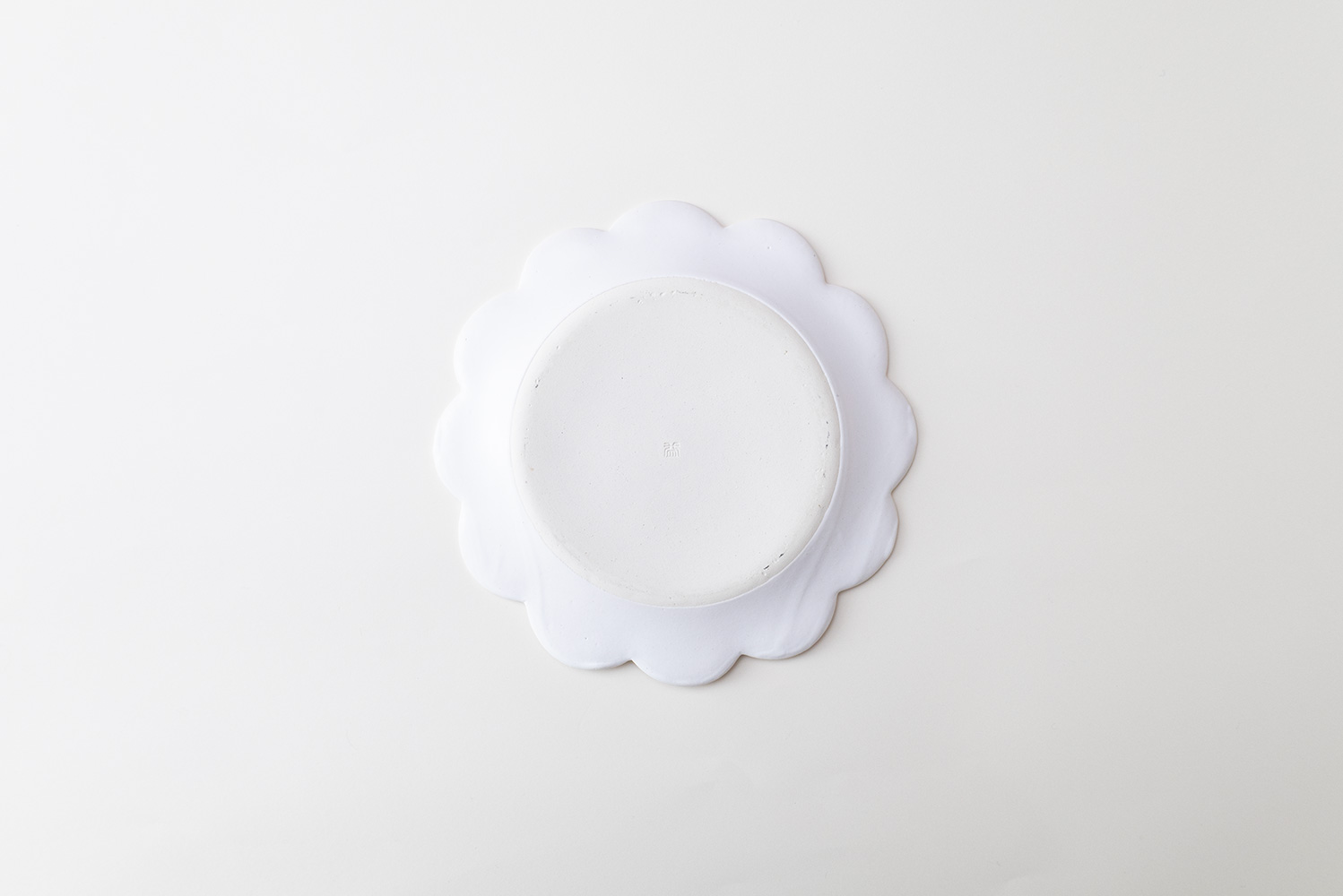 フラワープレートの白が新しい釉薬でリニューアルしました。サイズ展開も4種類ございます。シンプルな花形のデザインながら花びらの縁や裏面の仕上げ方など、大変丁寧な手仕事が伺えます。