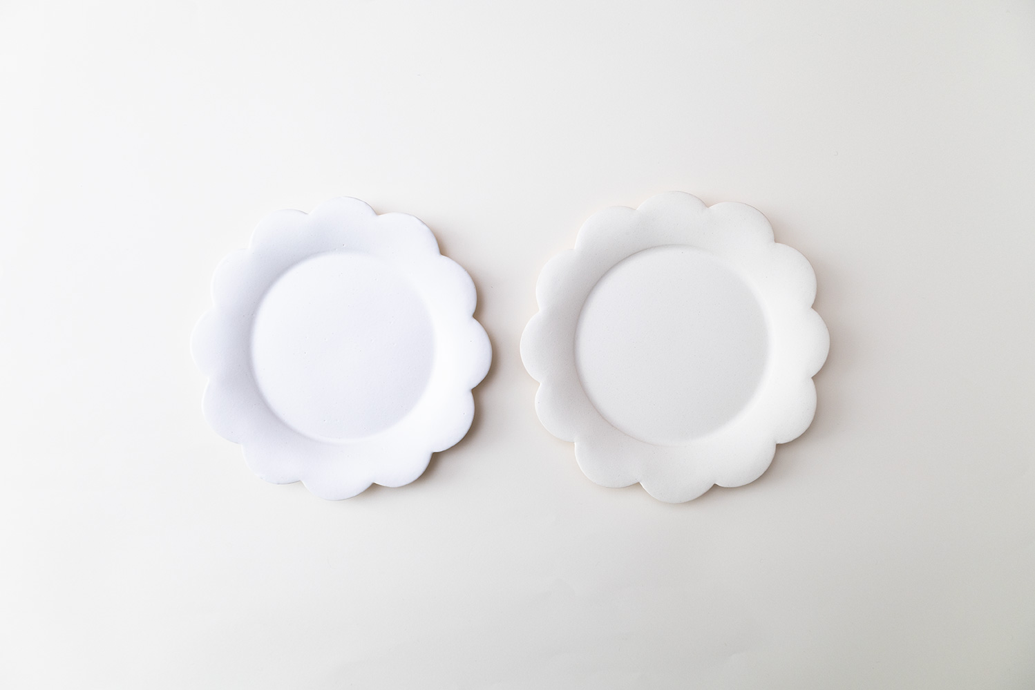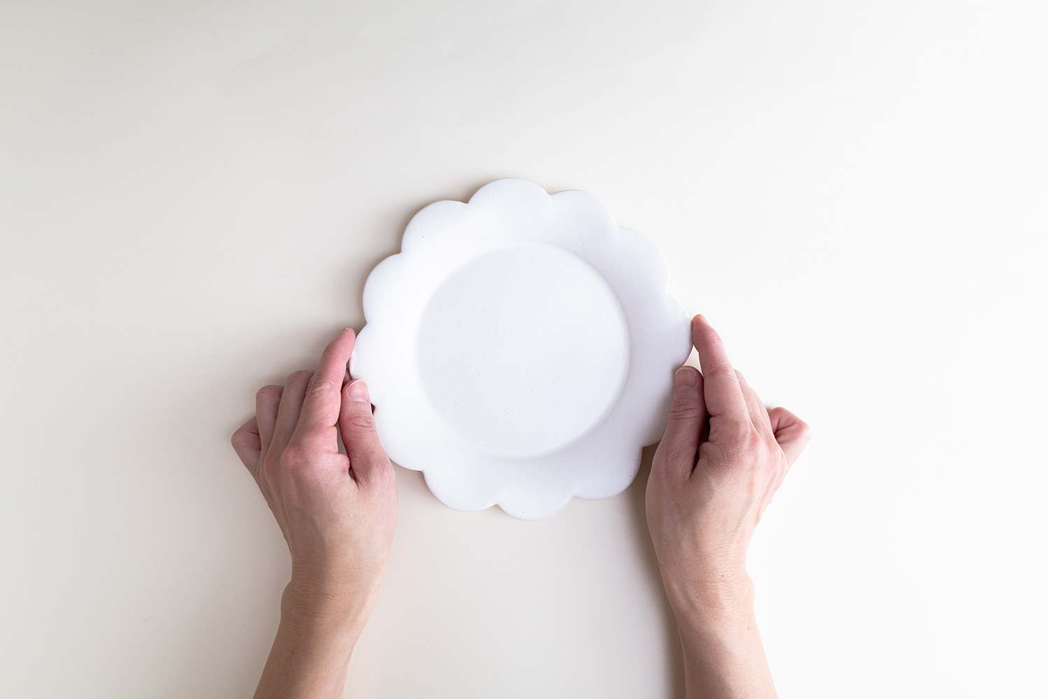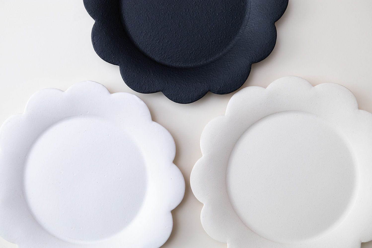 フラワープレートの白が新しい釉薬でリニューアルしました。サイズ展開も4種類ございます。シンプルな花形のデザインながら花びらの縁や裏面の仕上げ方など、大変丁寧な手仕事が伺えます。