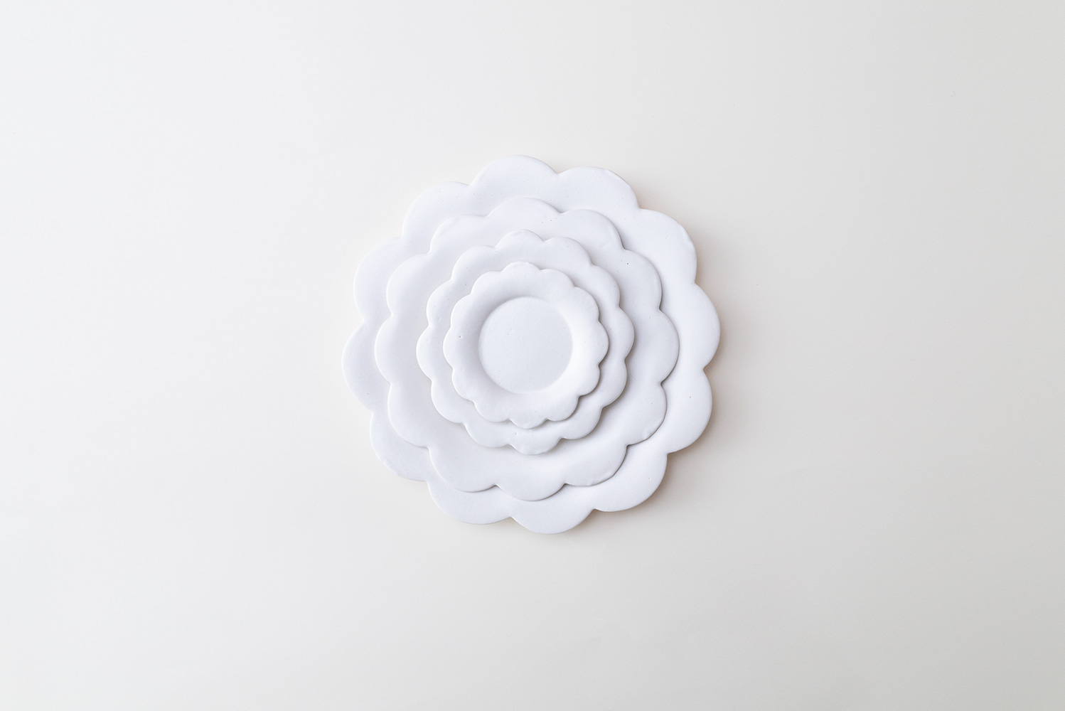 フラワープレートの白が新しい釉薬でリニューアルしました。サイズ展開も4種類ございます。シンプルな花形のデザインながら花びらの縁や裏面の仕上げ方など、大変丁寧な手仕事が伺えます。
