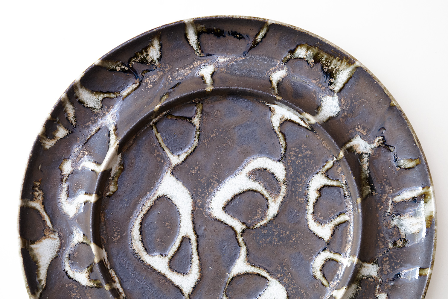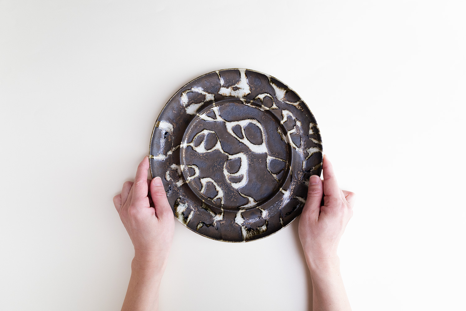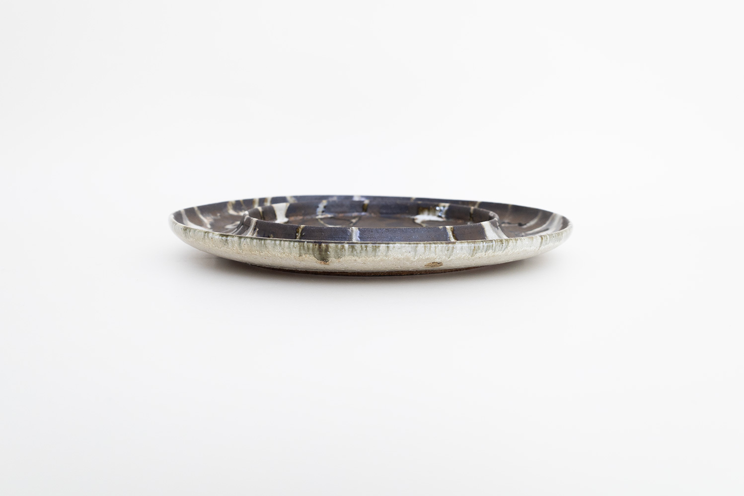 その名の通りパスタを盛り付けやすく、そして美しく見せてくれる1枚です。独特の模様が印象的なツートン。白い部分はやや厚めに釉薬を掛け、それを流しながら模様をつくり、その後白い釉薬のかかっていない部分に錆釉を刷毛で塗るという、惜しみない手間がかけられています。それゆえに白と黒にほんの少しの立体感が生まれ、より躍動感のある仕上がりとなっています。