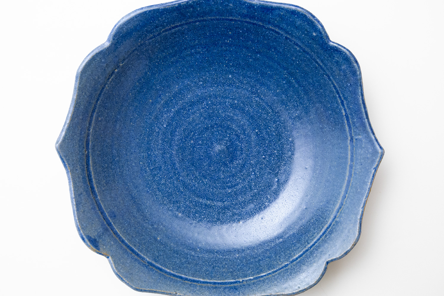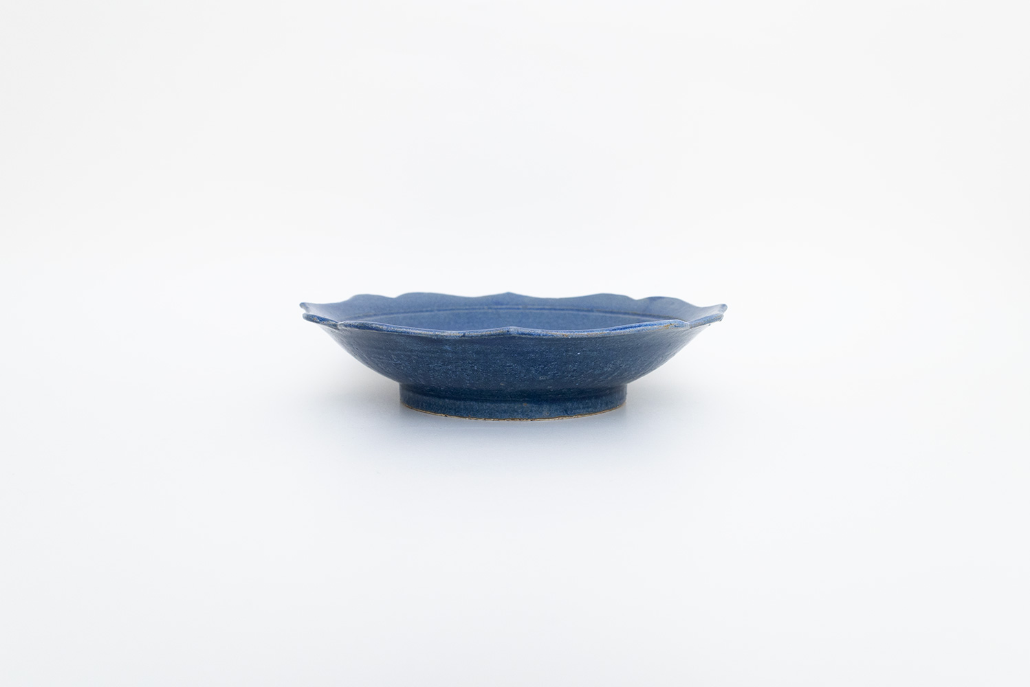 落ち着いた色味の青と柔らかいエッジの輪花が素敵な浅めの鉢です。大きすぎず小さすぎない万能な7寸サイズです。