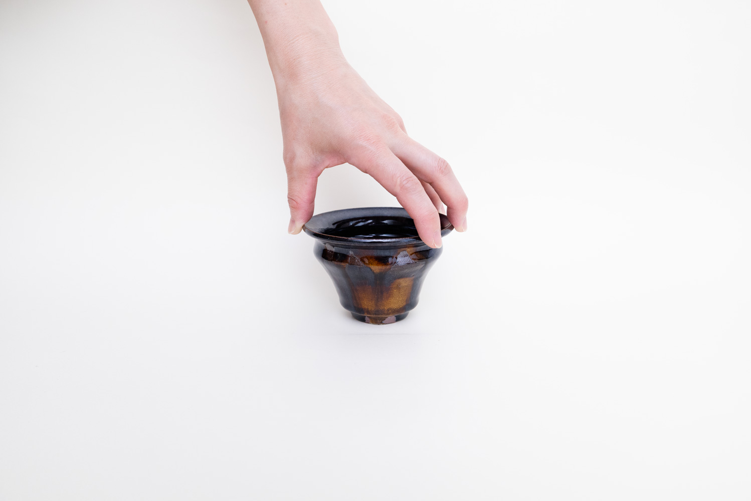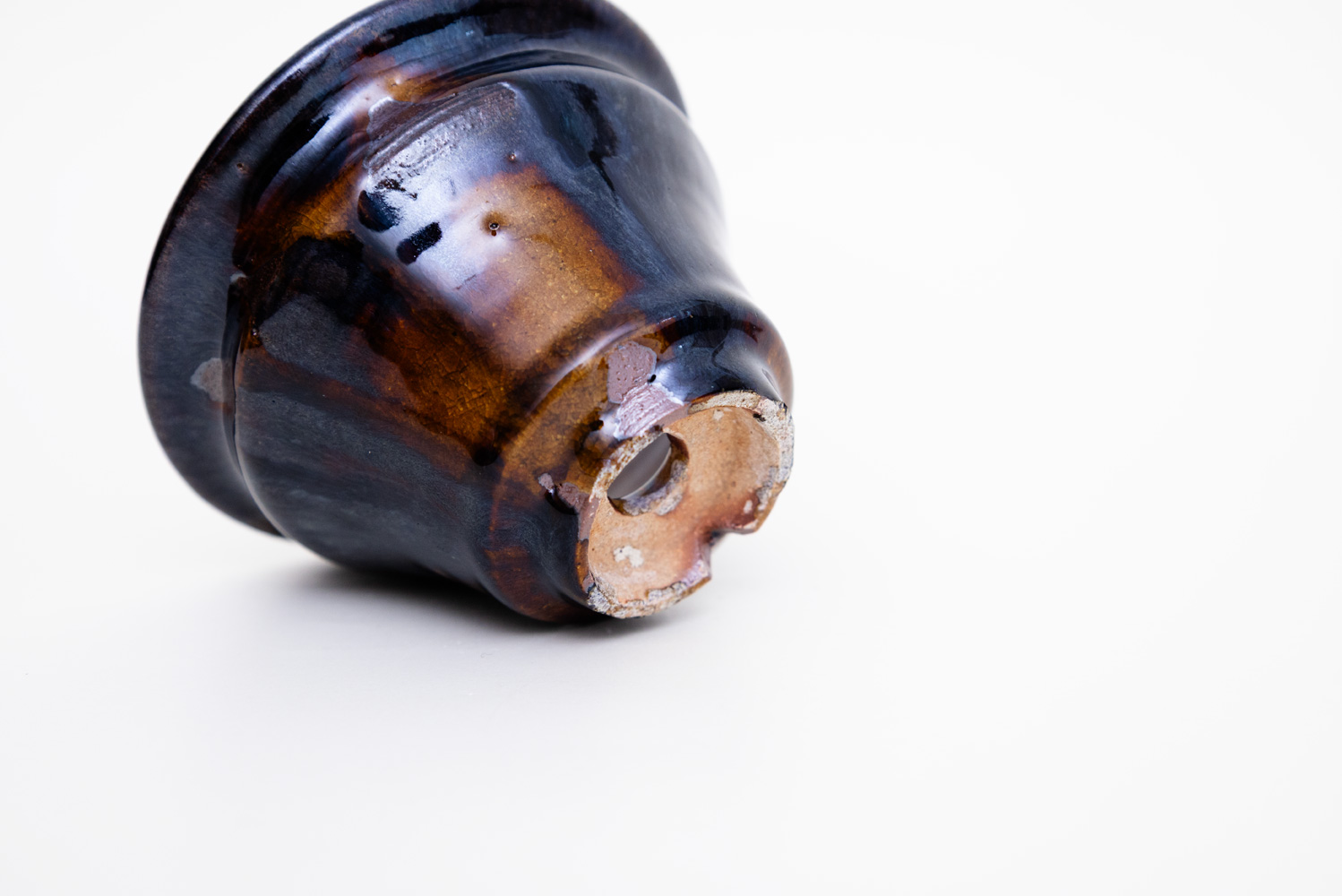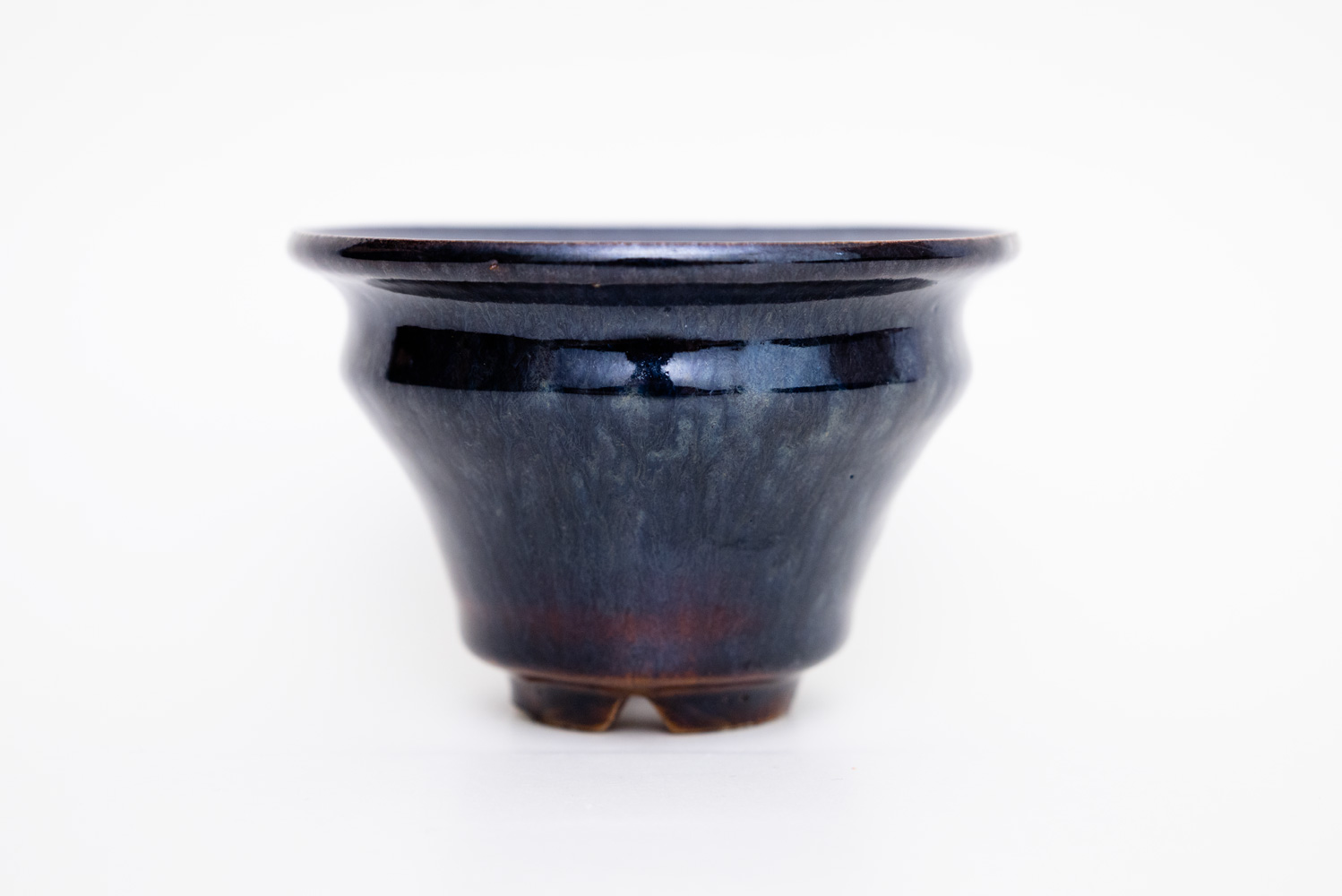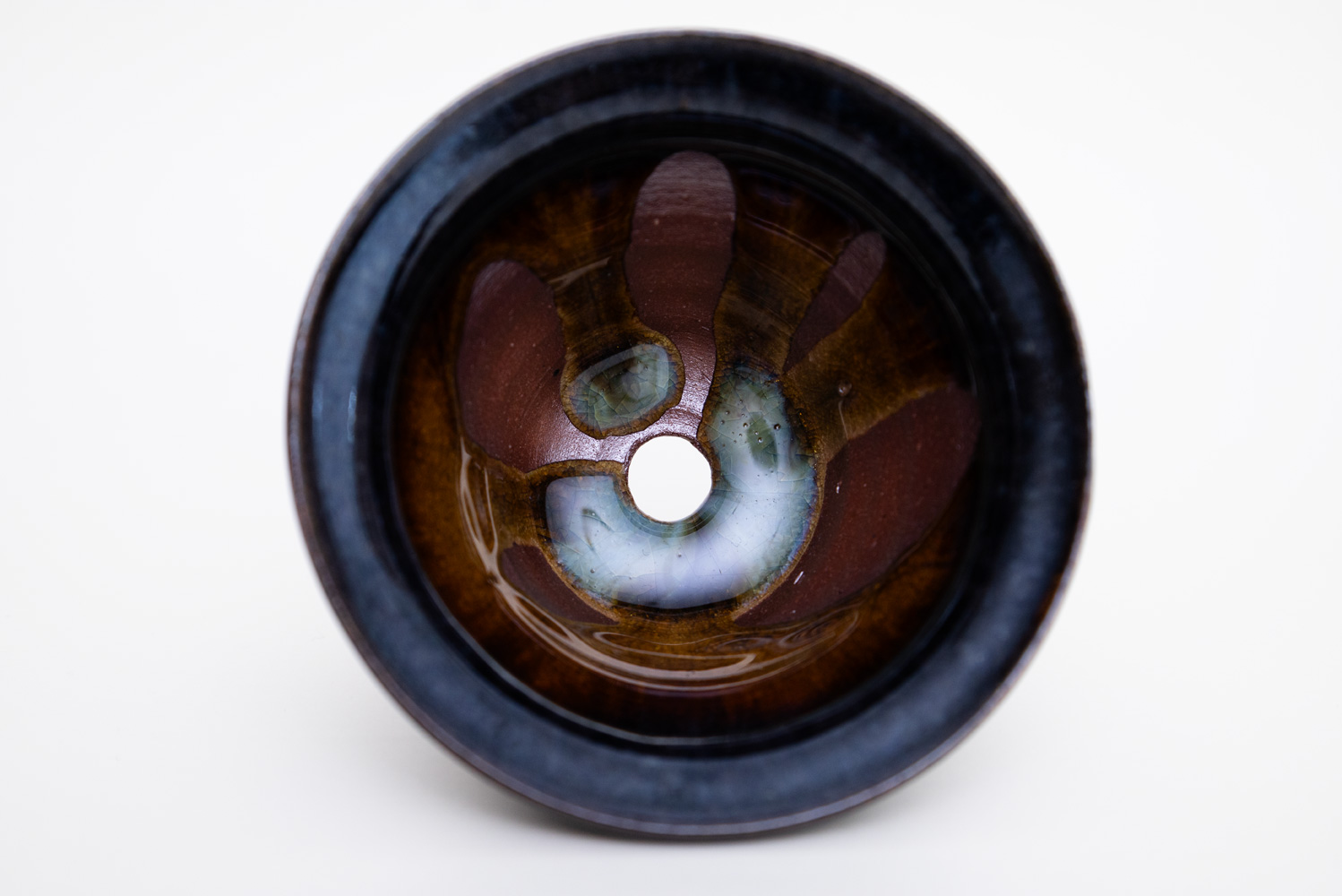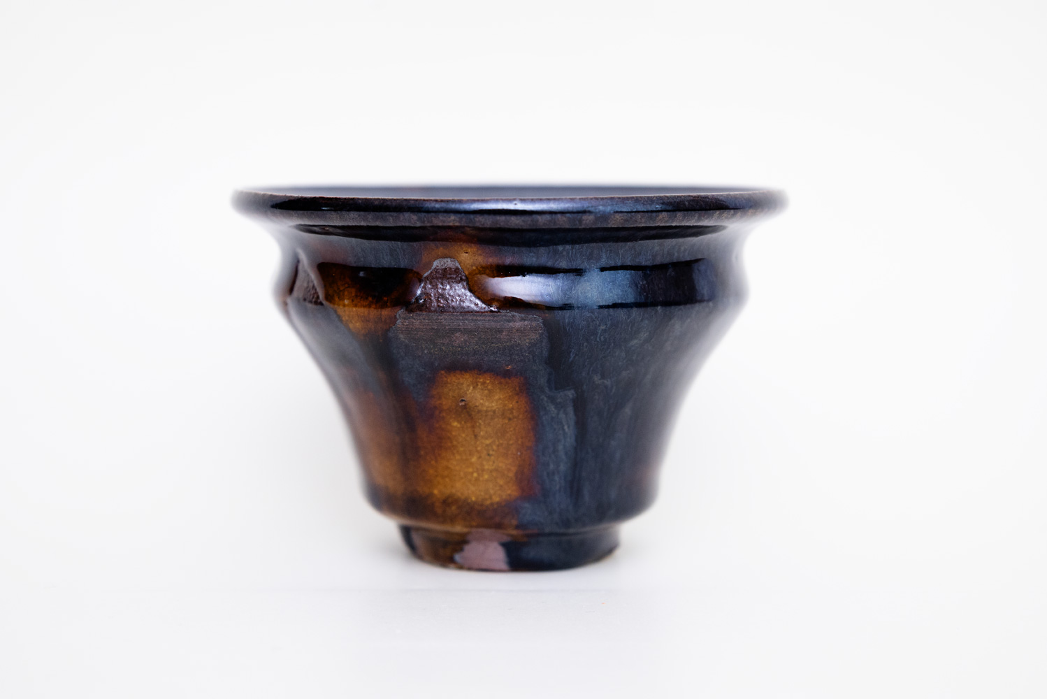 深い褐色の釉薬が複雑に溶けて混ざり合い揺らめく色彩を作っています。
