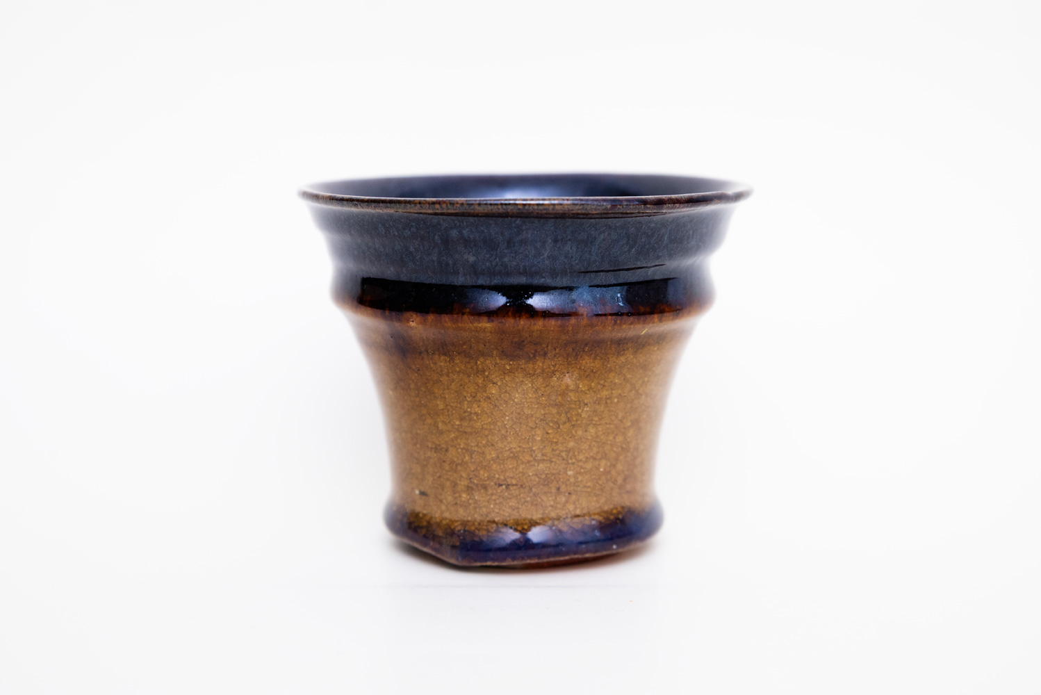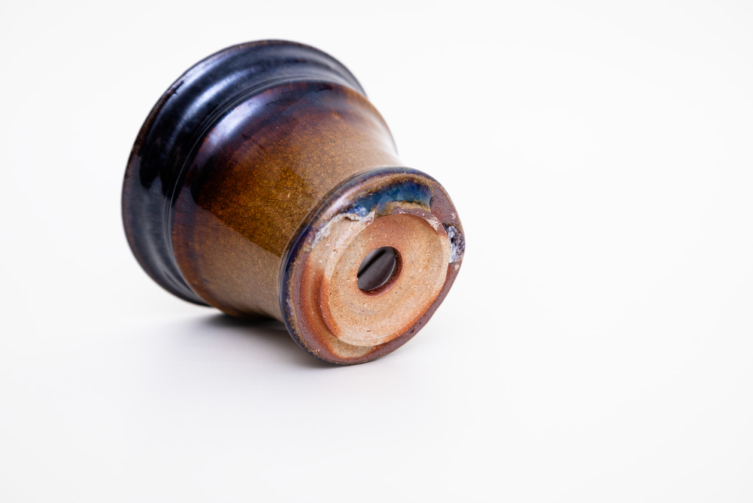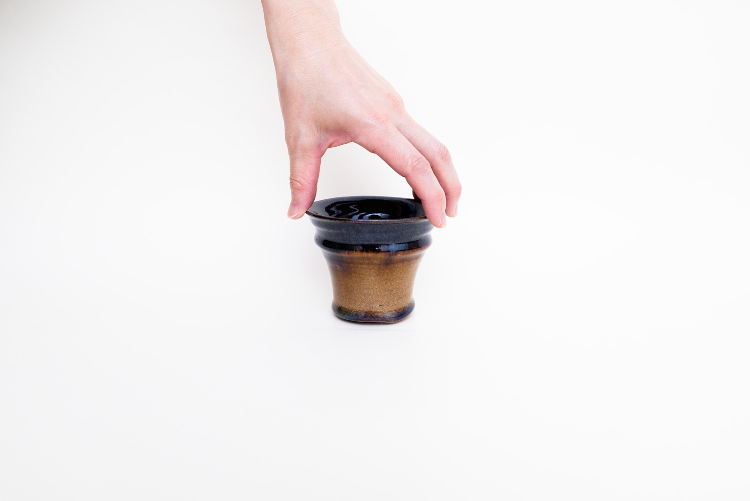 深い褐色の釉薬が複雑に溶けて混ざり合い揺らめく色彩を作っています。