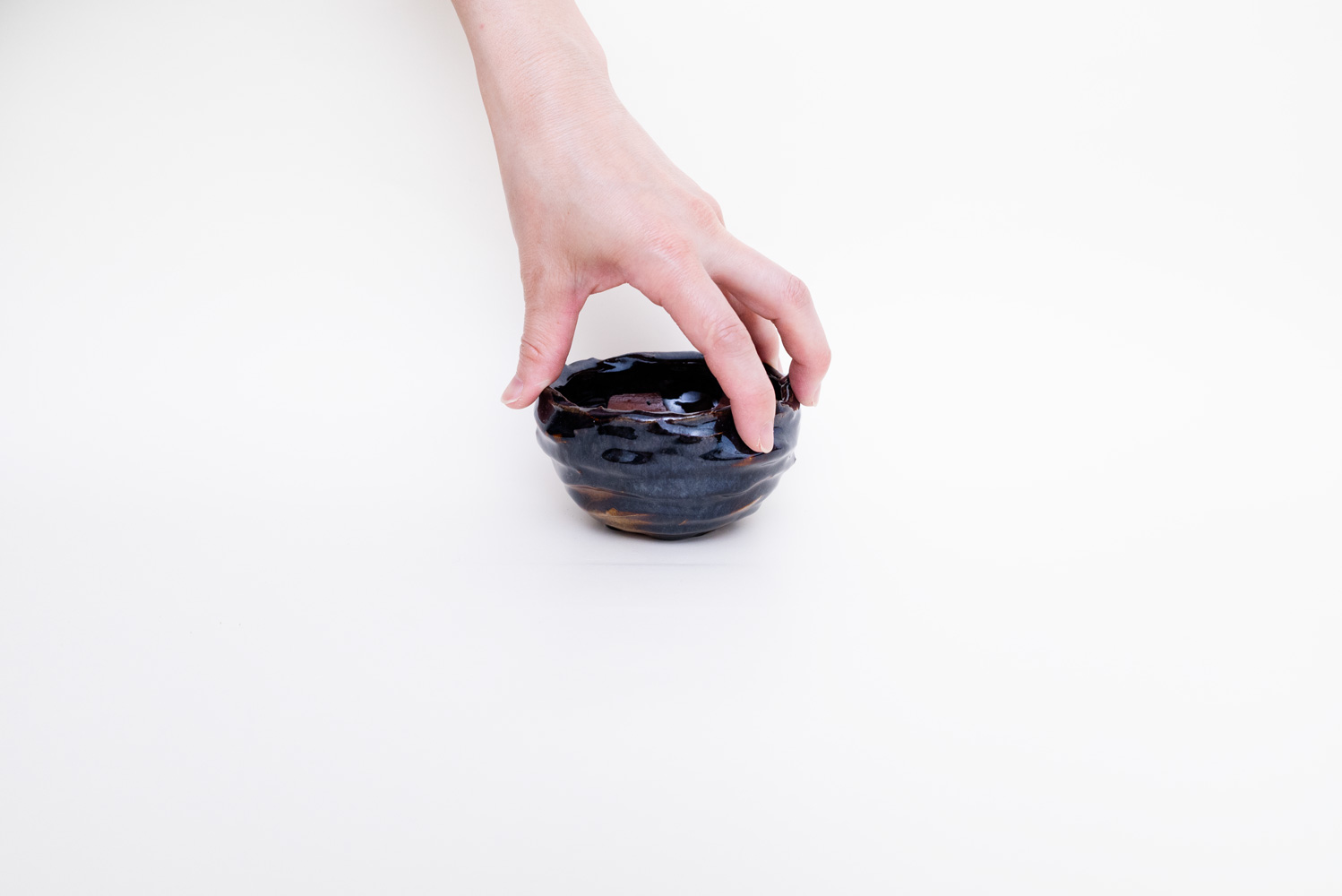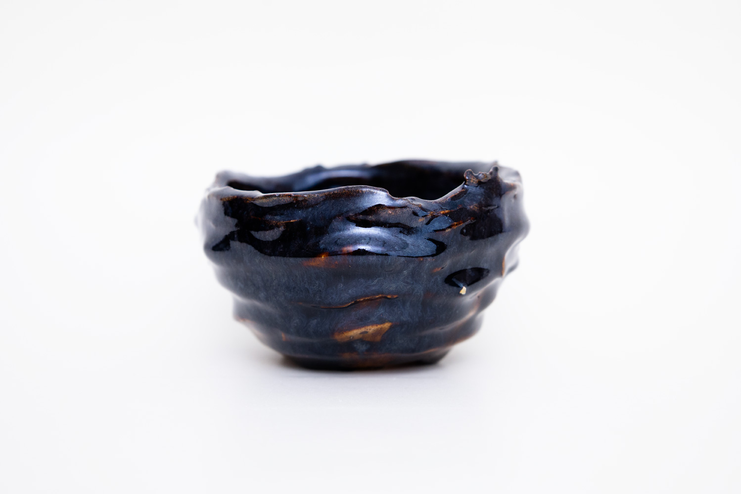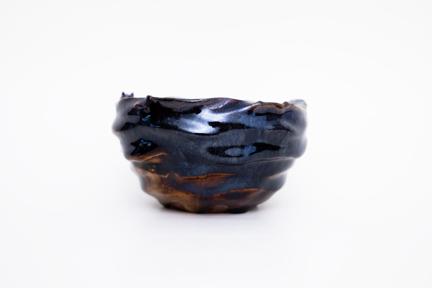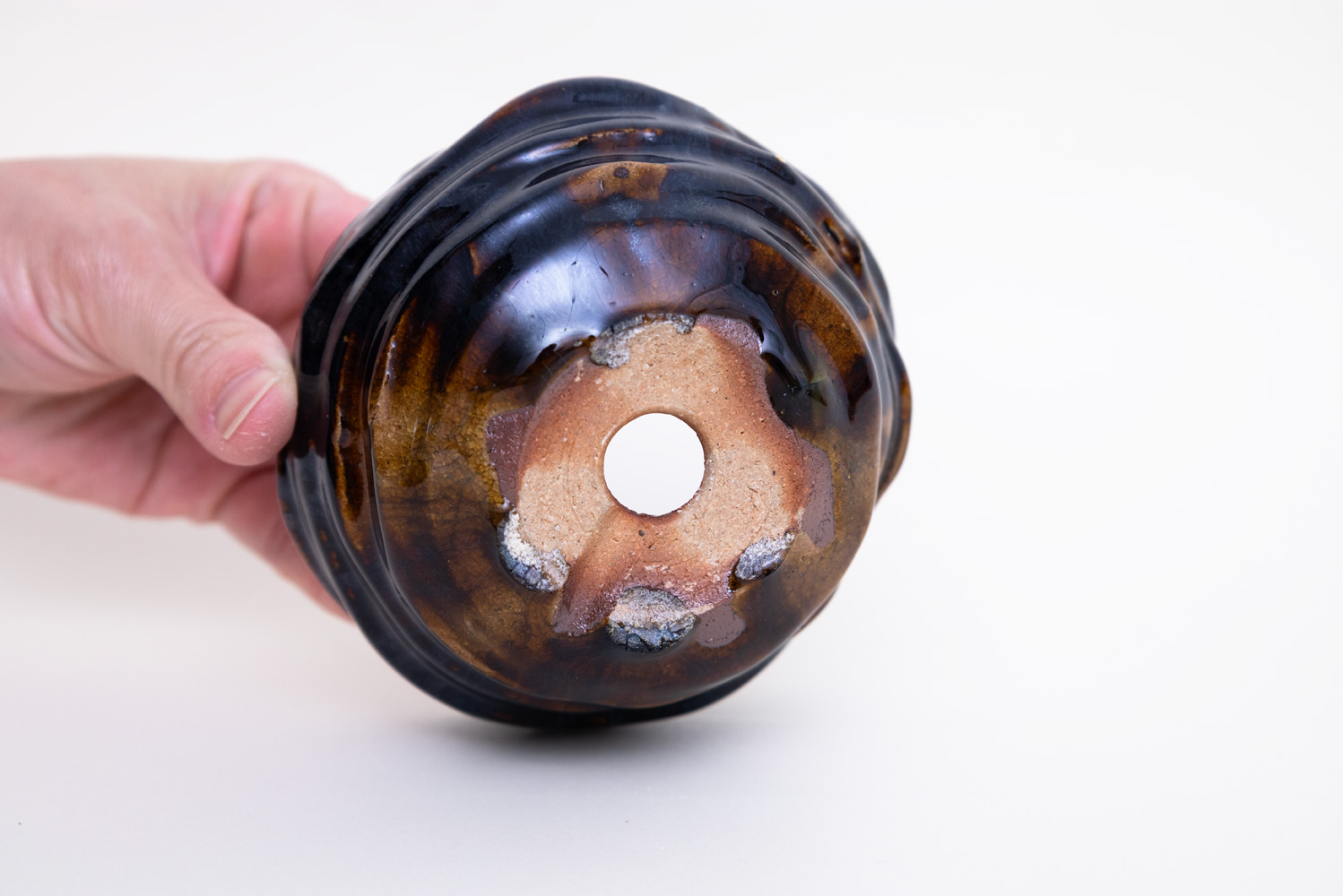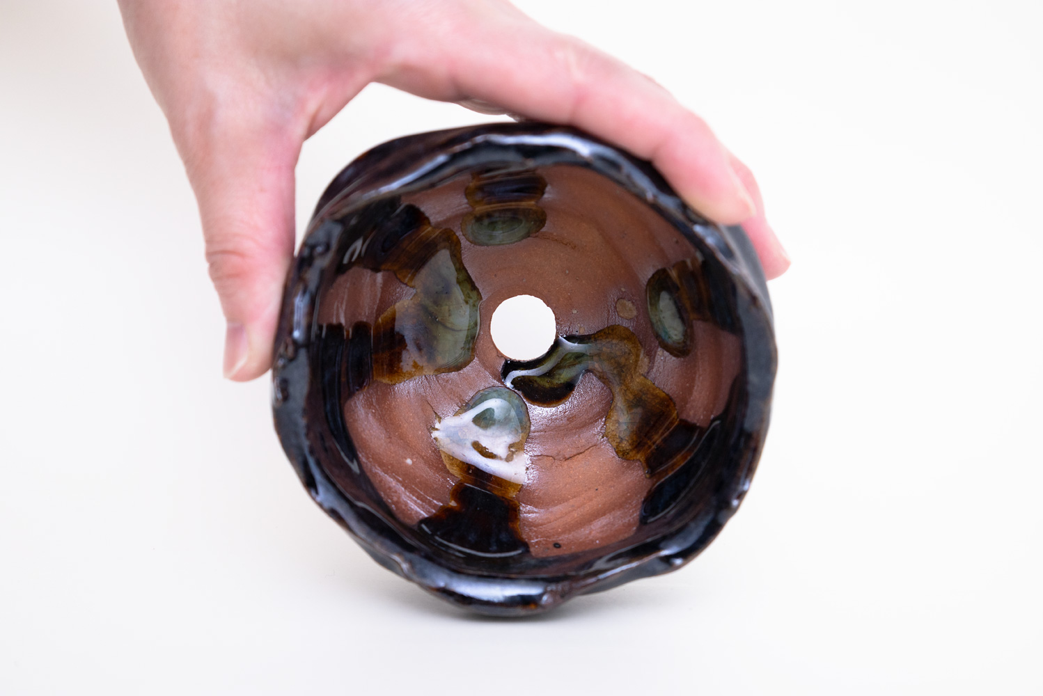 深い褐色の釉薬が複雑に溶けて混ざり合い揺らめく色彩を作っています。