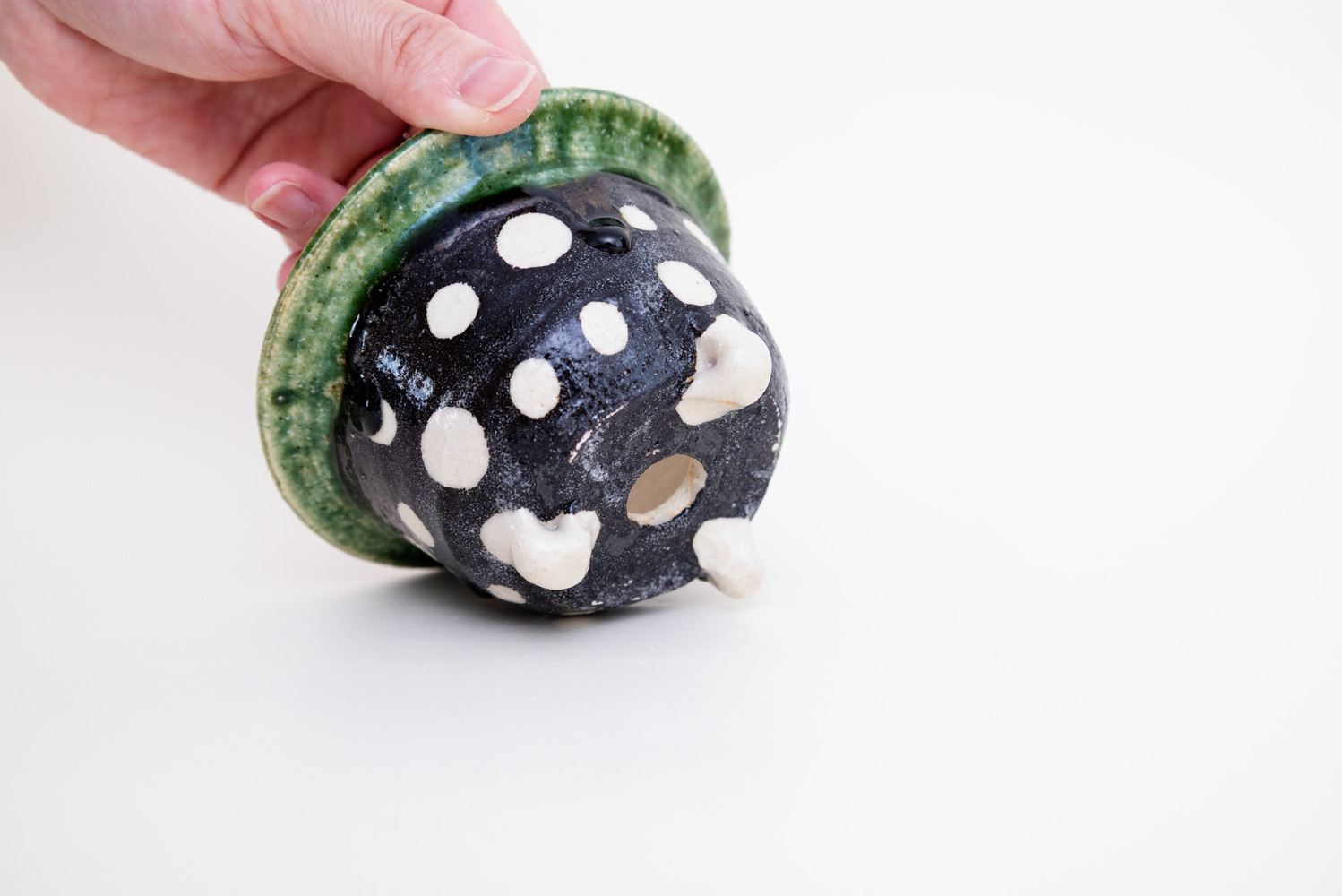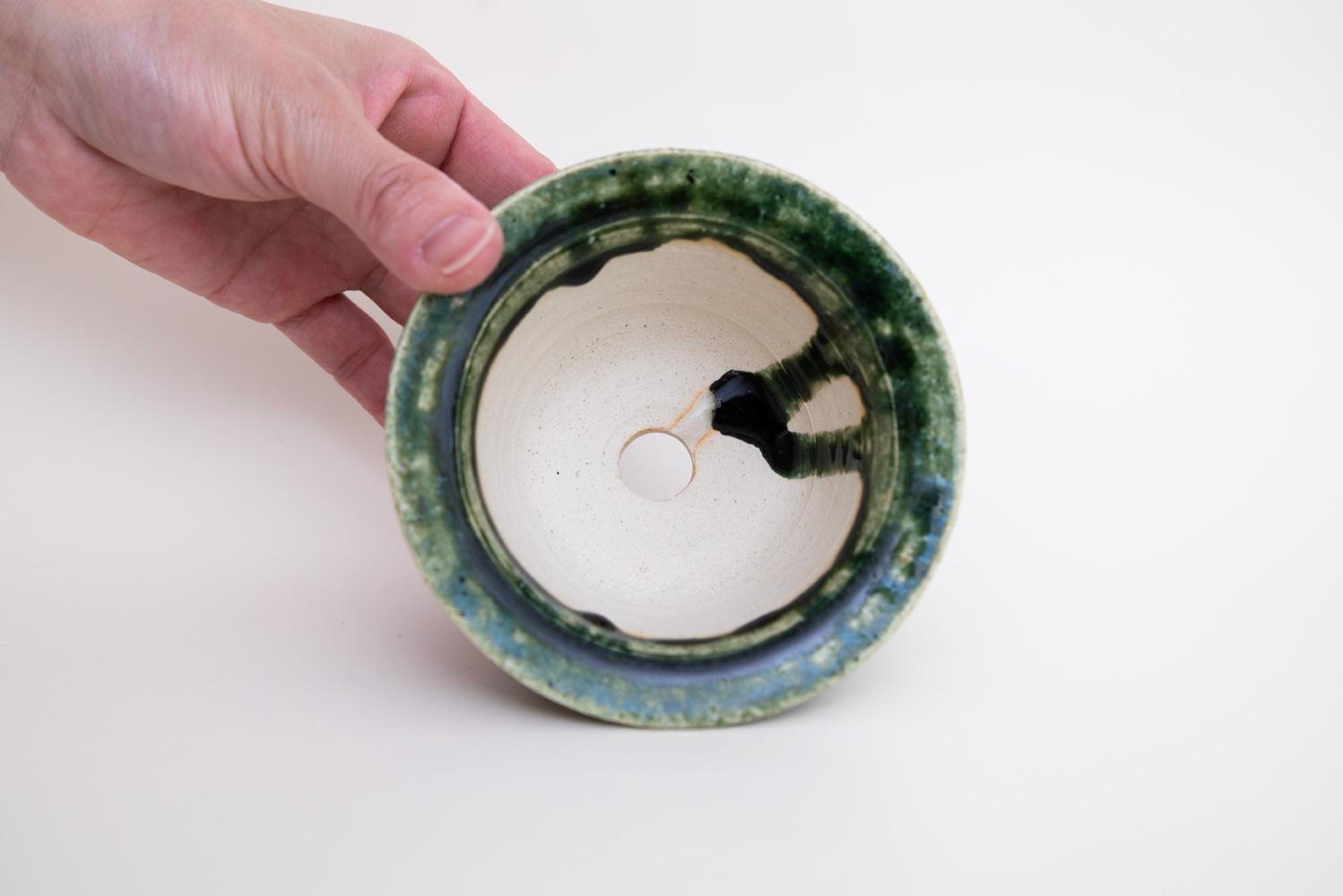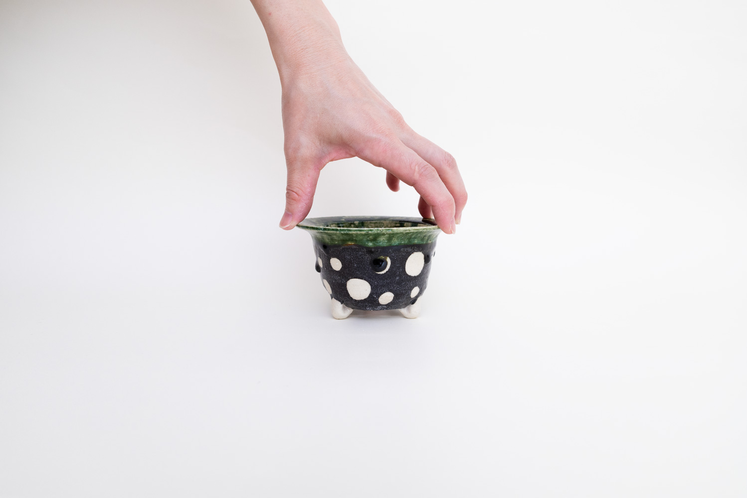 鮮やかな織部の緑にドット柄が可愛らしい植木鉢です。ミニ盆栽にもどうぞ。