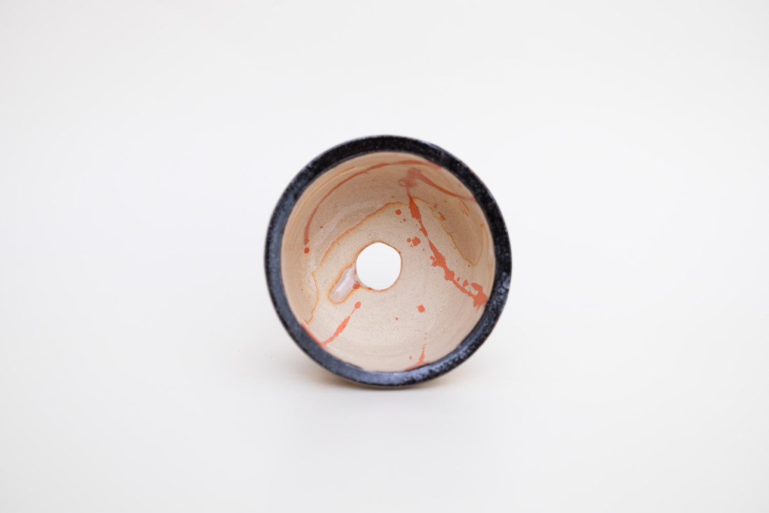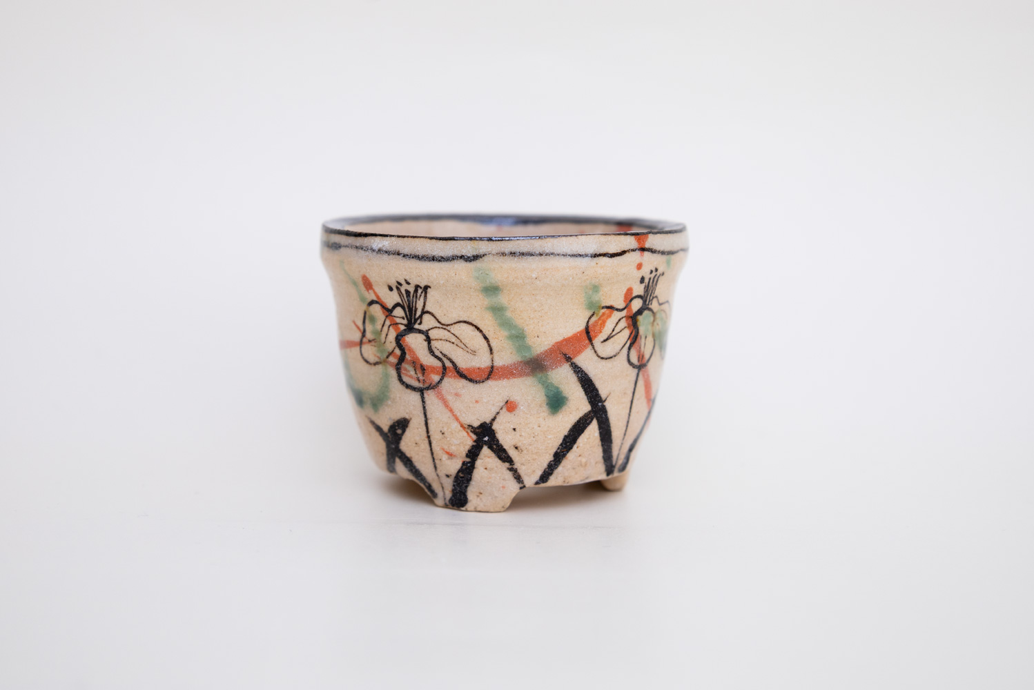 伝統的な絵柄に緑とオレンジ色の華やかな植木鉢です。ミニ盆栽にもどうぞ。