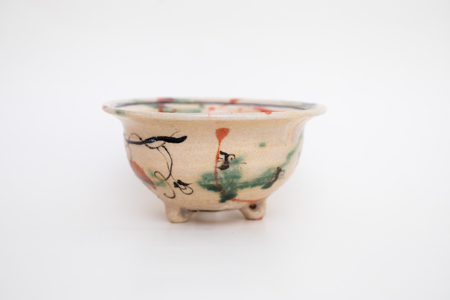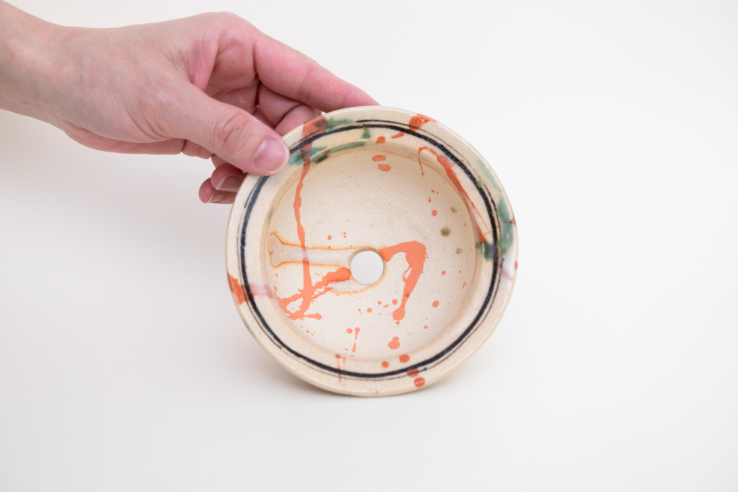 伝統的な絵柄に緑とオレンジ色の華やかな植木鉢です。ミニ盆栽にもどうぞ。