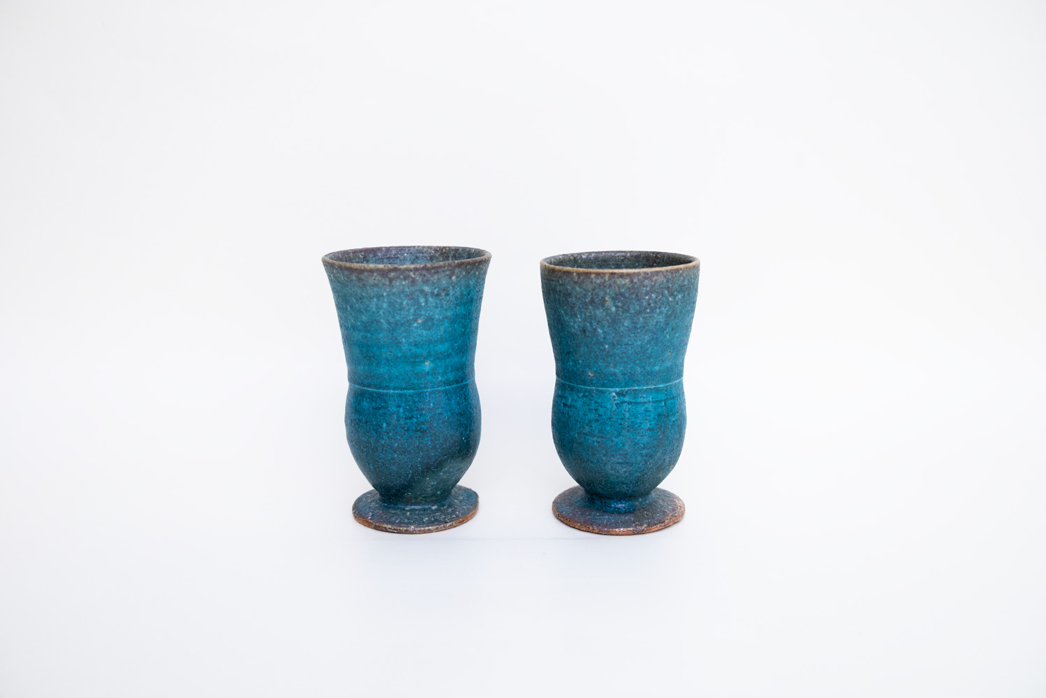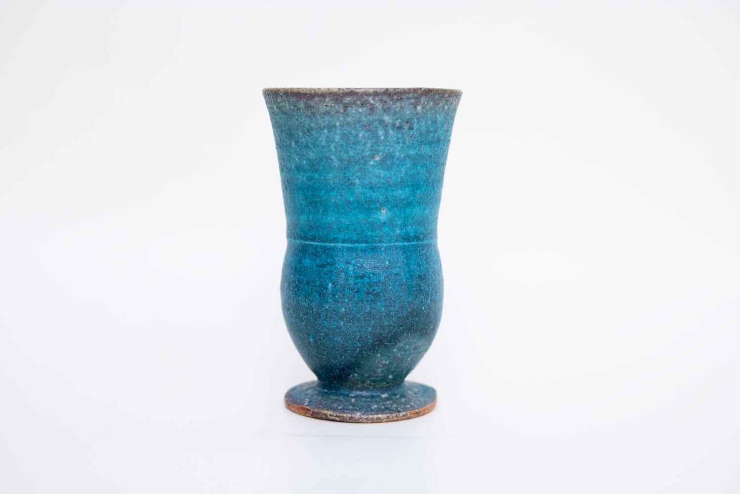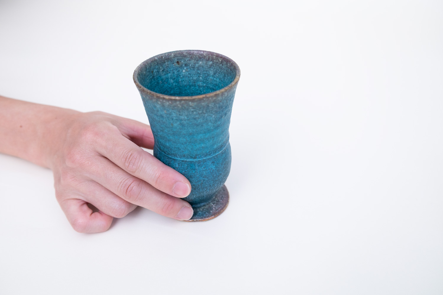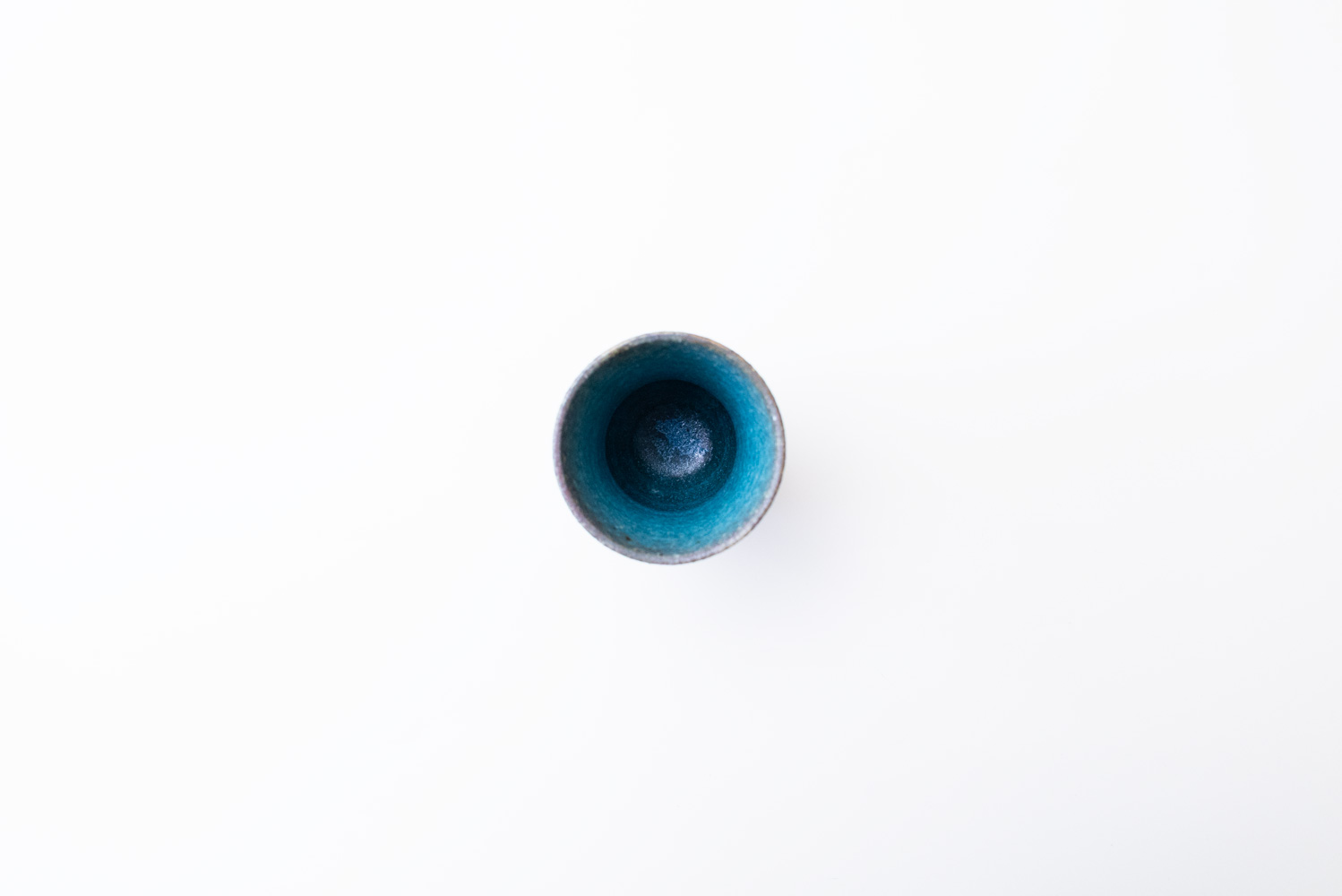 湯呑みとして制作されたカップなのですが、モダンな形からあえて「ティーカップ」としました。こちらはやや口が開いているタイプになります。「酸化」と「還元」が出やすい環境をあえて選び、安定させないからこそ一期一会がある「藤原ブルー」。青空のようなブルーも、黄昏時のようなブルーも、どちらに振れても、魅力的です。