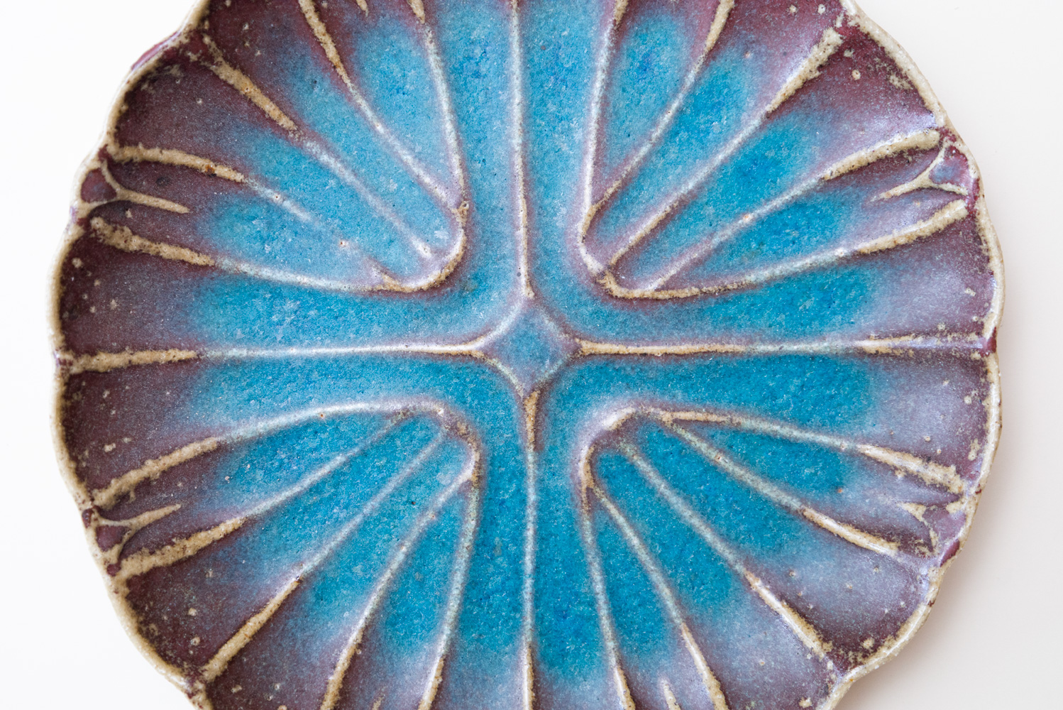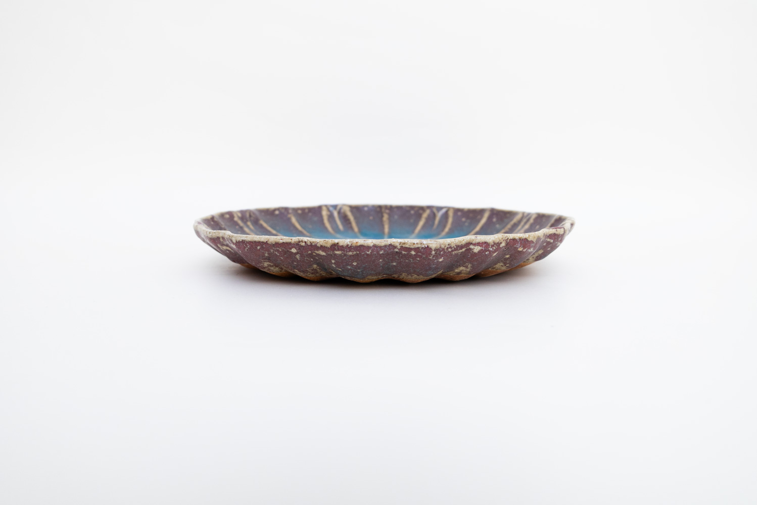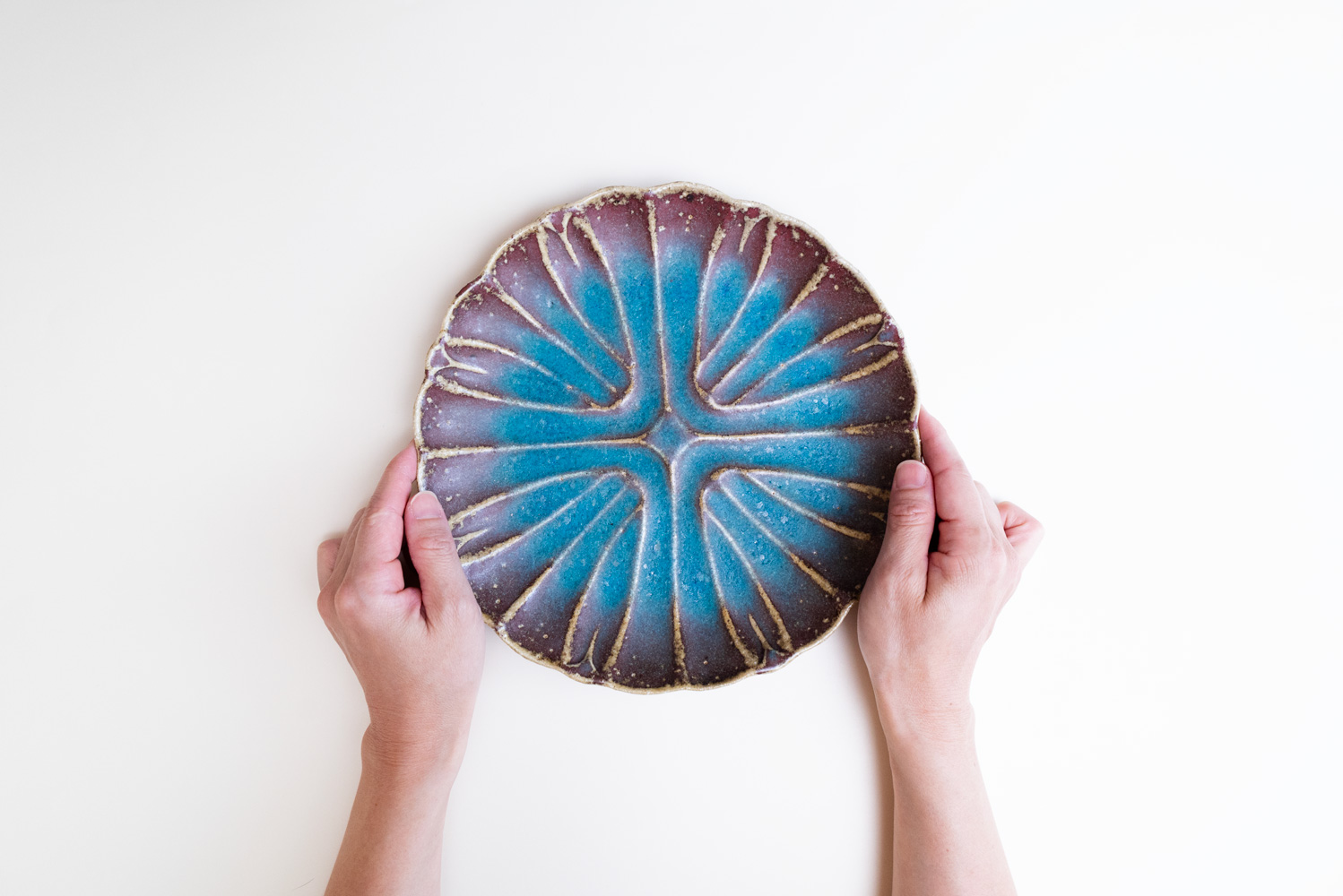 菊花の模様を再構成したことで、シンプルでアイコン的な新たな菊花模様となりました。「酸化」と「還元」が出やすい環境をあえて選び、安定させないからこそ一期一会がある「藤原ブルー」。青空のようなブルーも、黄昏時のようなブルーも、どちらに振れても、魅力的です。