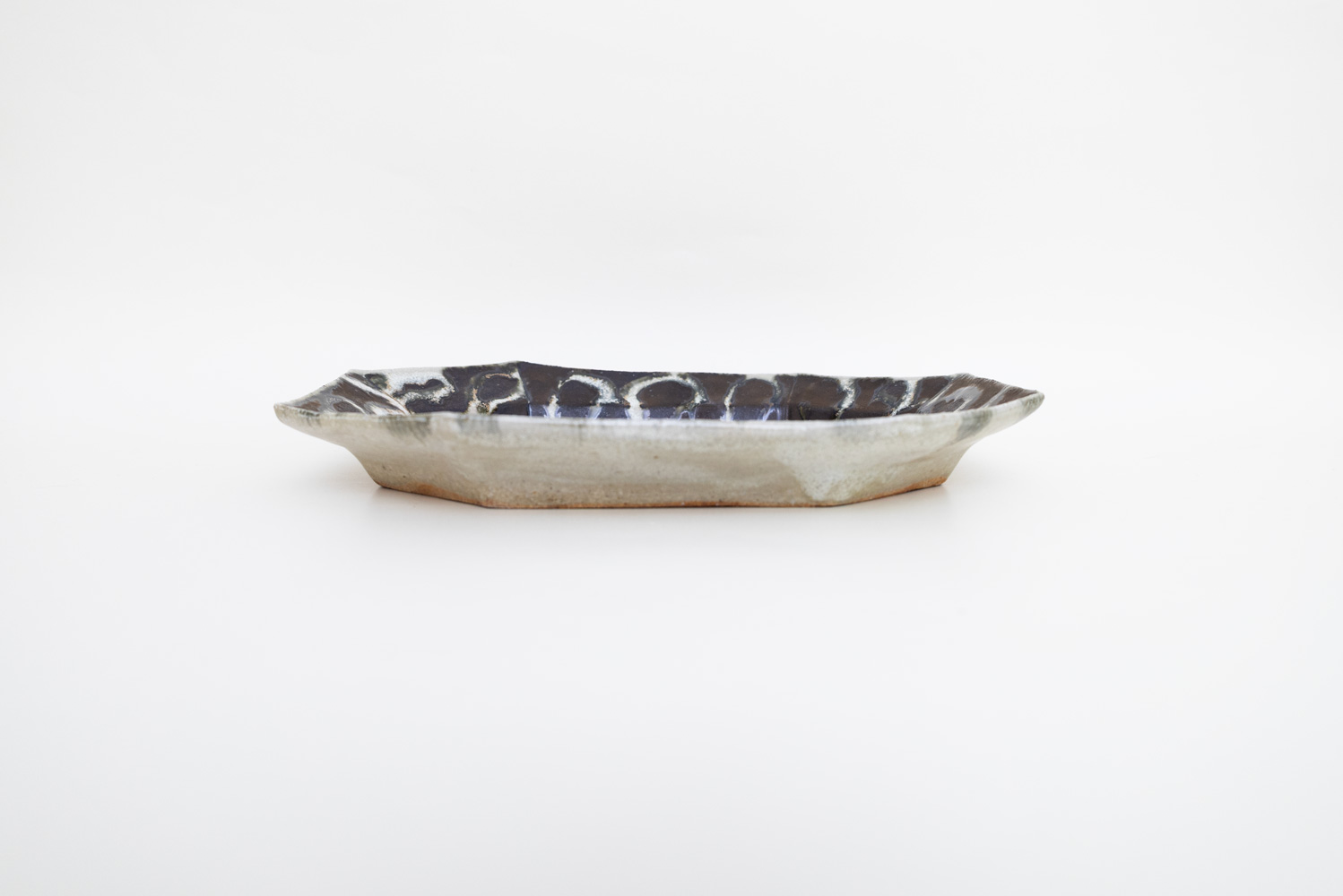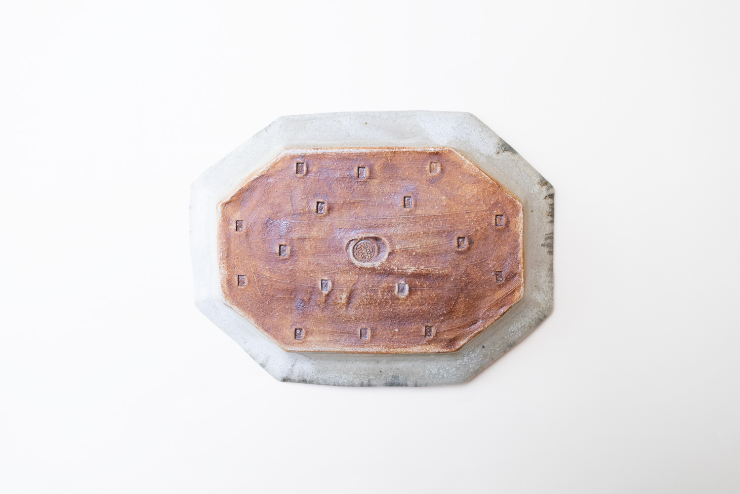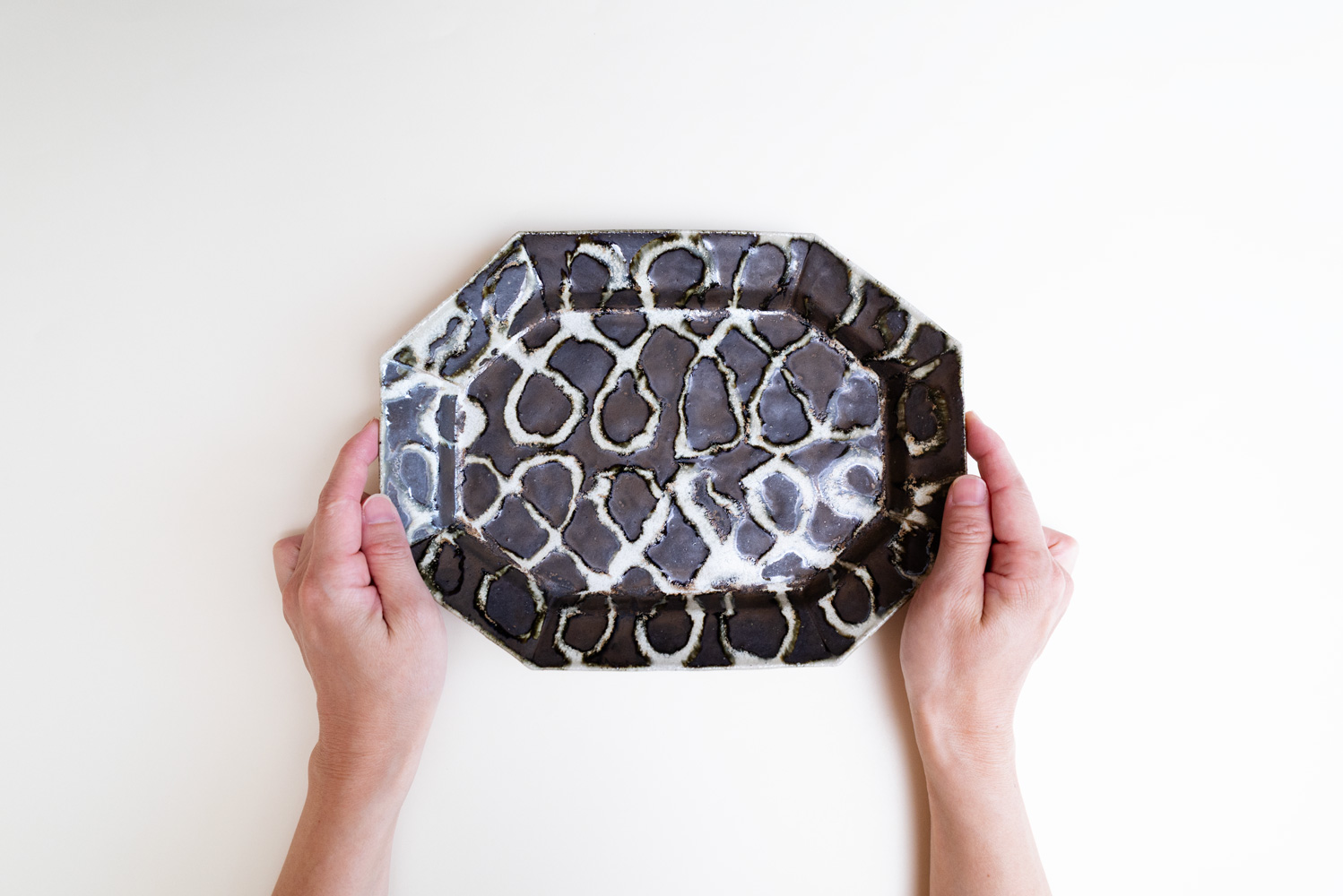 エッジの効いた深さのある八角形のリム皿です。独特の模様が印象的なツートン。白い部分はやや厚めに釉薬を掛け、それを流しながら模様をつくり、その後白い釉薬のかかっていない部分に錆釉を刷毛で塗るという、惜しみない手間がかけられています。それゆえに白と黒にほんの少しの立体感が生まれ、より躍動感のある仕上がりとなっています。