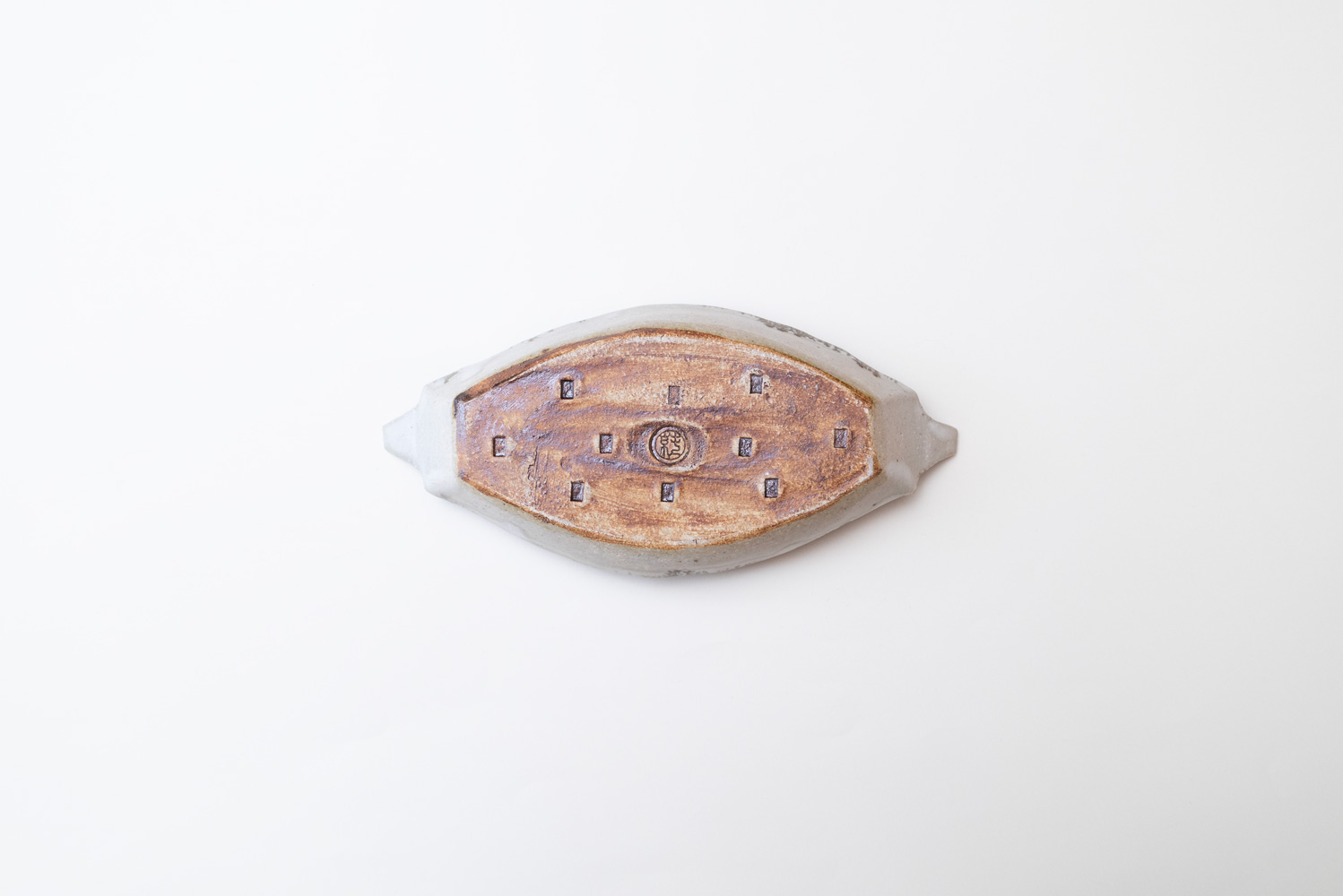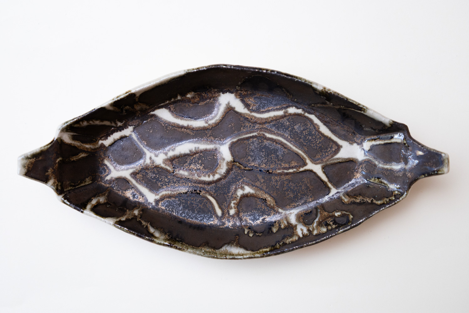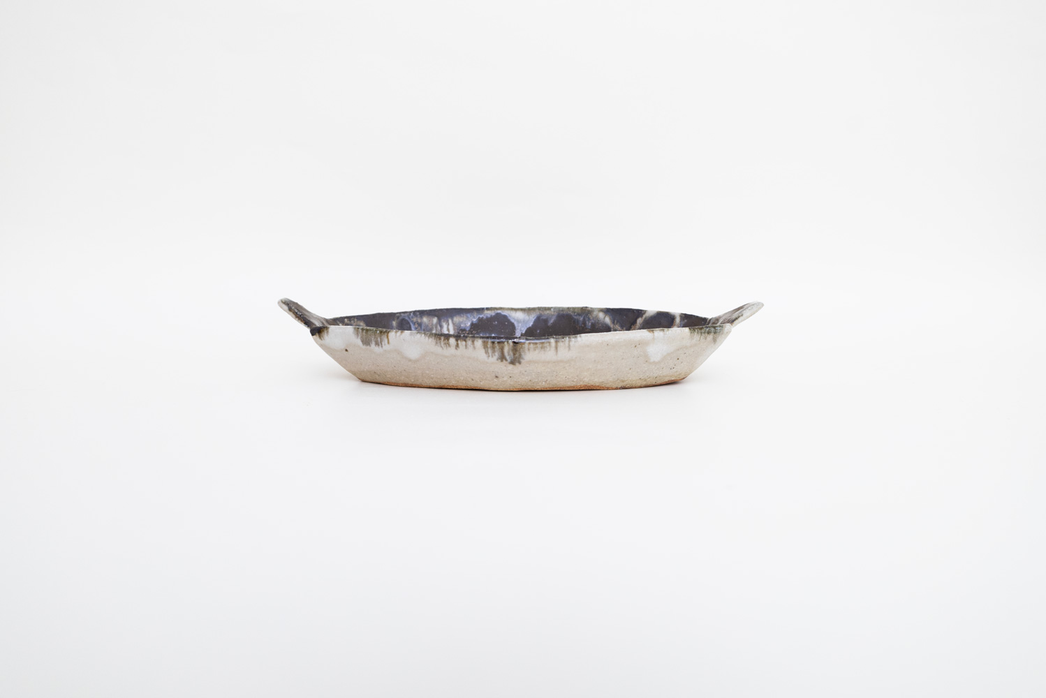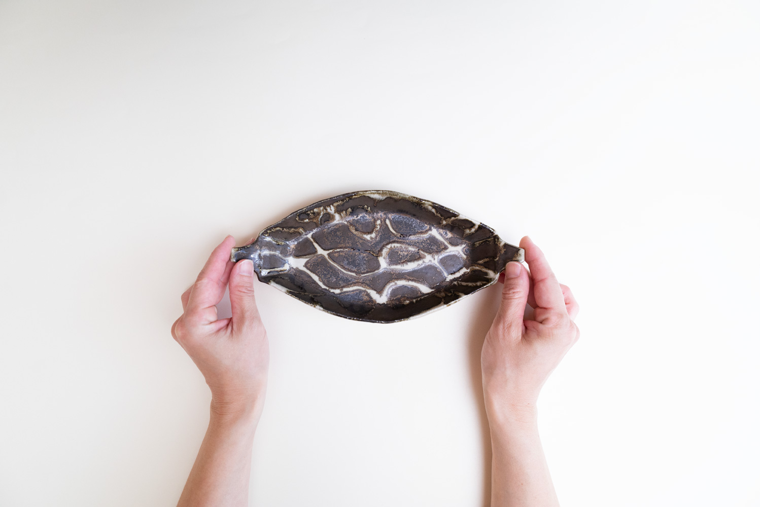 タコヤキの船皿をモチーフに生まれた船形皿。深さサイズ感ともに扱いやすい器です。また独特の模様が印象的なツートンは白い部分はやや厚めに釉薬を掛け、それを流しながら模様をつくり、その後白い釉薬のかかっていない部分に錆釉を刷毛で塗るという、惜しみない手間がかけられています。それゆえに白と黒にほんの少しの立体感が生まれ、より躍動感のある仕上がりとなっています。