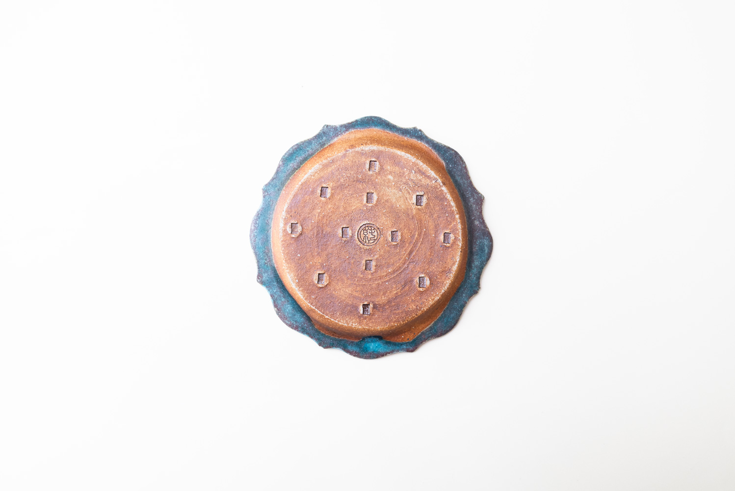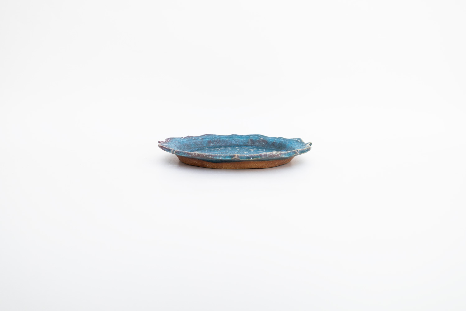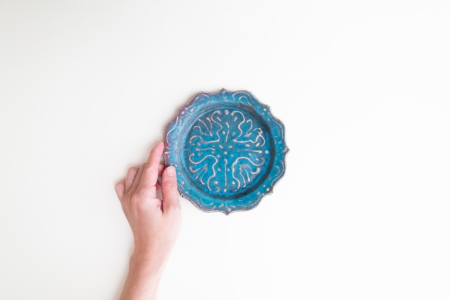 8つのトンガリが特徴的な綾花タイプのプレートです。イッチンの凹凸により生まれた釉薬の変化が美しく融合しています。「酸化」と「還元」が出やすい環境をあえて選び、安定させないからこそ一期一会がある「藤原ブルー」。青空のようなブルーも、黄昏時のようなブルーも、どちらに振れても、魅力的です。