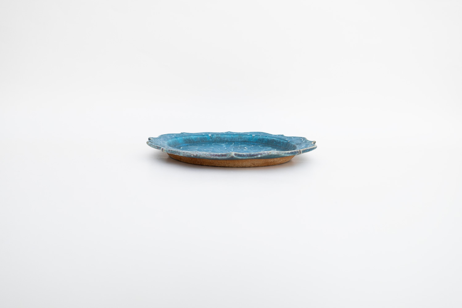 8つのトンガリが特徴的な綾花タイプのプレートです。イッチンの凹凸により生まれた釉薬の変化が美しく融合しています。「酸化」と「還元」が出やすい環境をあえて選び、安定させないからこそ一期一会がある「藤原ブルー」。青空のようなブルーも、黄昏時のようなブルーも、どちらに振れても、魅力的です。