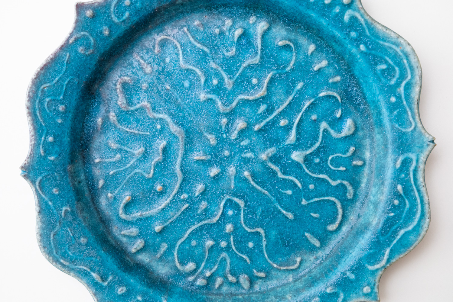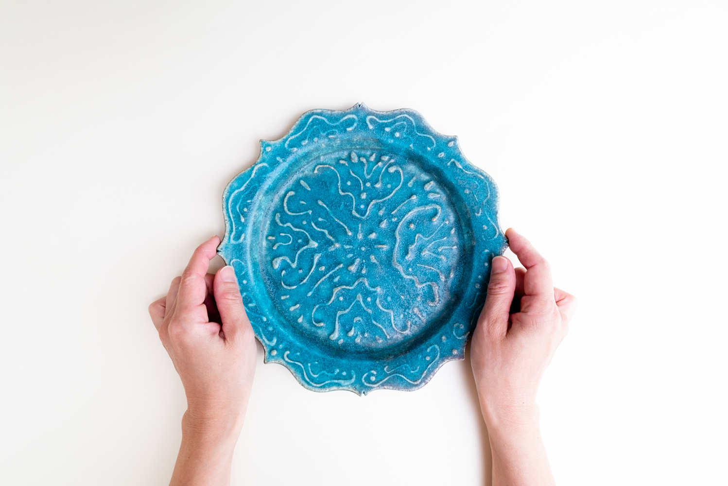 8つのトンガリが特徴的な綾花タイプのプレートです。イッチンの凹凸により生まれた釉薬の変化が美しく融合しています。「酸化」と「還元」が出やすい環境をあえて選び、安定させないからこそ一期一会がある「藤原ブルー」。青空のようなブルーも、黄昏時のようなブルーも、どちらに振れても、魅力的です。