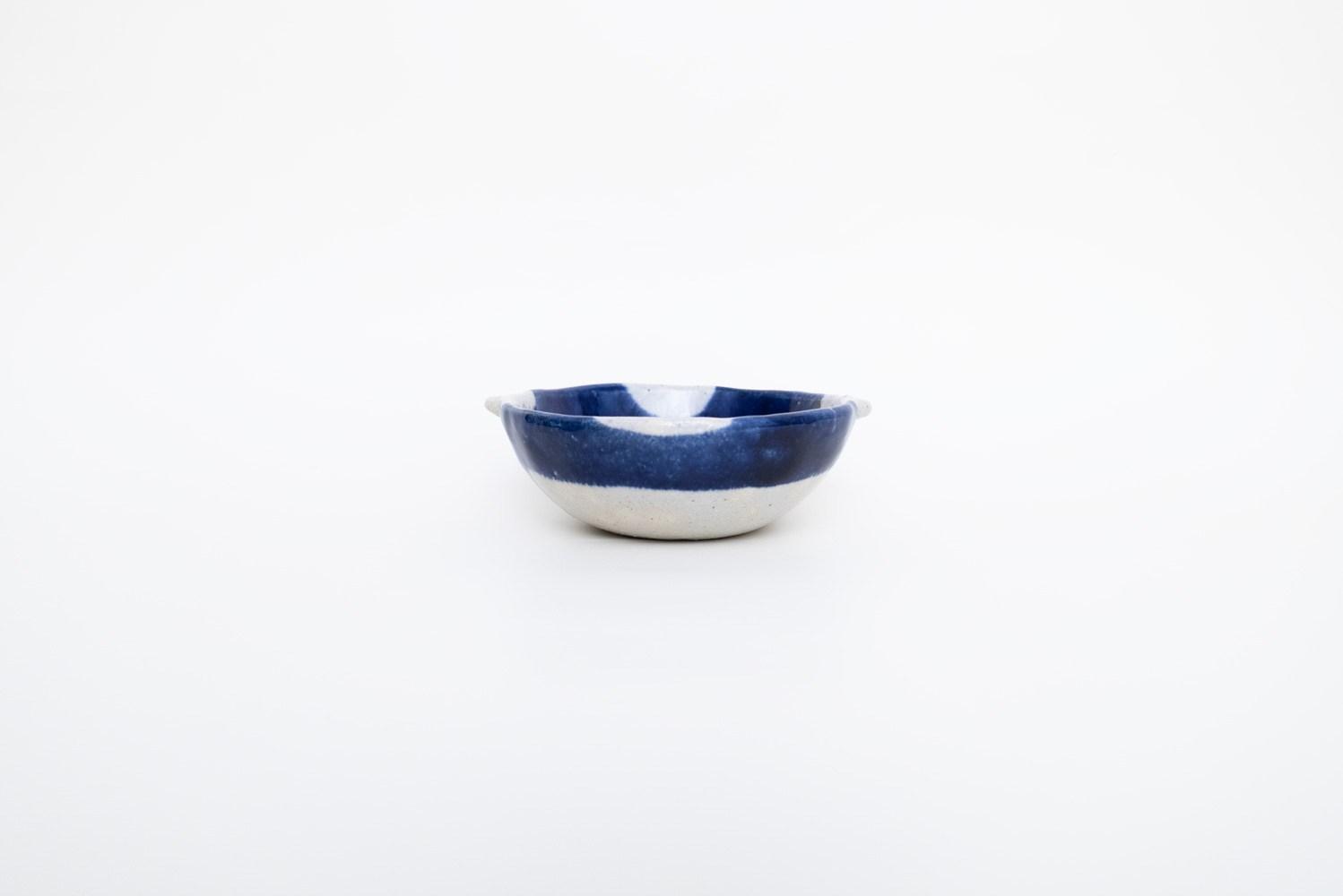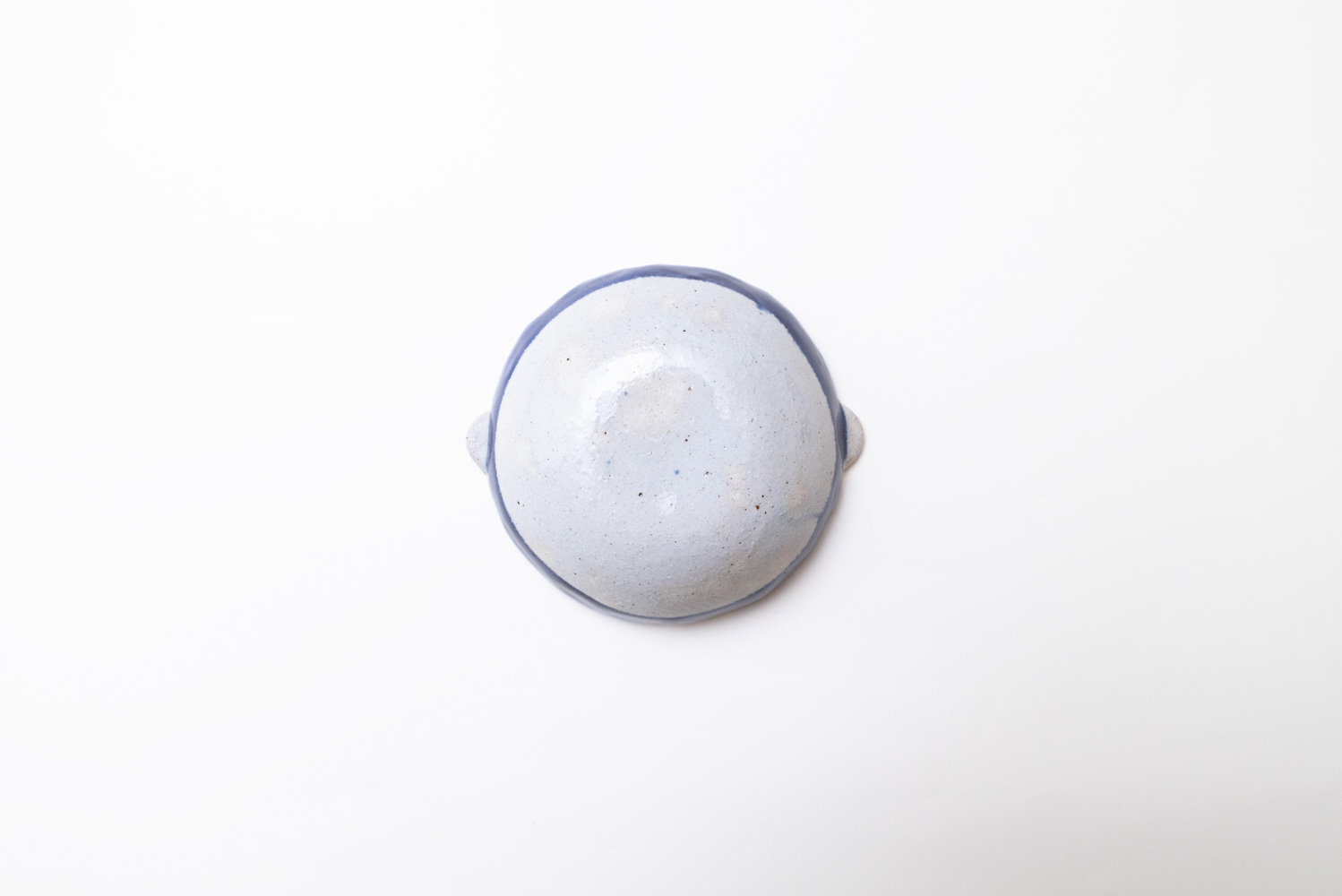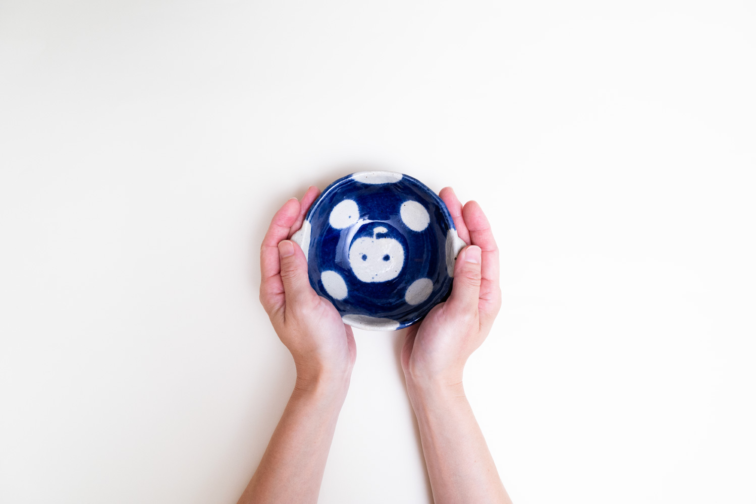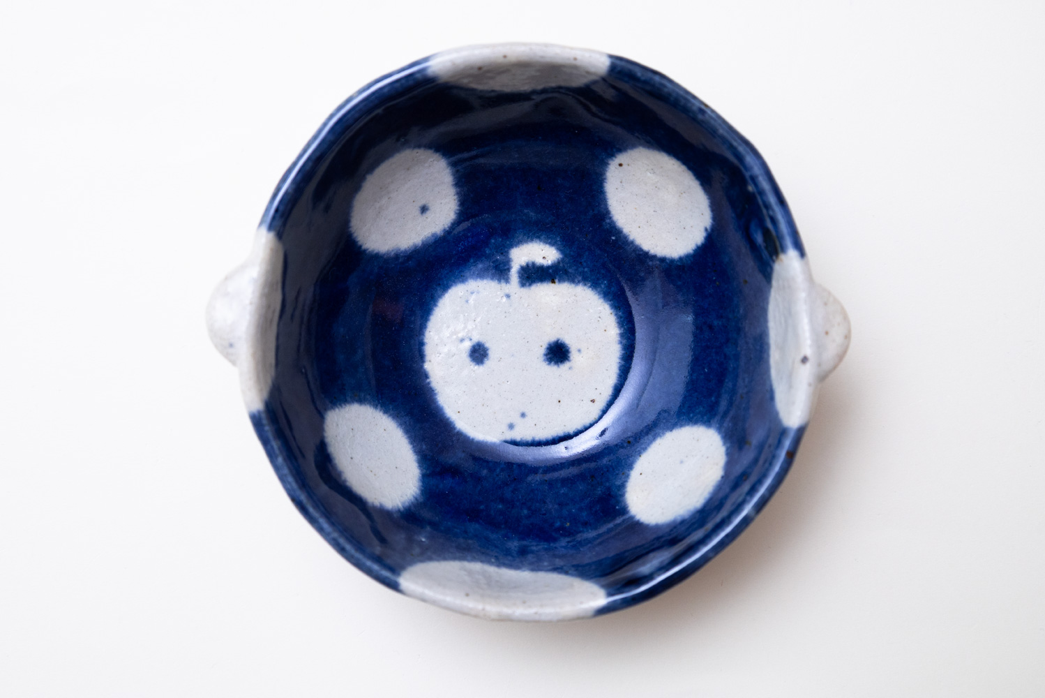 ころんと丸いフォルムと小さな耳が可愛らしい、やや浅めのボウルです。模様の部分に釉薬がかからないように、撥水剤でマスキングする技法で描かれています。