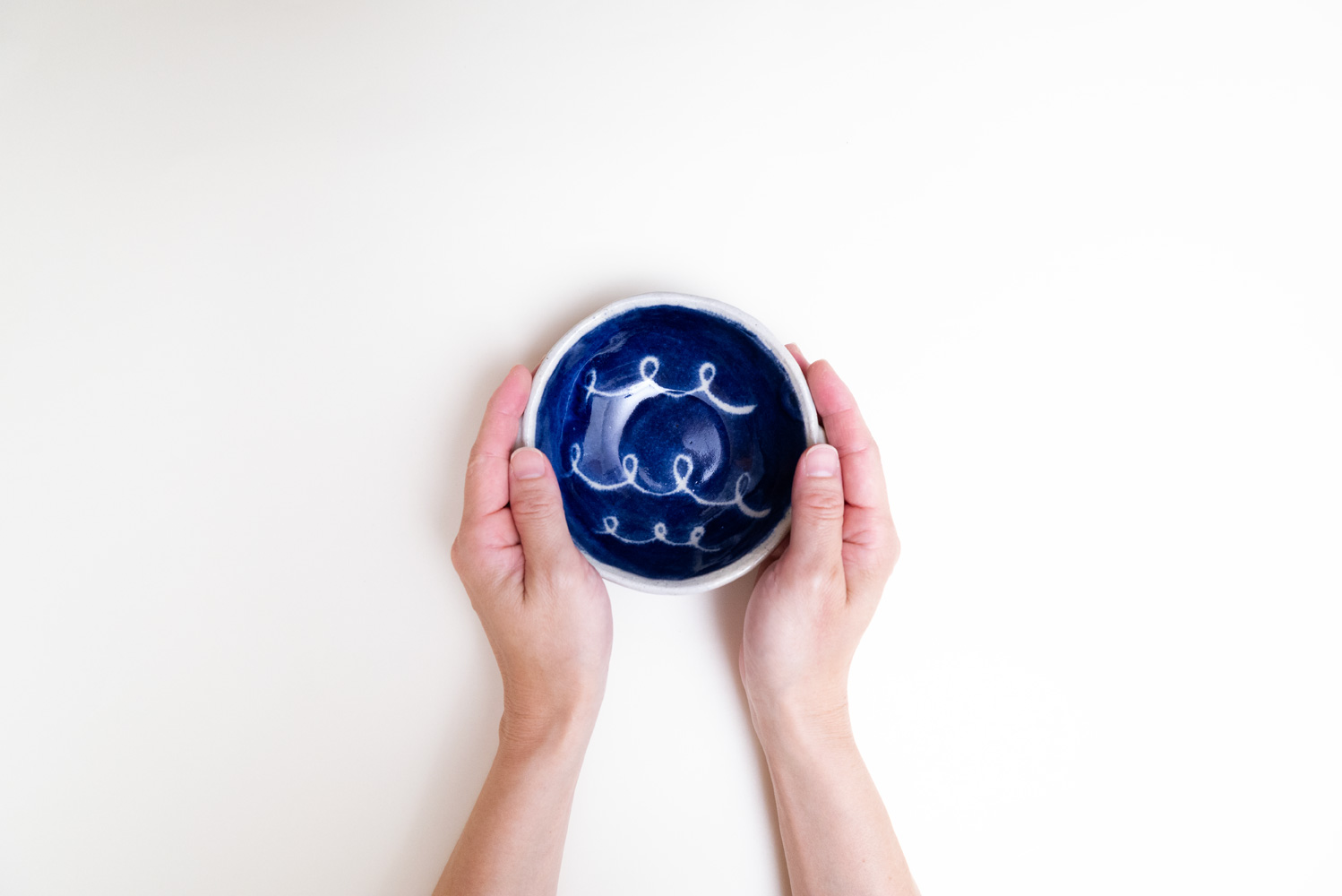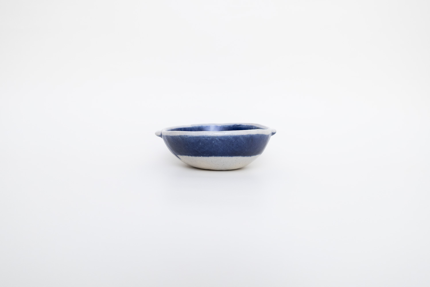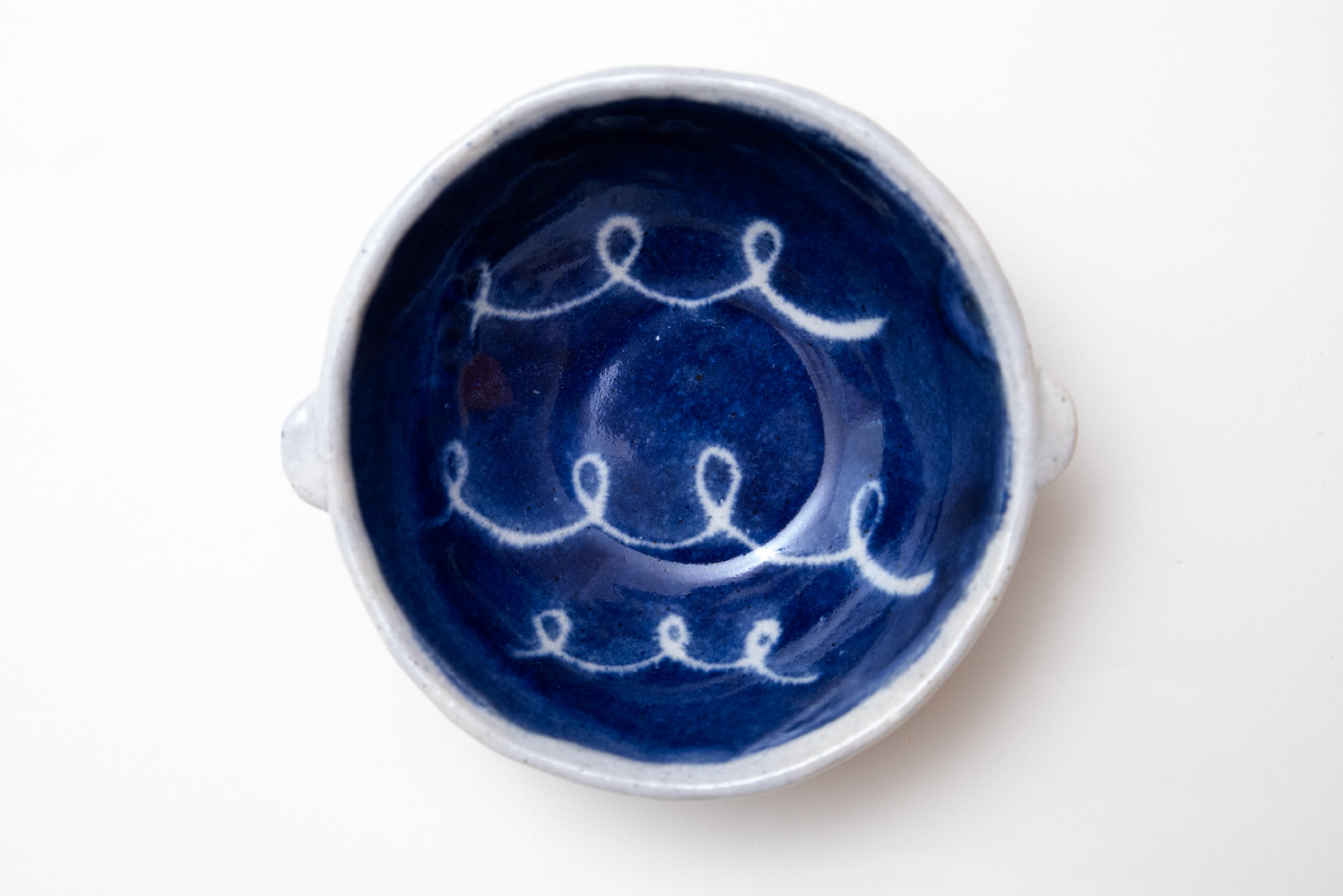 ころんと丸いフォルムと小さな耳が可愛らしい、やや浅めのボウルです。模様の部分に釉薬がかからないように、撥水剤でマスキングする技法で描かれています。