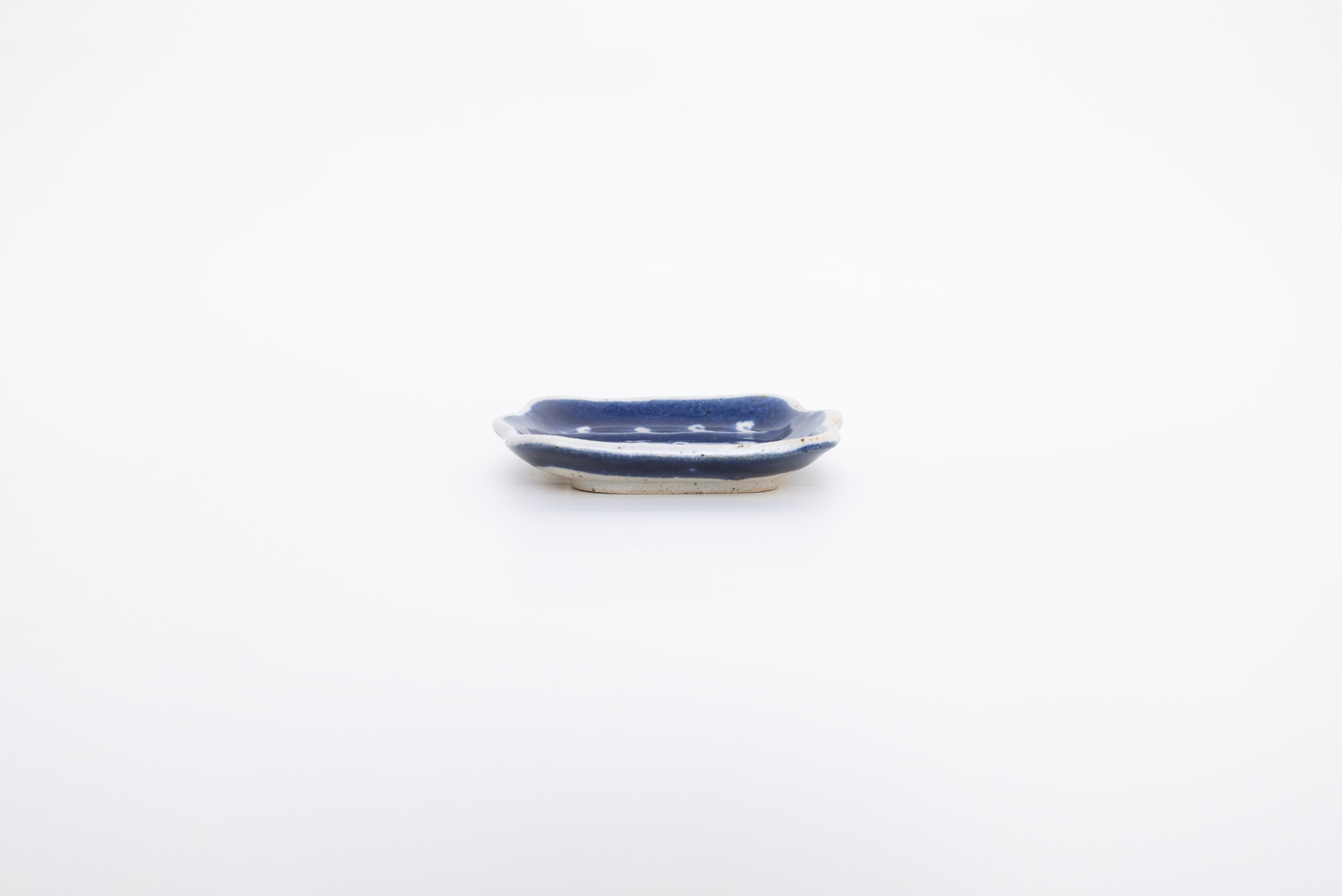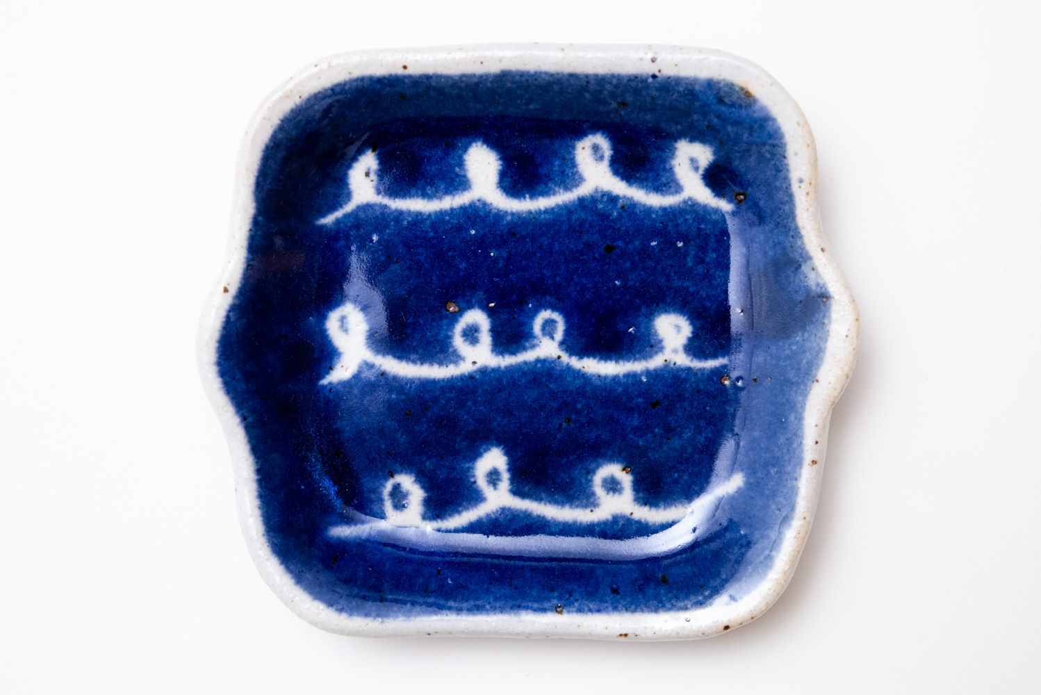 ちょこっと付いた耳がかわいらしい小皿です。模様の部分に釉薬がかからないように、撥水剤でマスキングする技法で描かれています。