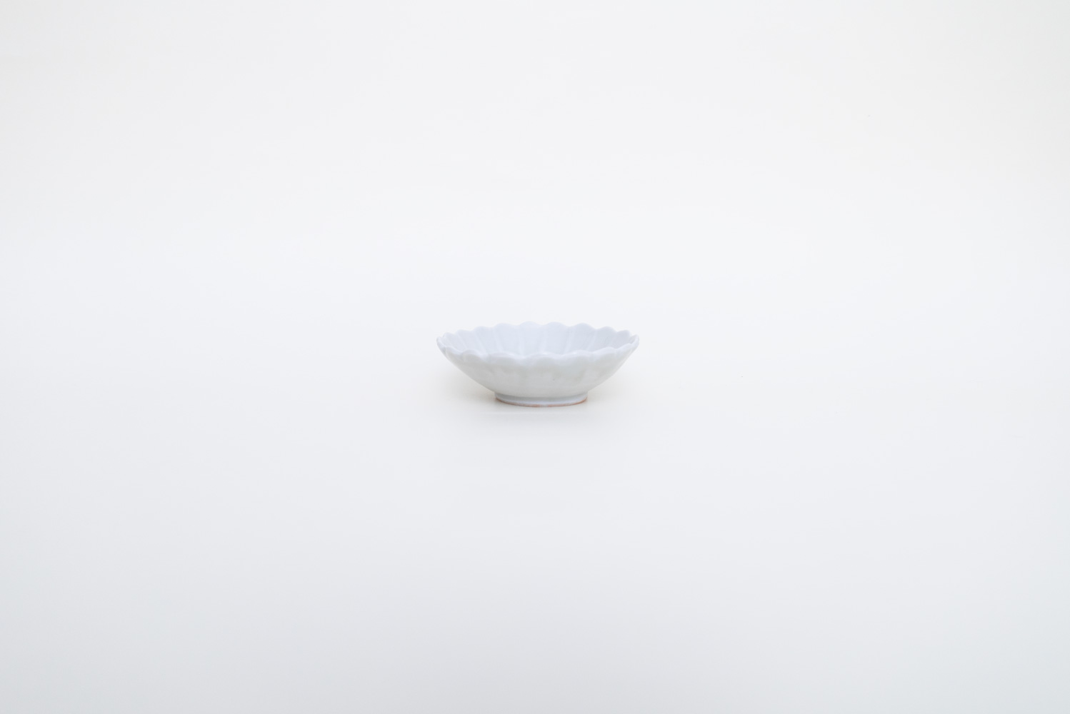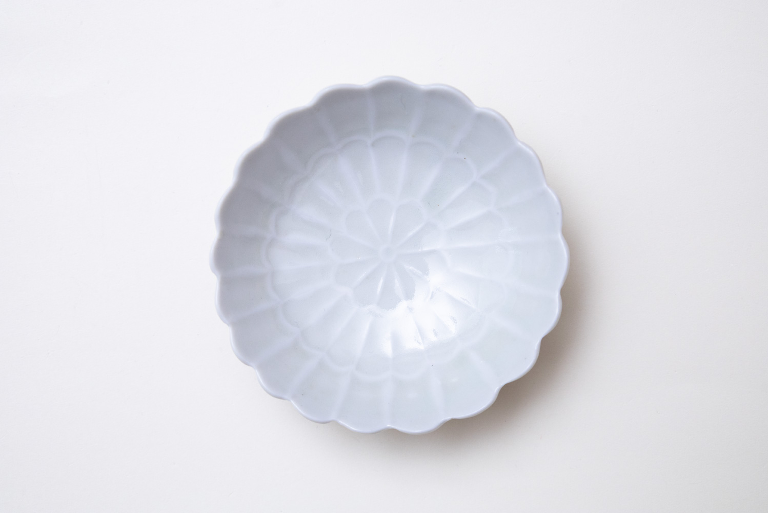 しっとりとした灰青色の釉薬が美しい菊小鉢。菊の花をかたどった端正な彫り模様に、やわらかく溜まった釉薬が陰影をつくり、光の角度によって上品な艶めきを見せます。副菜やお浸し、果物などをそっと盛るだけで、食卓がぐっと引き締まり、どこか凛とした雰囲気に。