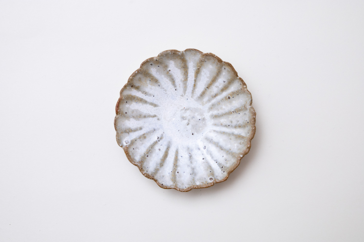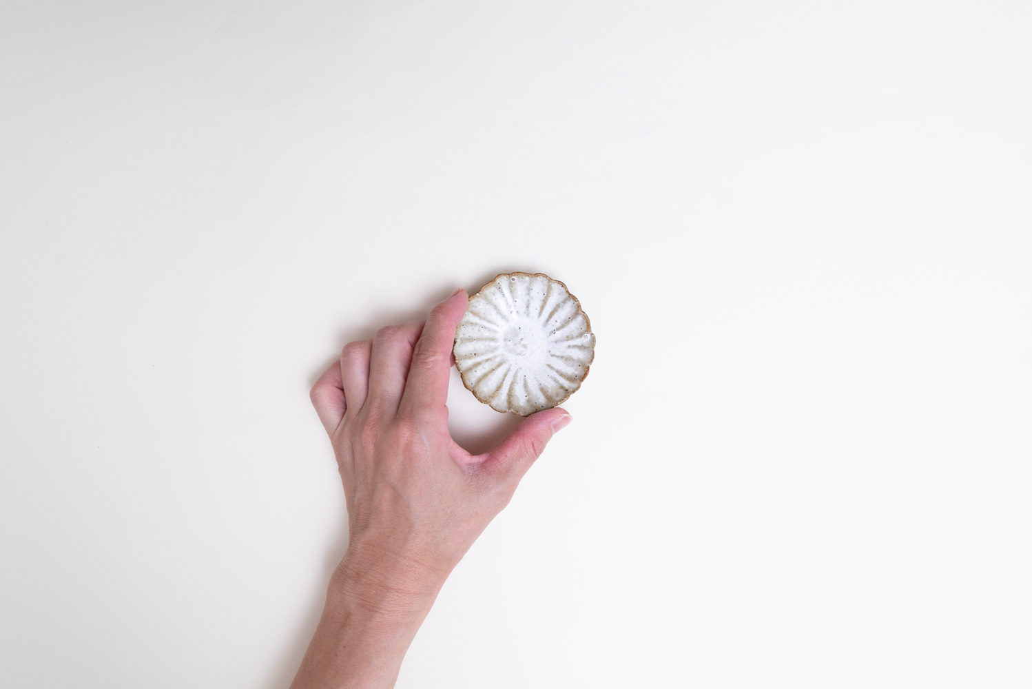 マーガレットの花びらをかたどった可憐な小皿。放射状に広がるレリーフが料理を美しく引き立て、食卓にそっと花を咲かせてくれる一枚です。薬味をのせたり、小さめなのでプレートの上にもどうぞ。