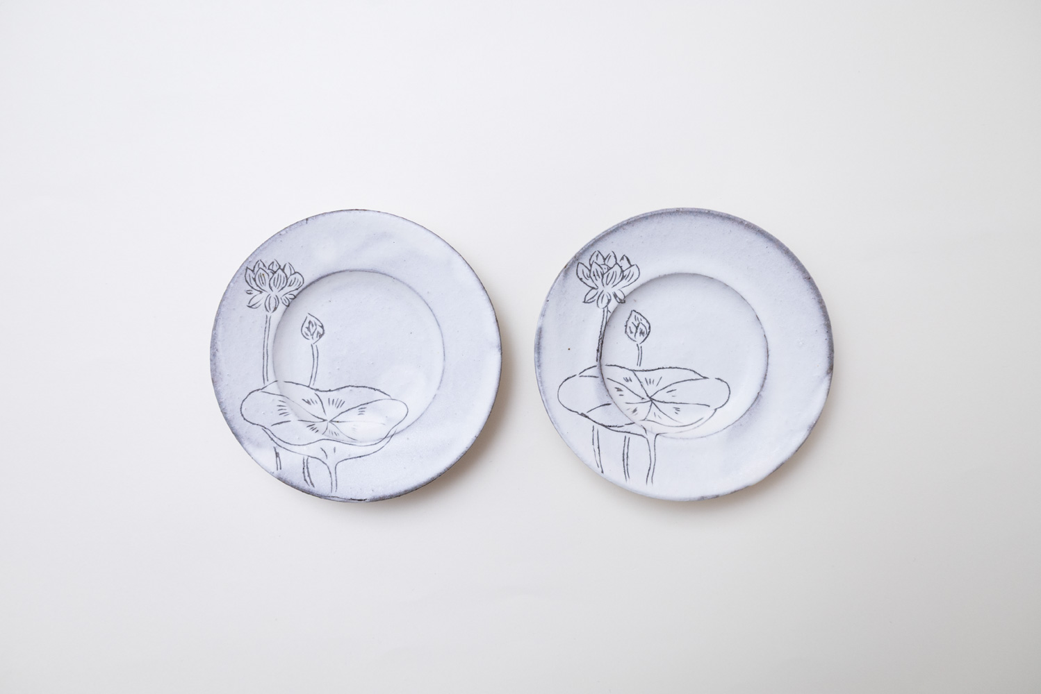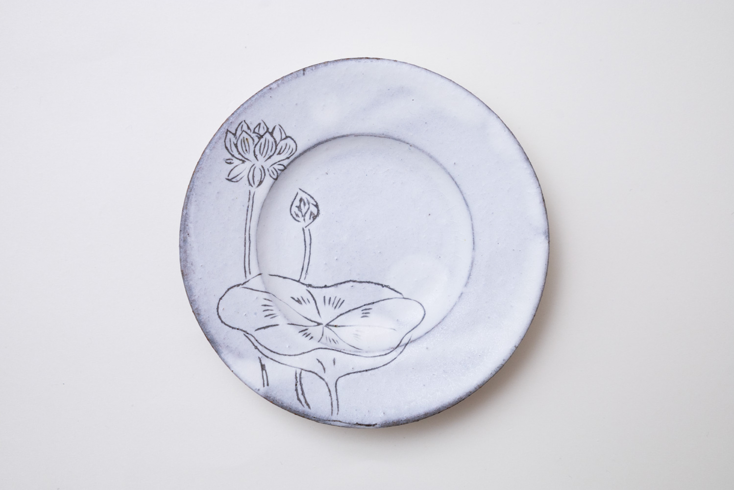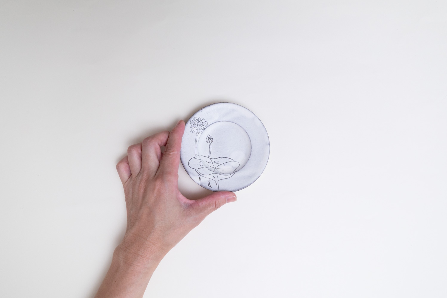 掻き落としで描かれたハスの葉や花はどこか涼やかで、心を鎮めてくれるような佇まい。お漬物や薬味、和菓子などを少し添えるだけで、食卓に凛とした空気感をもたらします。