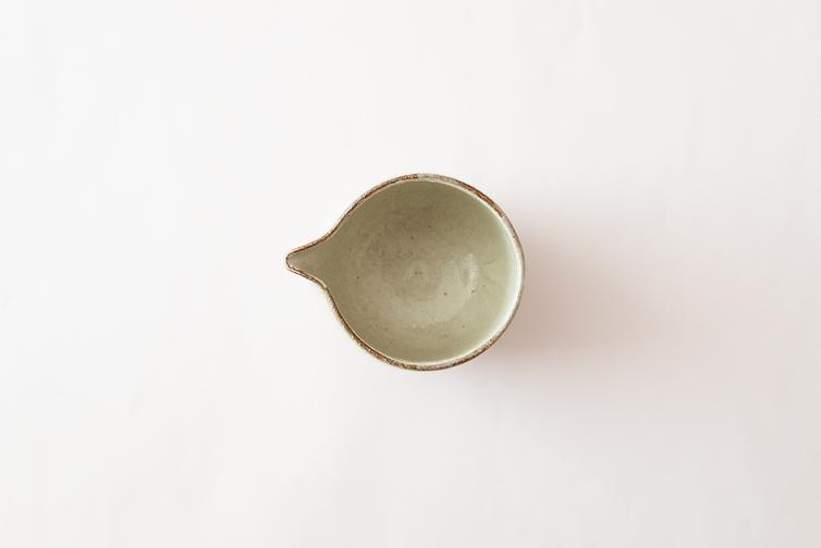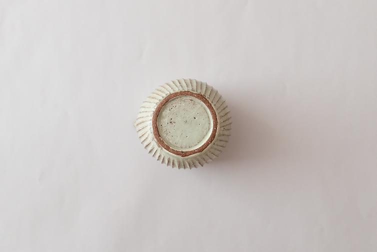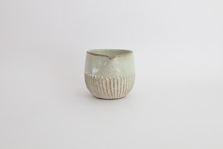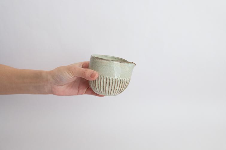 丸みのあるシルエットと半ばまでのしのぎのバランスがかわいらしい片口です。真っ白すぎないふんわりとした粉引の色合いも素敵な作品です。