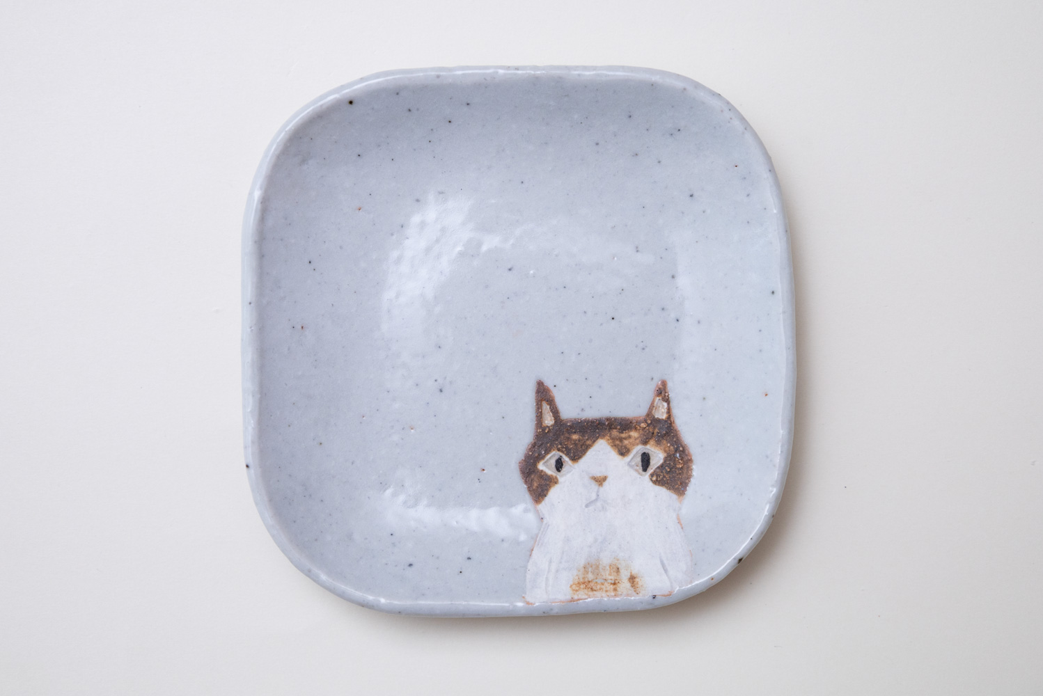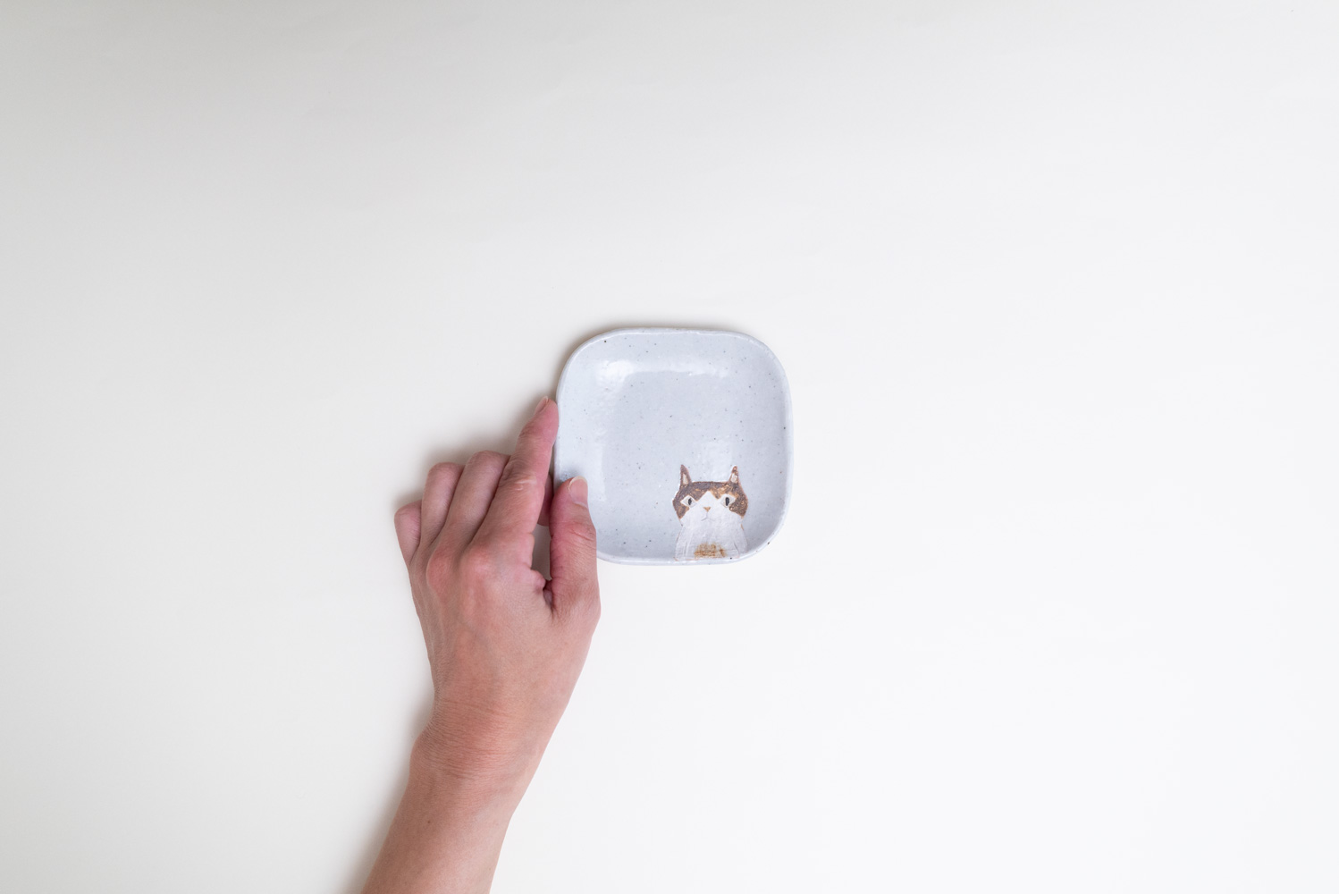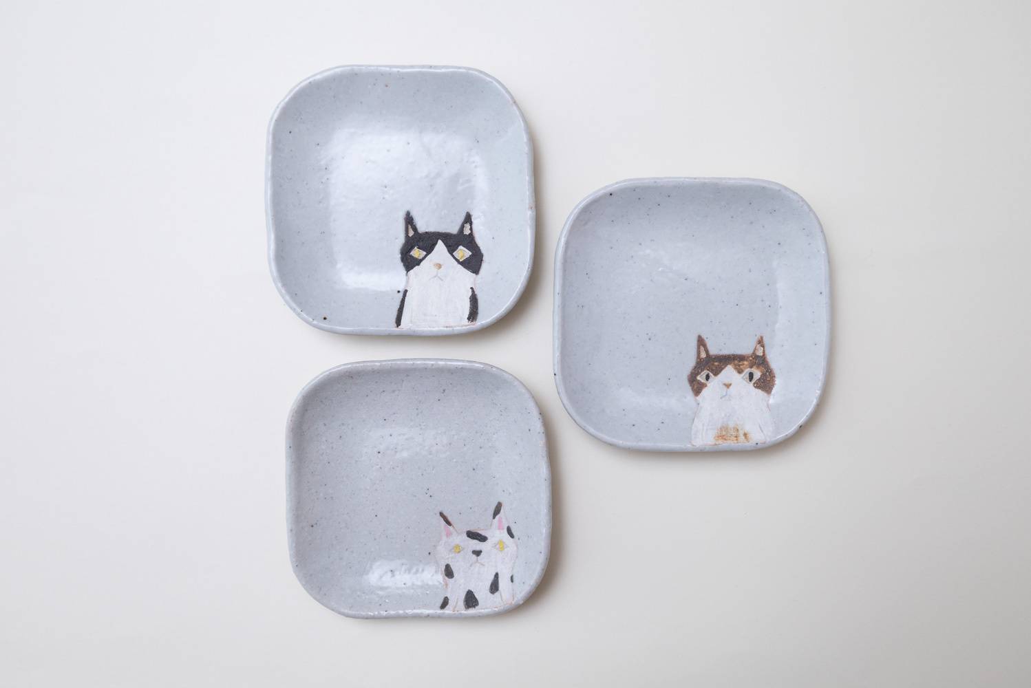 四角い豆皿に宮崎さんならではの独特のタッチで、思わずクスッとなってしまう動物が描かれています。集めて並べれば、まるで動物たちが食卓に遊びに来たようです。