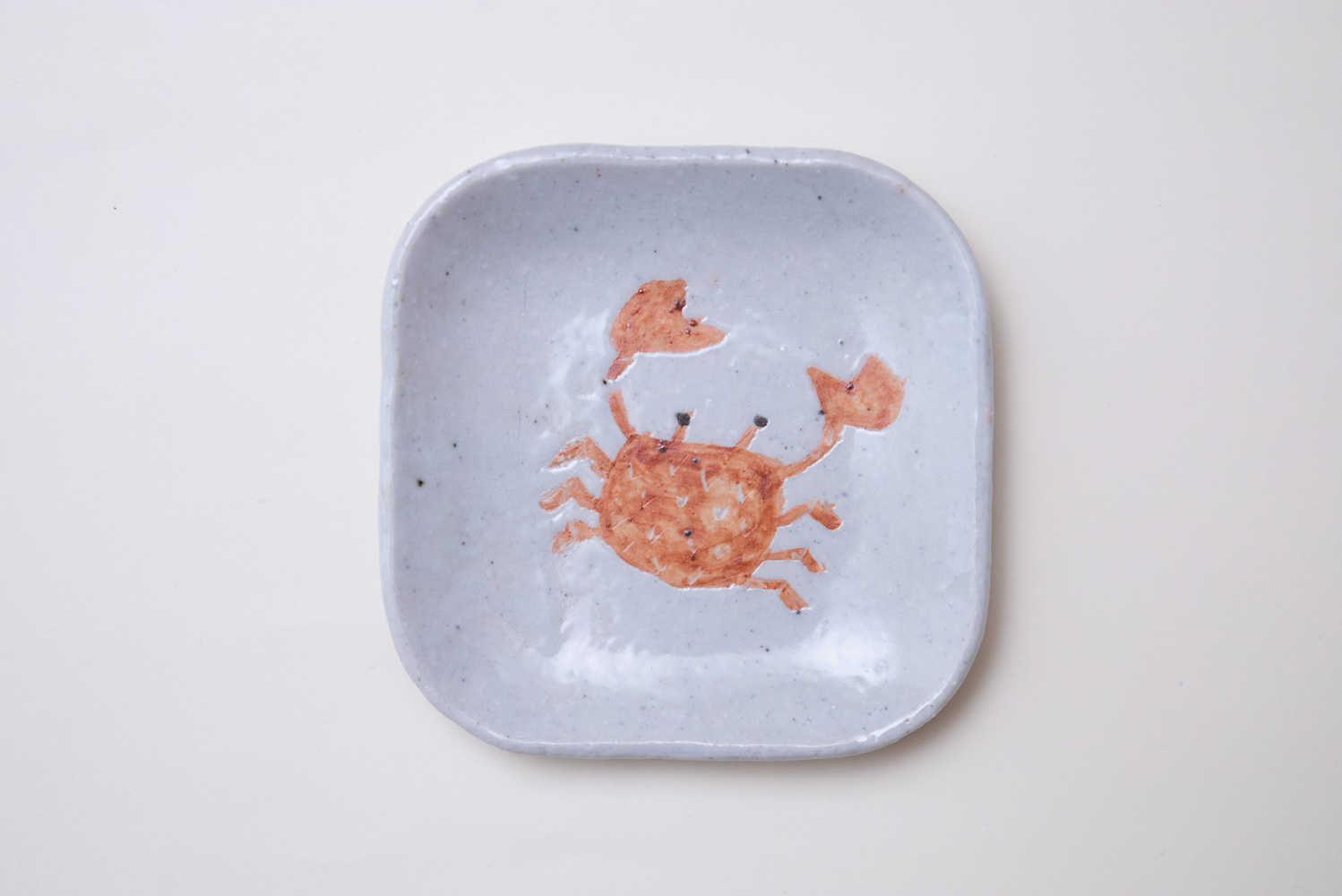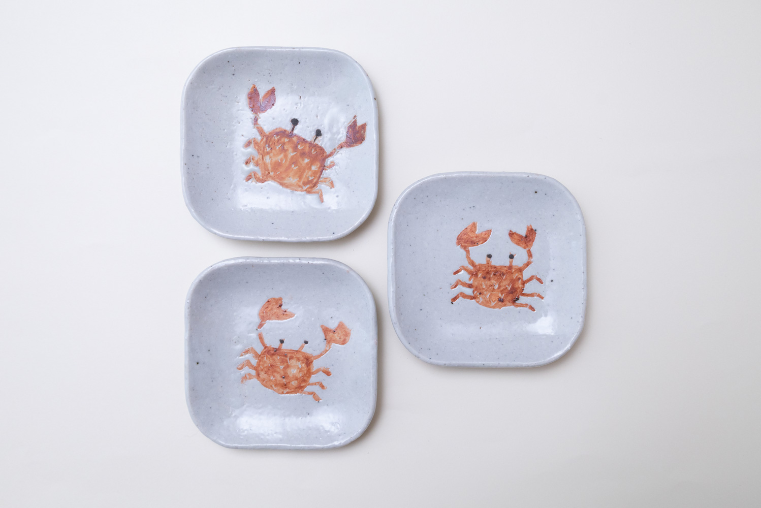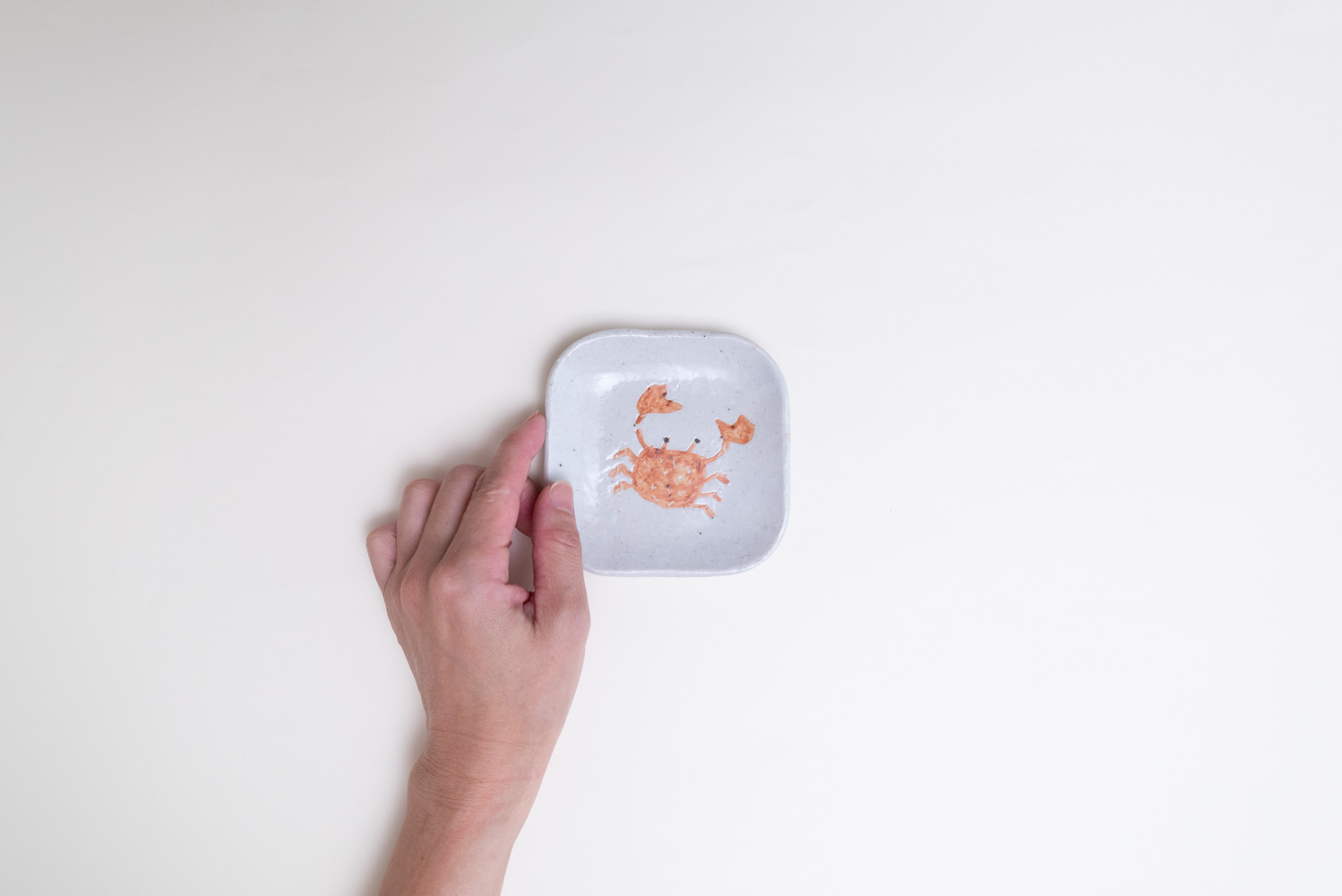 四角い豆皿に宮崎さんならではの独特のタッチで、思わずクスッとなってしまう動物が描かれています。集めて並べれば、まるで動物たちが食卓に遊びに来たようです。