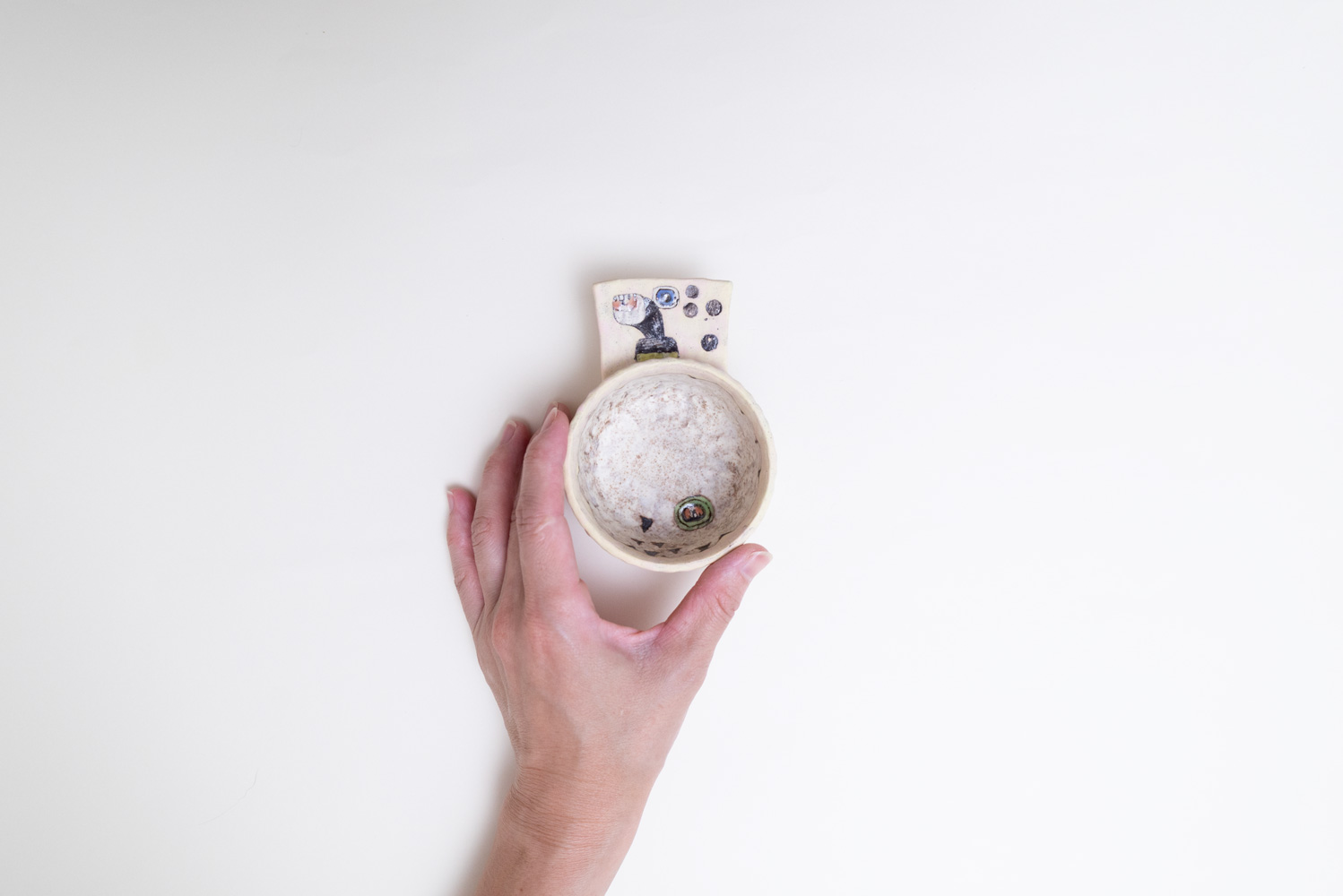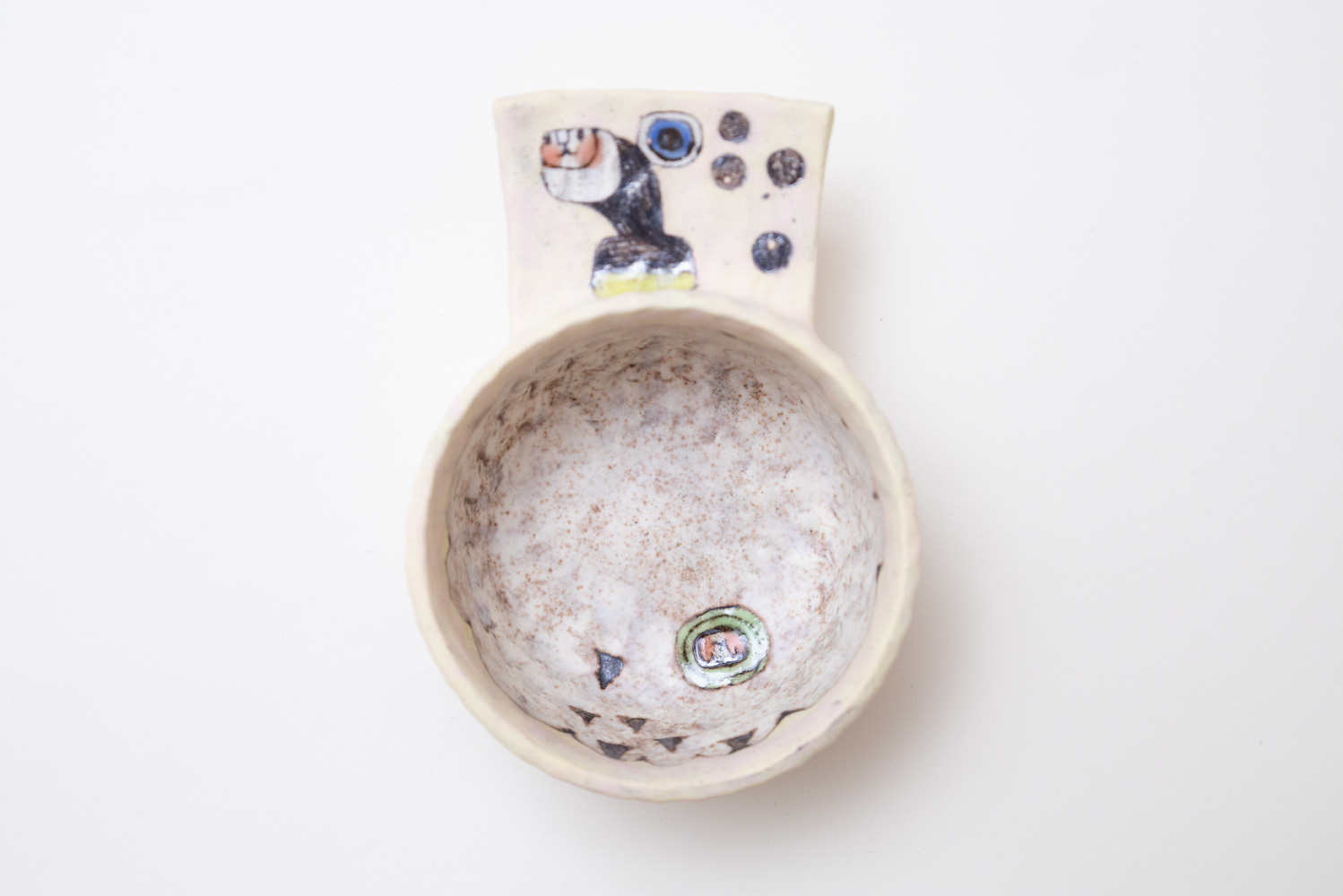 独特の世界観と抜群のカラーバランス。紐作りによる成型の手痕から生まれる絶妙な陰影と造形力。ひとつひとつの作品が唯一無二であるという存在感がそこにあります。少しざらっとしたマットな質感ですが、色滲みしにくくなっています。