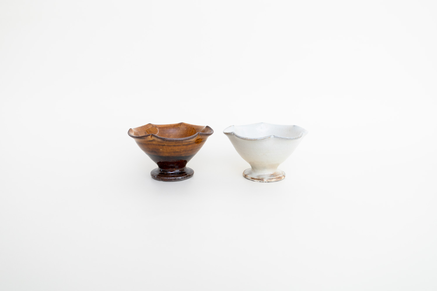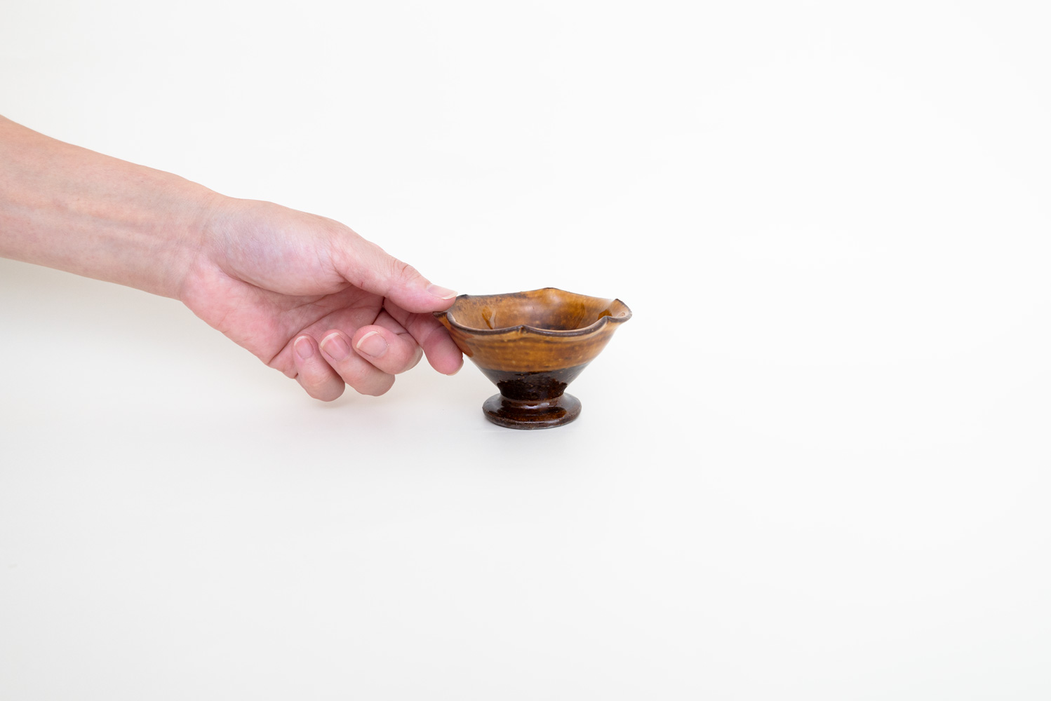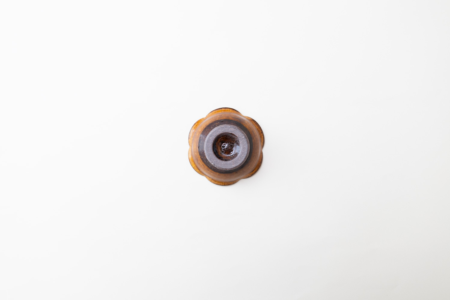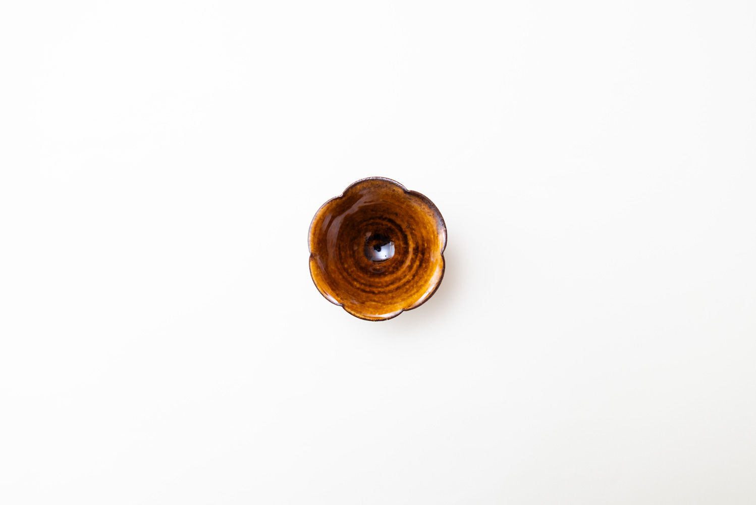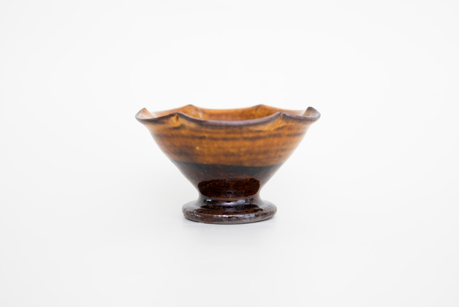 あめ色の深みある飴釉が上品に艶めく、ヒメサイズの高台鉢です。花びらのようにやわらかく波打つ輪花の形が愛らしく、食卓に置くだけで優しい存在感を放ちます。小鉢として和え物や前菜を盛ったり、ナッツやデザートを少しずつ添えるのにちょうど良いサイズ感。高台付きなので、軽やかで品のある佇まいになり、特別感のある一品です。