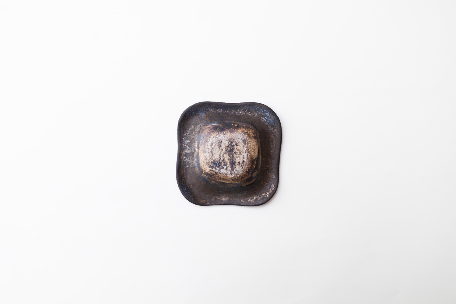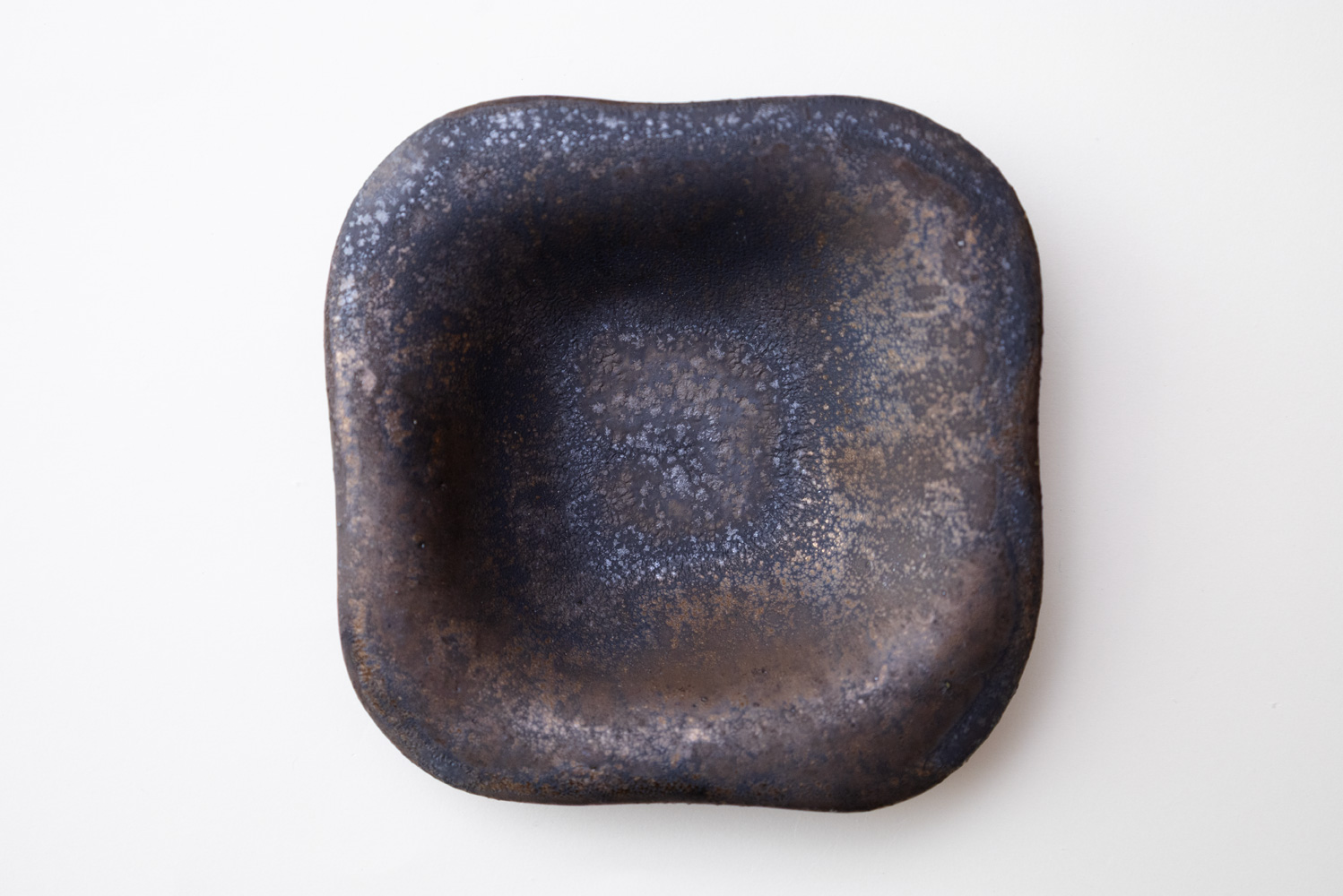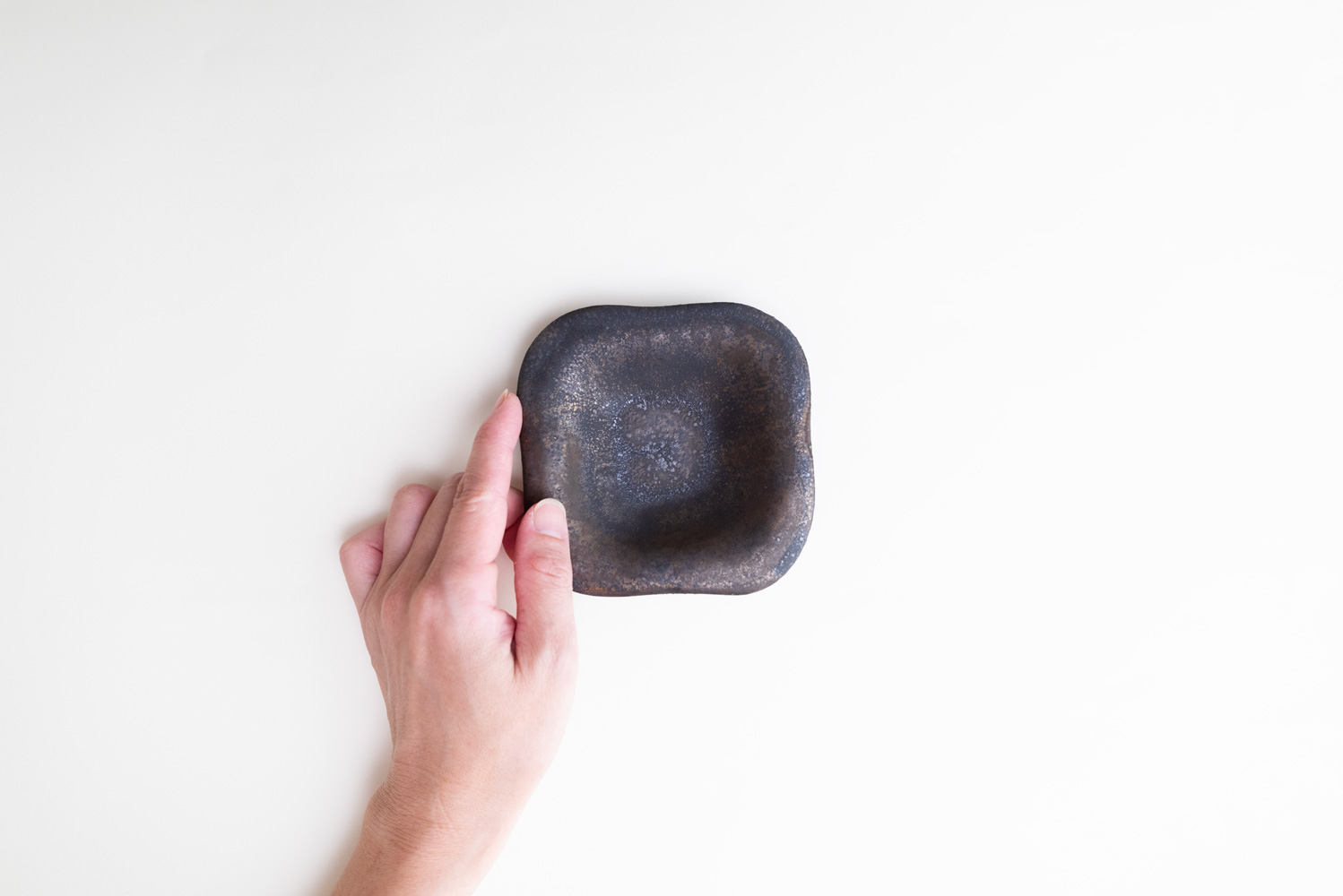 名前の由来は「踊る」。踊るようにやわらかく揺らいだ縁が印象的な、存在感のある小鉢です。マットな質感のマンガン釉は、黒と焦げ茶が混じり合い、金属のような深い輝きをまとった表情を見せます。光の加減で見える結晶模様が、静かな中に動きを感じさせる一品です。