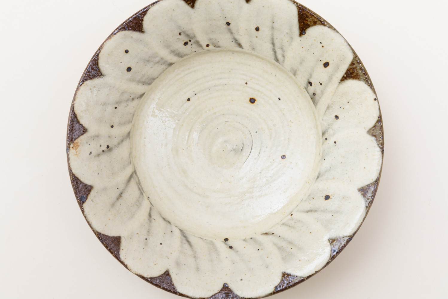 中央のフラットな面は盛り付けがしやすく、縁に施された花びら状のデザインが料理を引き立てます。