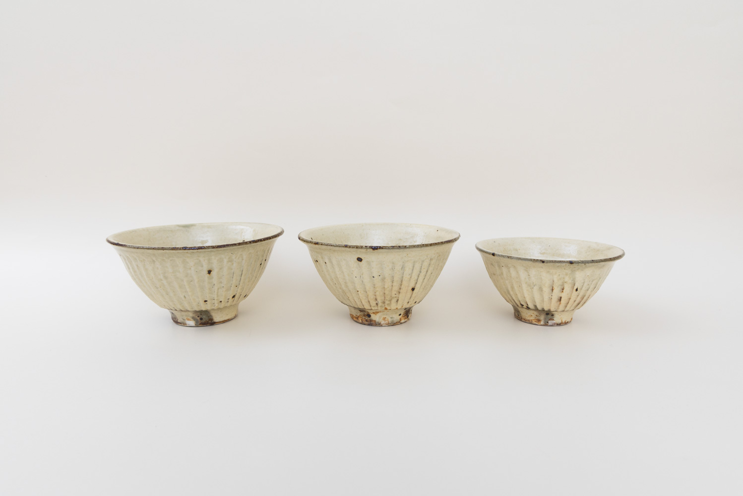 しのぎが美しい飽きのこないスタンダードな形めし碗です。土らしい温かみを感じるほんのり淡い黄色は、甘すぎない雰囲気に纏めてくれるので、和食などの素朴なお料理にも良く似合います。大・中・小の3種類のサイズと、鉄散・キナリ・青灰の3種類があるのでご夫婦やご家族で揃えても良いですね。