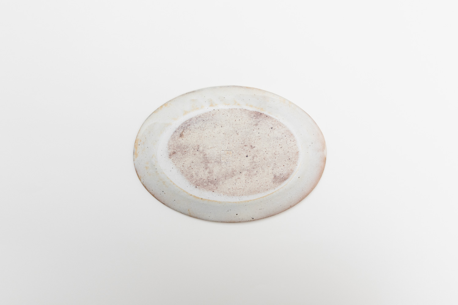 柔らかな白釉に、焼成によるほのかな焦げと景色が浮かぶ楕円のリム長皿。その上を一本の荒鉄線がすっと走り、素朴さの中にほどよい緊張感を添える一枚です。取り皿としてはもちろん、パンや焼き菓子、前菜、副菜、おつまみなどの“ちょこっと盛り”にちょうど良い大きさです。