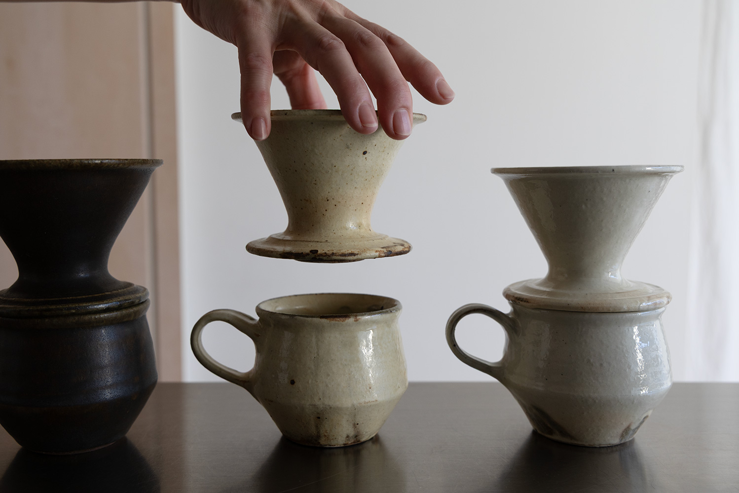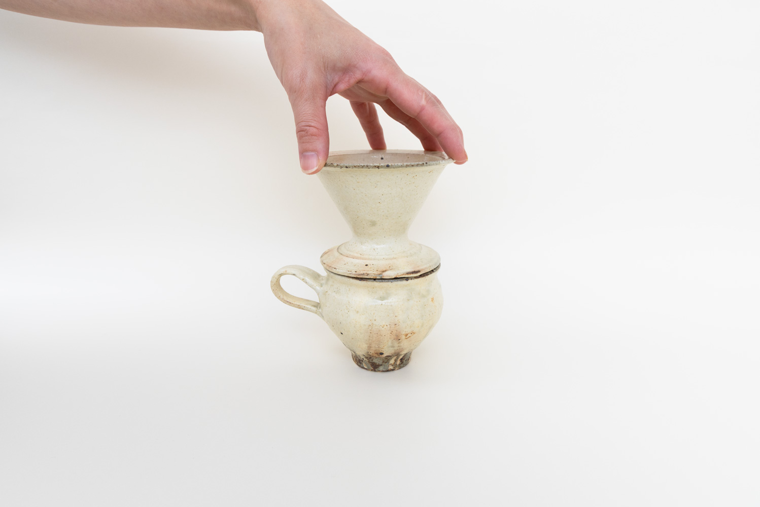 お好きなマグカップの上にそっと乗せて、1杯分を丁寧に淹れられる小さな陶製ドリッパーです。やわらかな手しごとの表情と、焼成によって現れる鉄散や焦げのニュアンスが、毎日のコーヒー時間を少し特別なものにしてくれます。内側にはあえてスリット(溝)を設けていないため、湯の抜けがゆっくり。粉にしっかりとお湯が行き渡り、雑味の少ないやさしい味わいに抽出されます。一杯分を淹れるのにちょうど良いサイズで、普段使いのマグに合わせやすい形。コーヒー好きな方への贈り物にもぴったりです。色は鉄散・錆釉・キナリの3種類。色違いで揃えて、気分で使い分けるのもおすすめです。