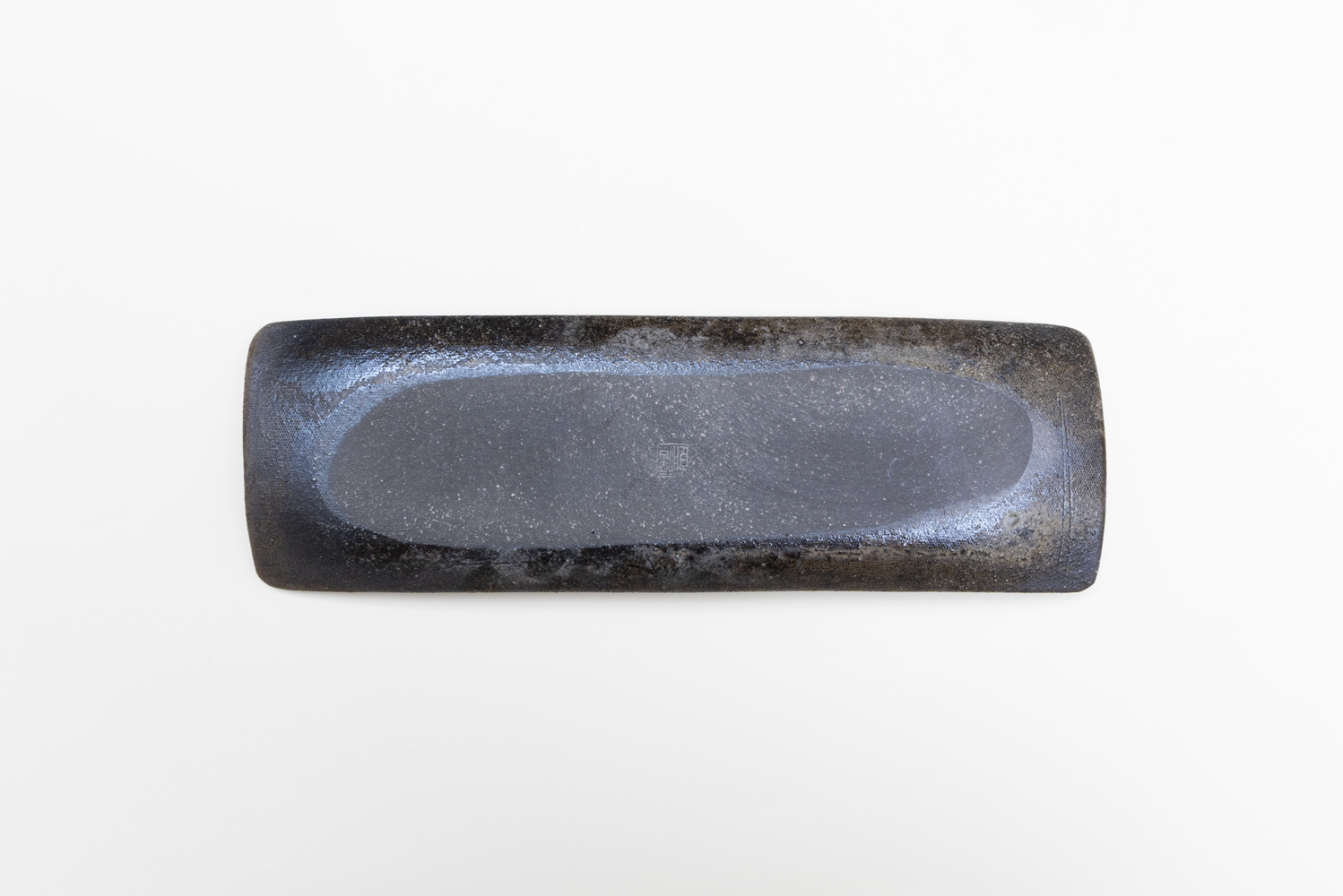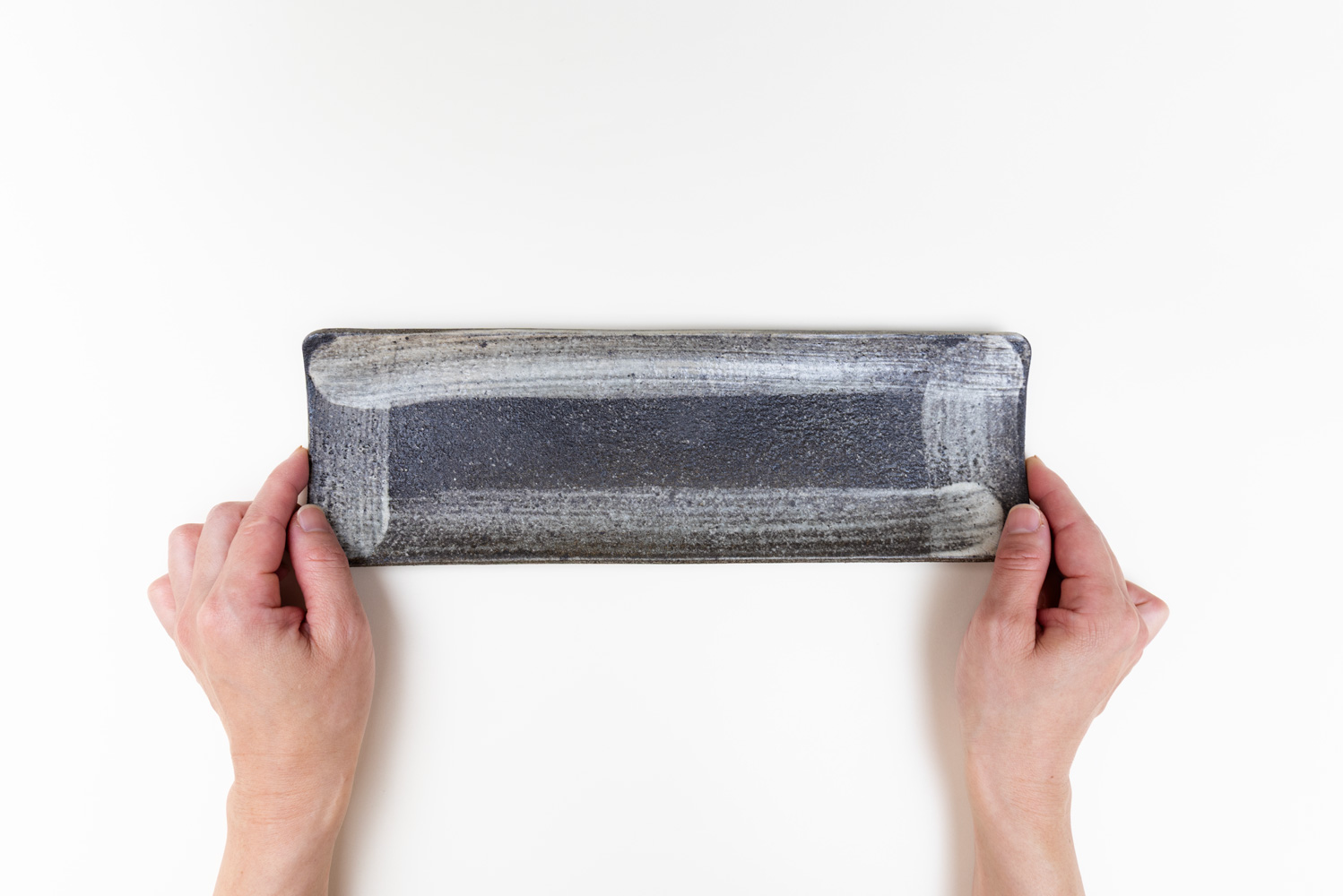 定番として長く愛されているL彫シリーズをもとに、作家さんと一緒にアイデアを重ねながら生まれた特別仕様の長皿です。当初はL字に刷毛目を入れるデザインからスタートしましたが、「いっそ全周に刷毛目を入れることでよりバランスが良く、表情豊かになるのでは」と試行錯誤を重ね、現在の姿に落ち着きました。刷毛目の重なりがまるでチェック柄のネルシャツのような、どこか懐かしく温かな雰囲気を漂わせます。細長いフォルムは、焼き魚や前菜、天ぷら、チーズや果物の盛り合わせなどにもぴったりです。