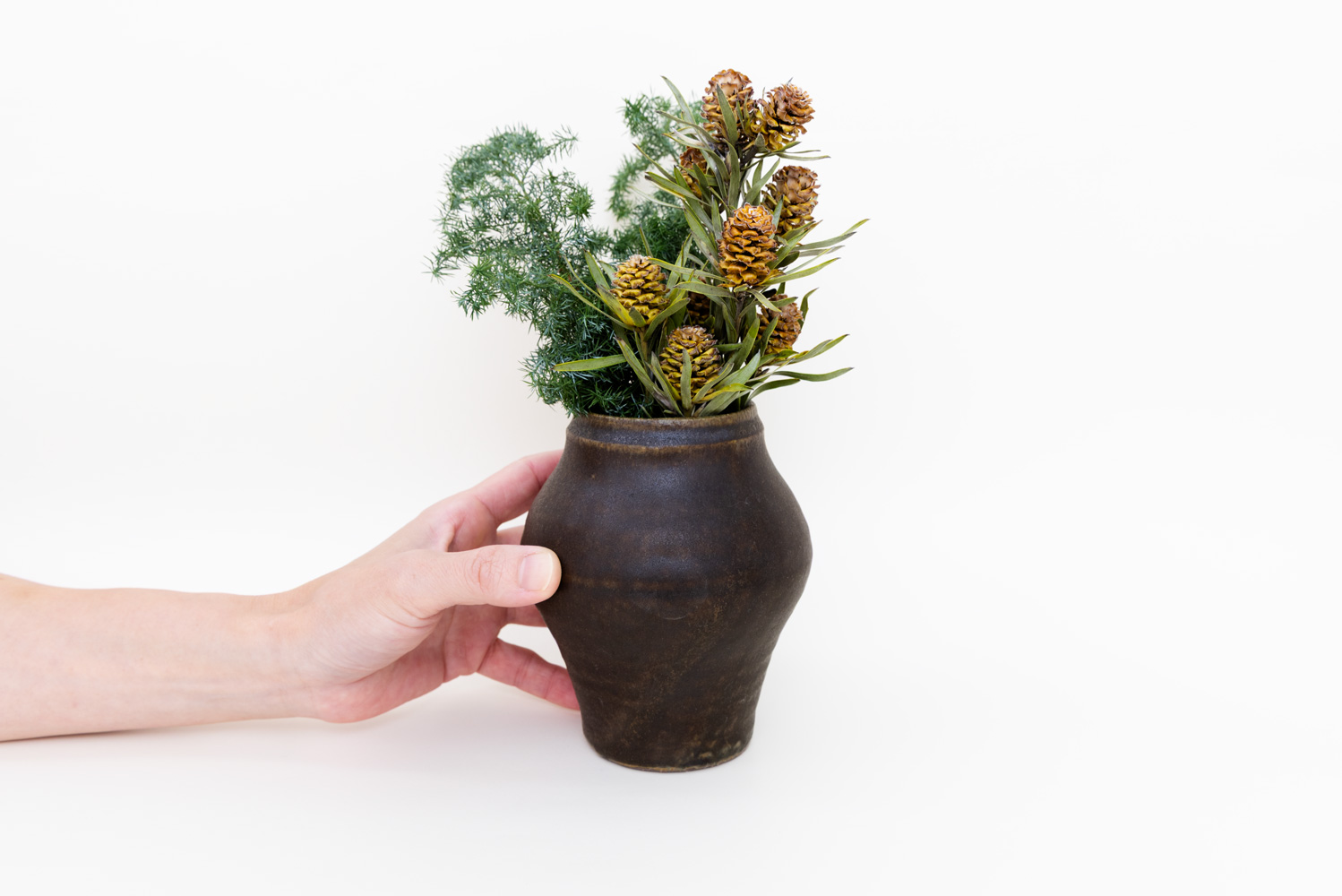 素朴さの中に品のある佇まいが魅力で、野花をさっと生けても、枝ものを合わせても絵になる存在感があります。落ち着いた色味と手しごとの温かみが空間に自然と溶け込み、玄関・リビング・ダイニングなど場所を問わず使いやすいサイズ感です。